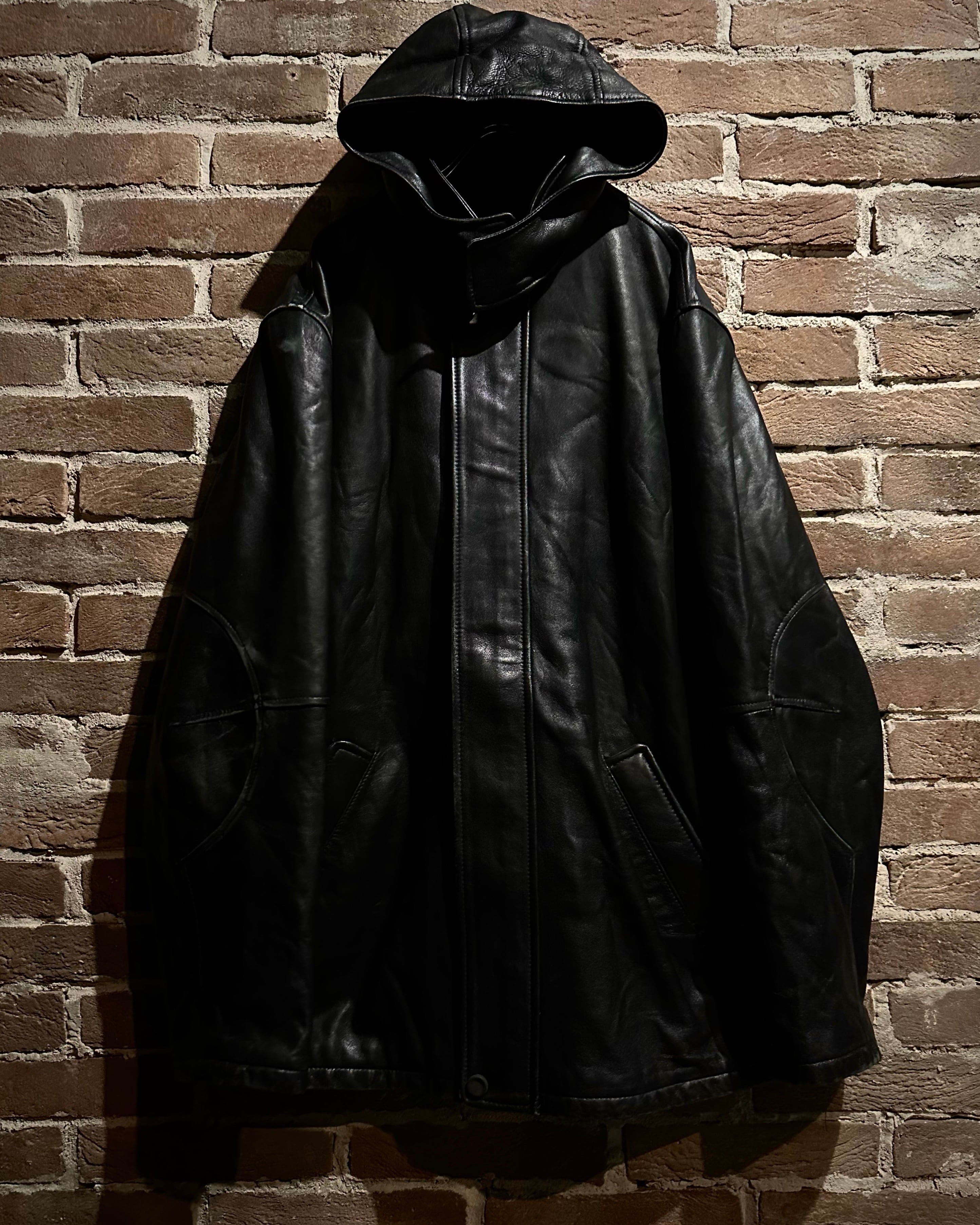 重みのあるブラックレザーを贅沢に使用した、フーデッド仕様のレザージャケット。