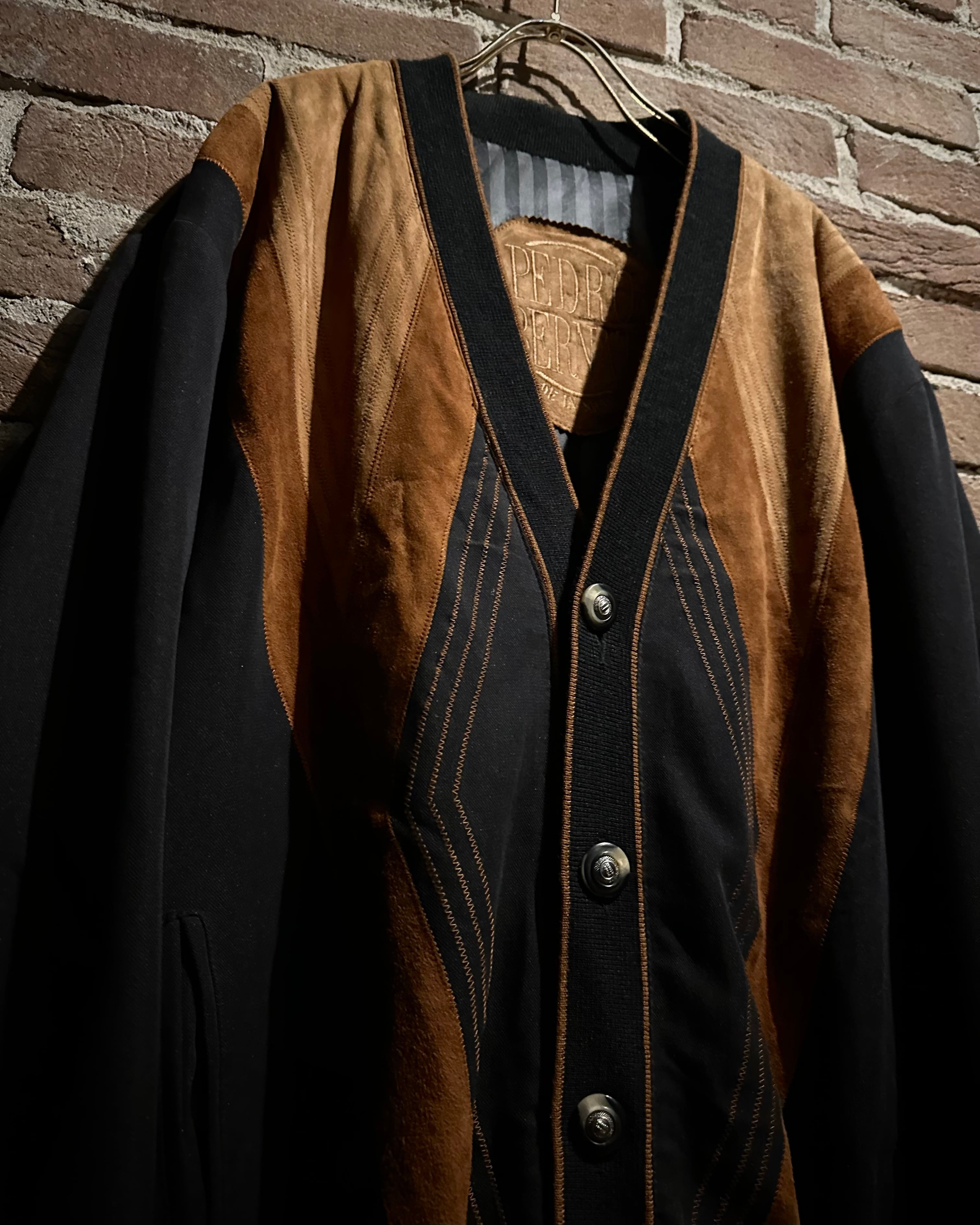 フロントにキャメル×ベージュのスエードレザーを大胆に切り替えた、存在感抜群のスペイン製カーディガンジャケット。