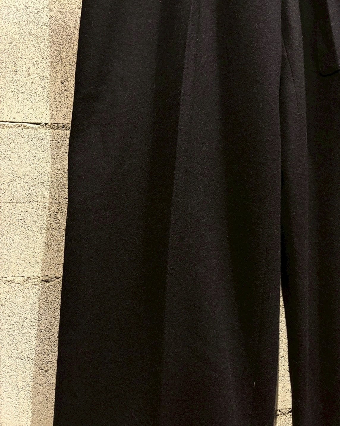 太めのワタリからストンと落ちるシルエットは粗野な表情を持ちながら、ブラックという色が加わることで一気に洗練された印象へと昇華しています。