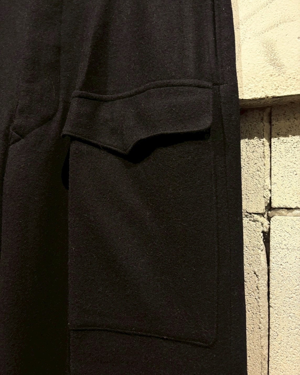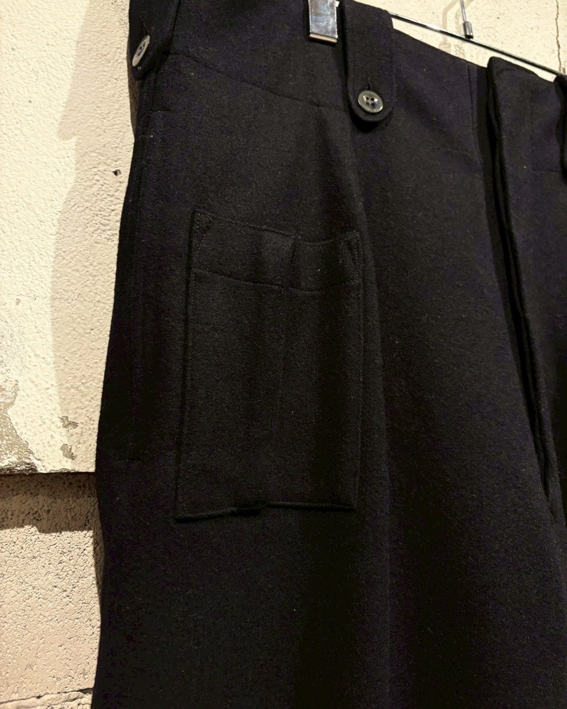 ぎゅっと目の詰まったウール生地が生むドレープと、無駄のない直線的なライン。フロントのフラップポケットにサイドのパッチポケット、ボタンフライなどのディテールも◎