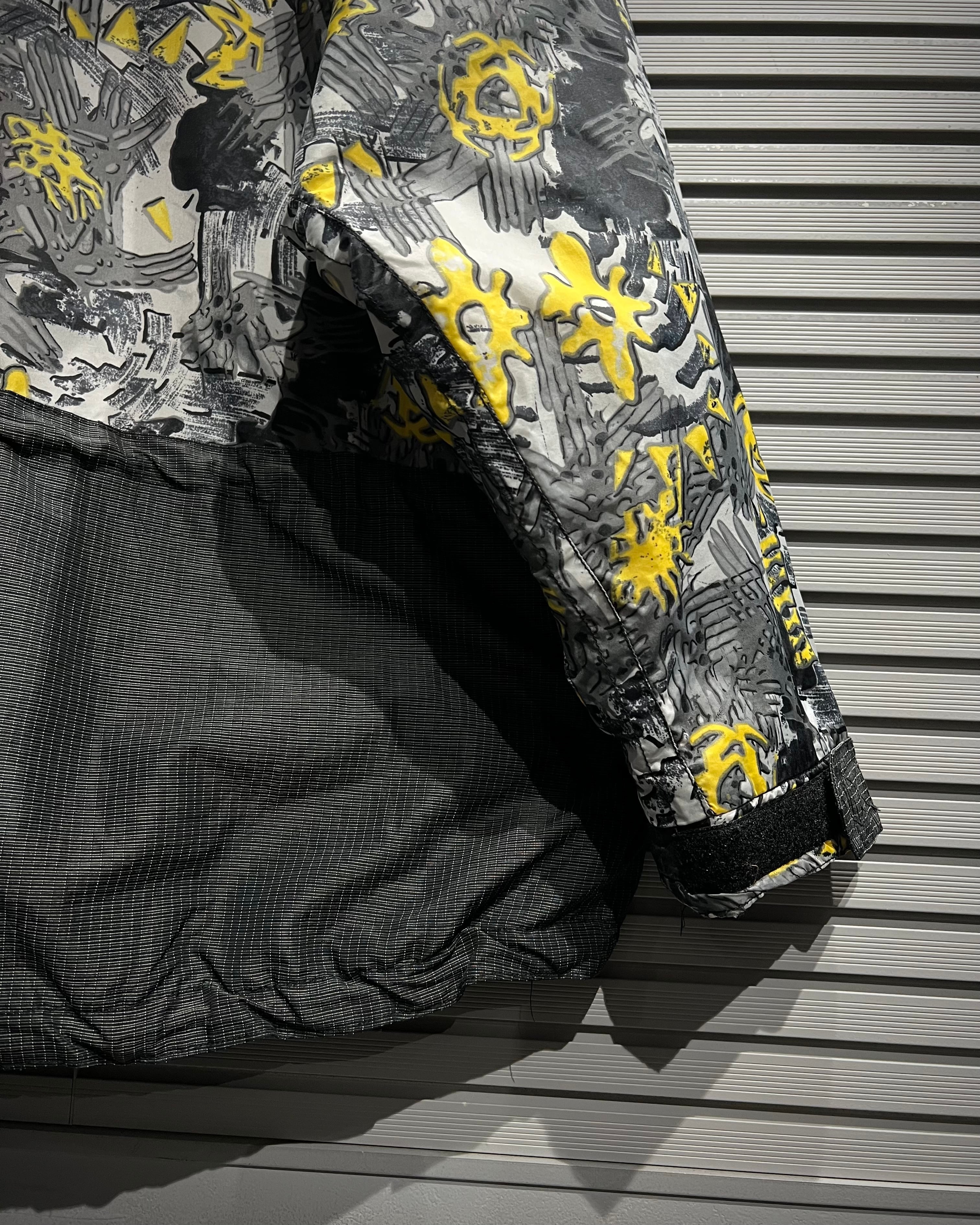 一面に広がる抽象的なグラフィックは、ストリートの空気感とカルチャーの匂いが混ざり合ったような唯一無二の表情。遠目でも目を引くカラーコントラストで、アウターとしての説得力が段違いです。