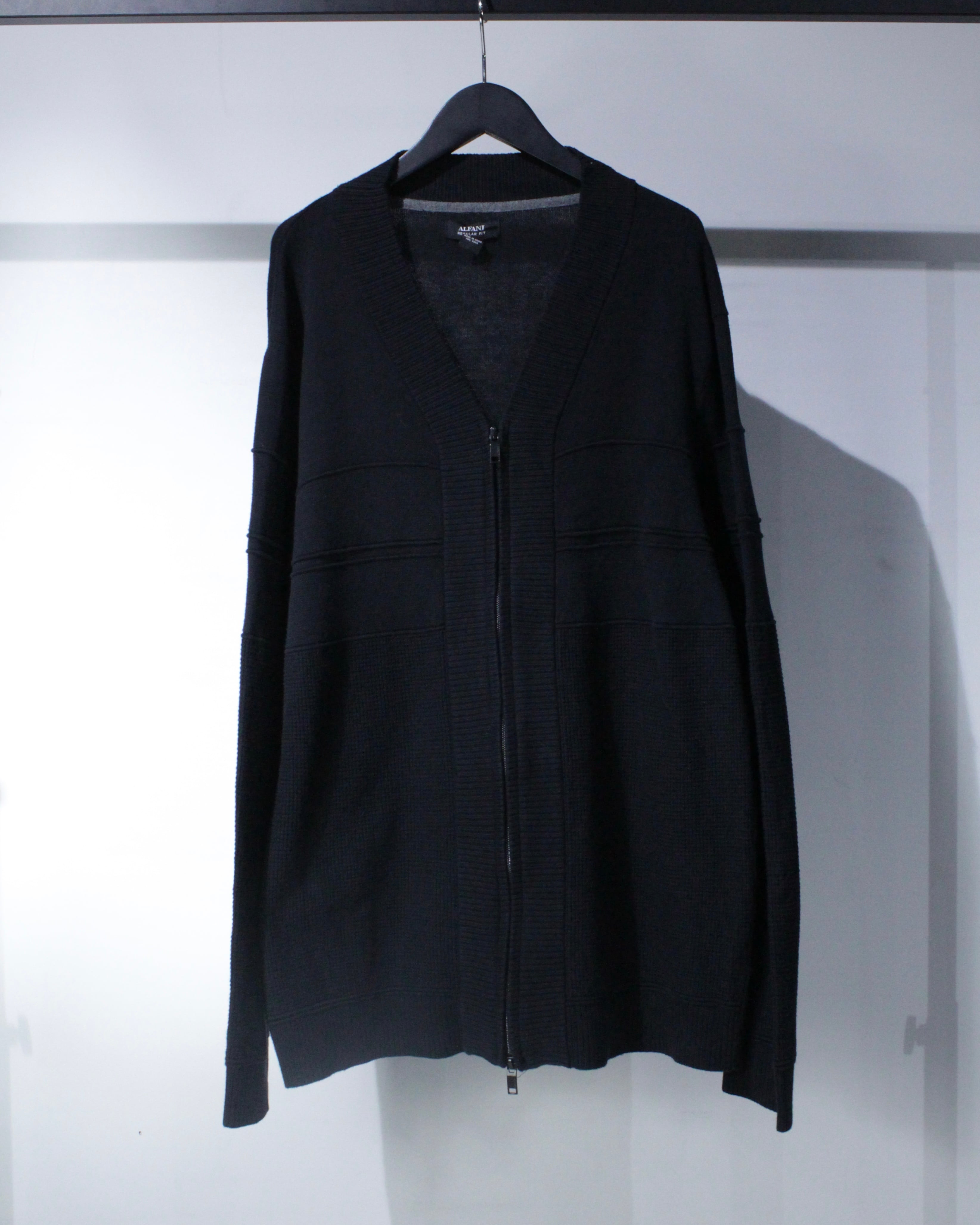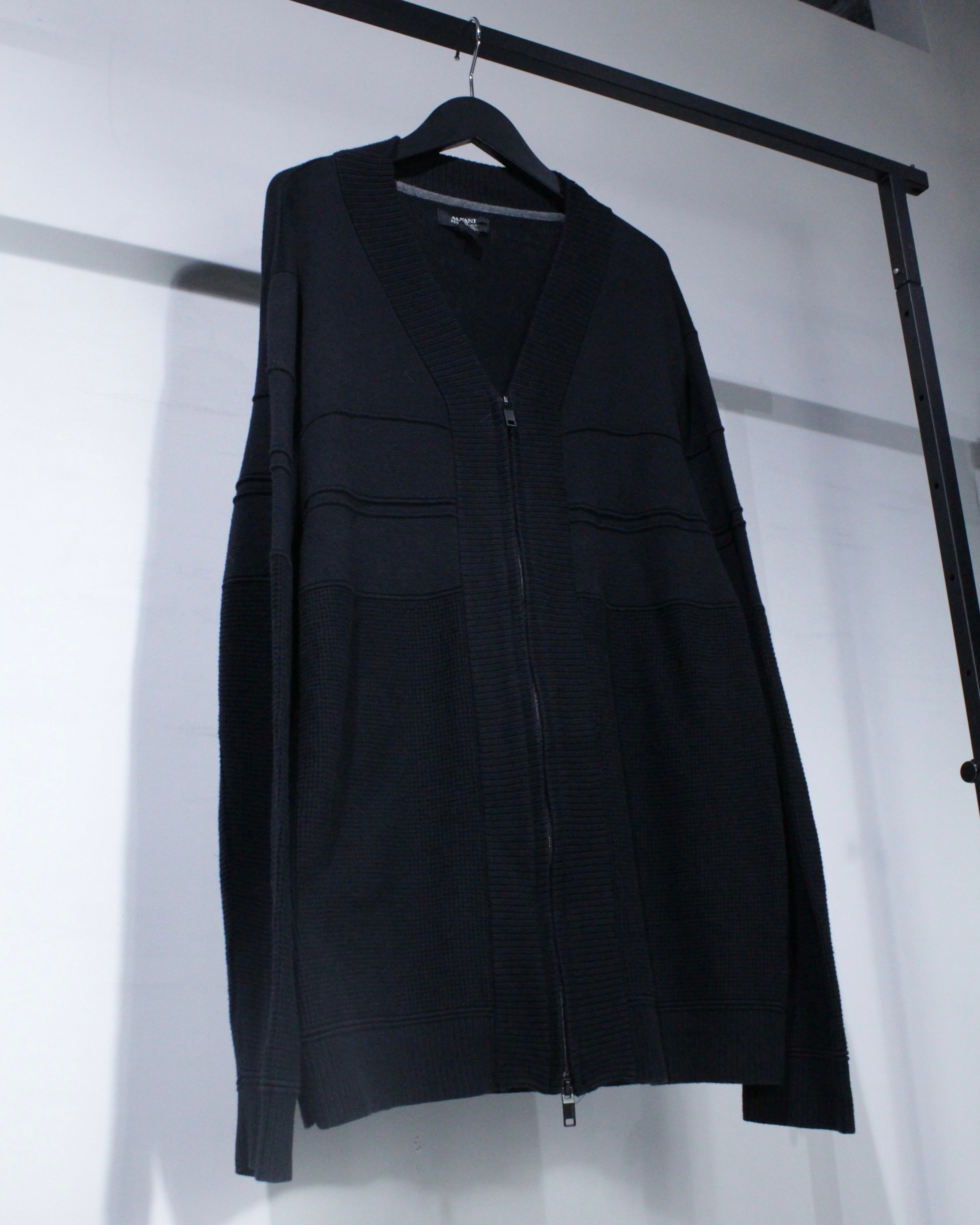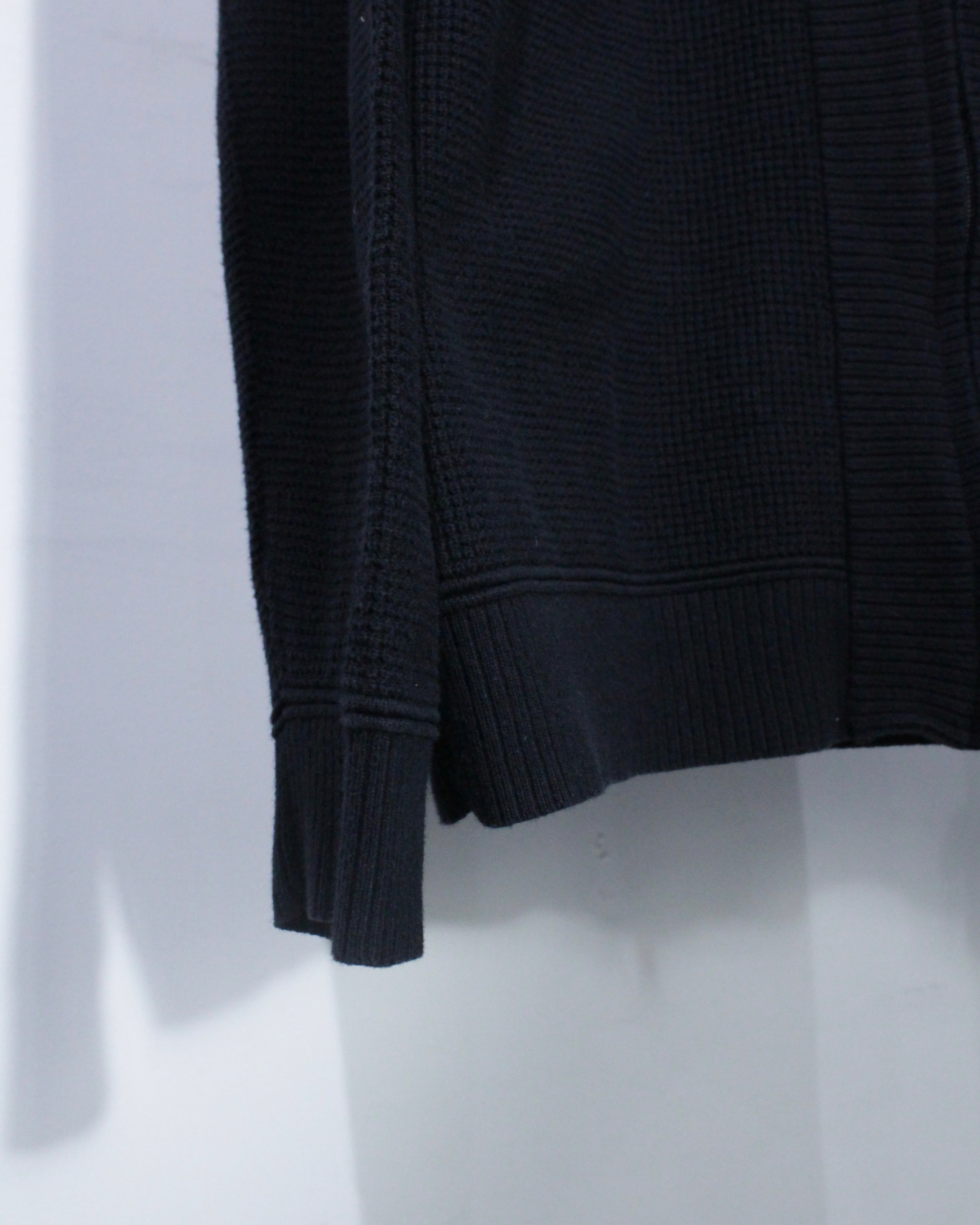深みのあるブラックをベースに、編地の切り替えと立体的なパターンワークで仕上げられたジップアップニットカーディガン。