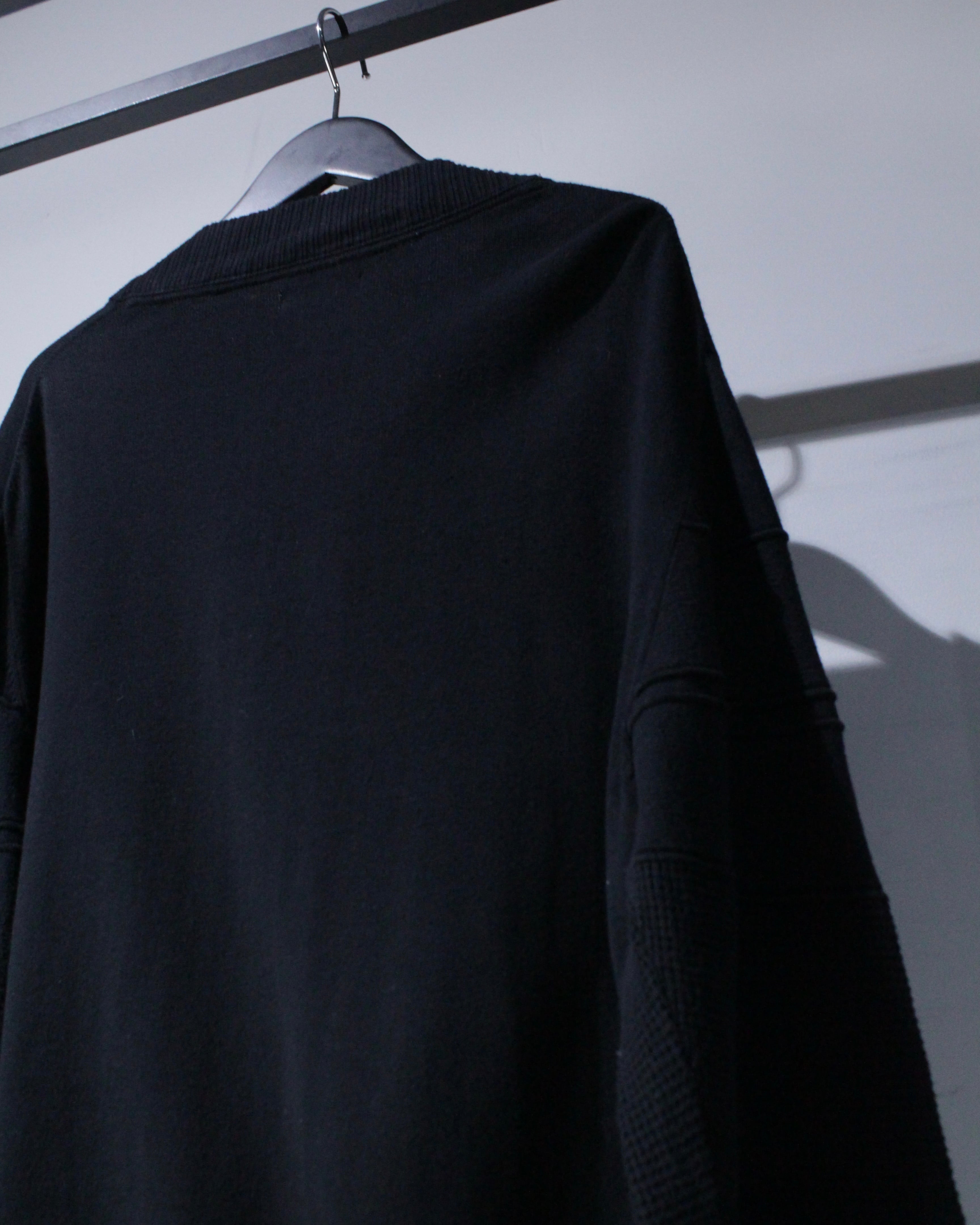 ミニマルながら存在感のあるデザインで、同色ながら陰影を生み、シンプルなブラックニットとは一線を画す佇まいに。