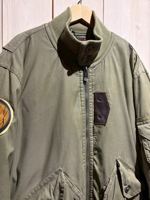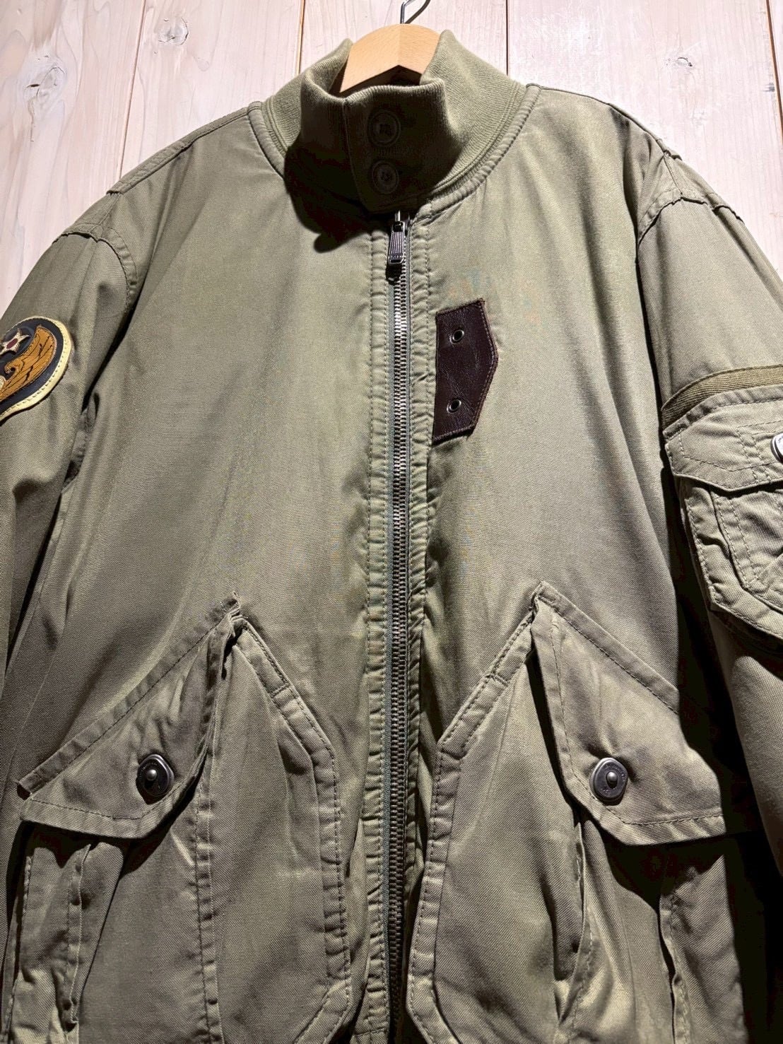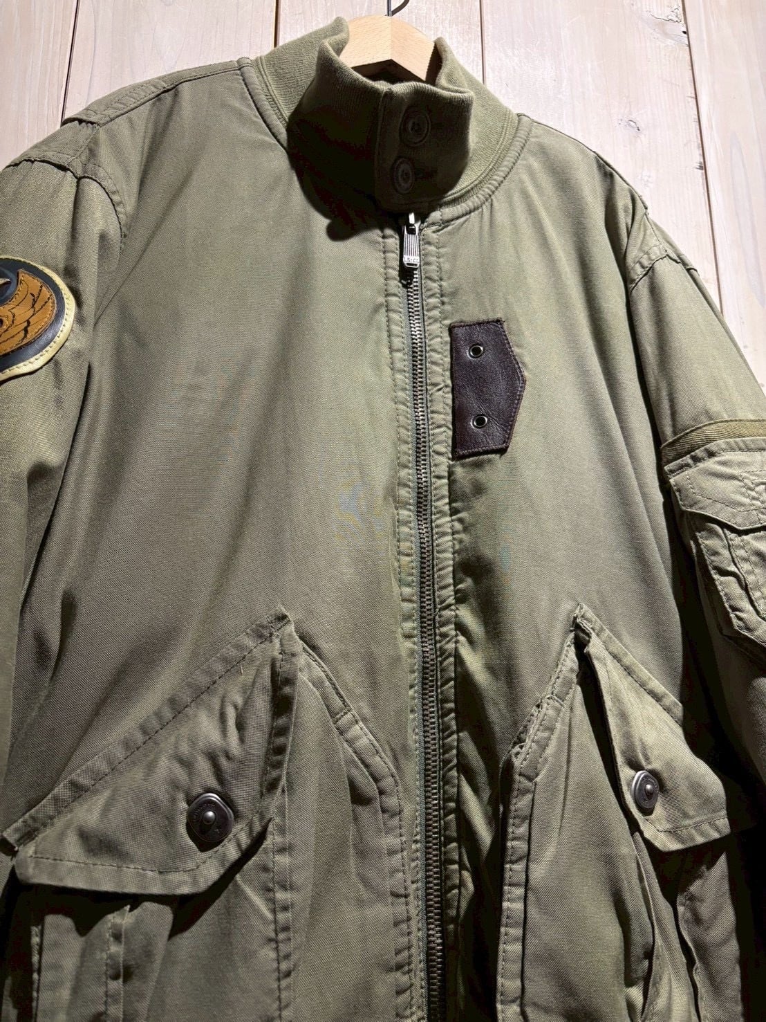 セージグリーンのボディをベースに、フライトジャケットを彷彿とさせる大ぶりなポケット、ユーティリティポケットをON。右腕にはワッペンを載せ、無骨なデザインに仕上げた逸品。