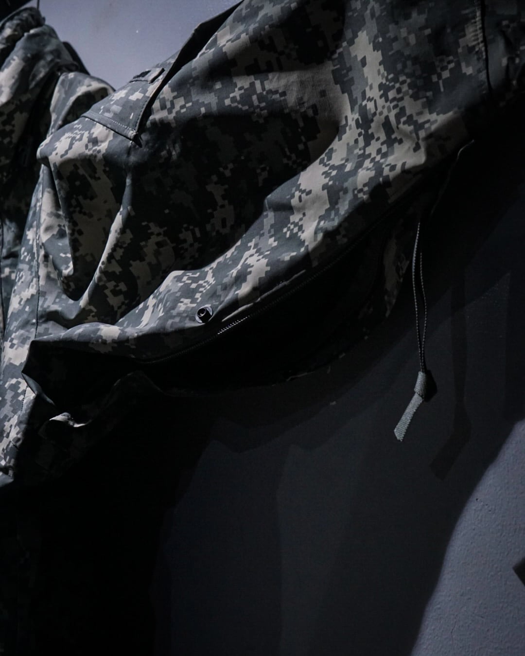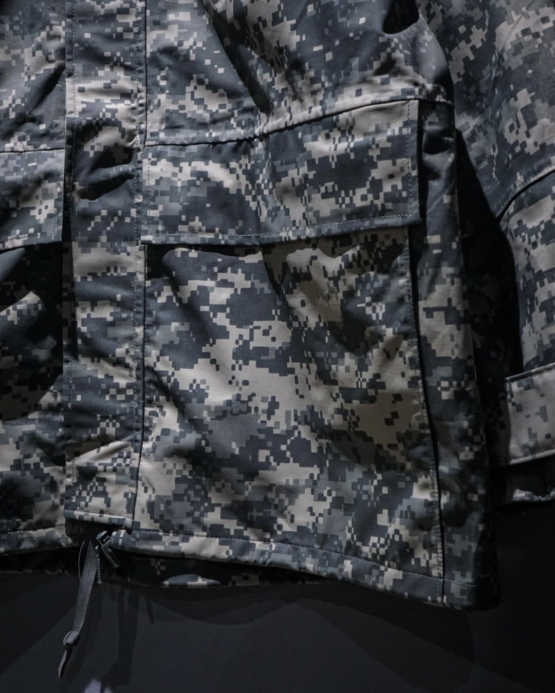 シェルにはGORE-TEXを採用し、高い防風性、防水性、透湿性を兼ね備えた本格仕様。ハリのあるナイロンシェルに、デジタルカモフラージュが落とし込まれ、ミリタリ〜の機能美と無骨な存在感が際立ちます。