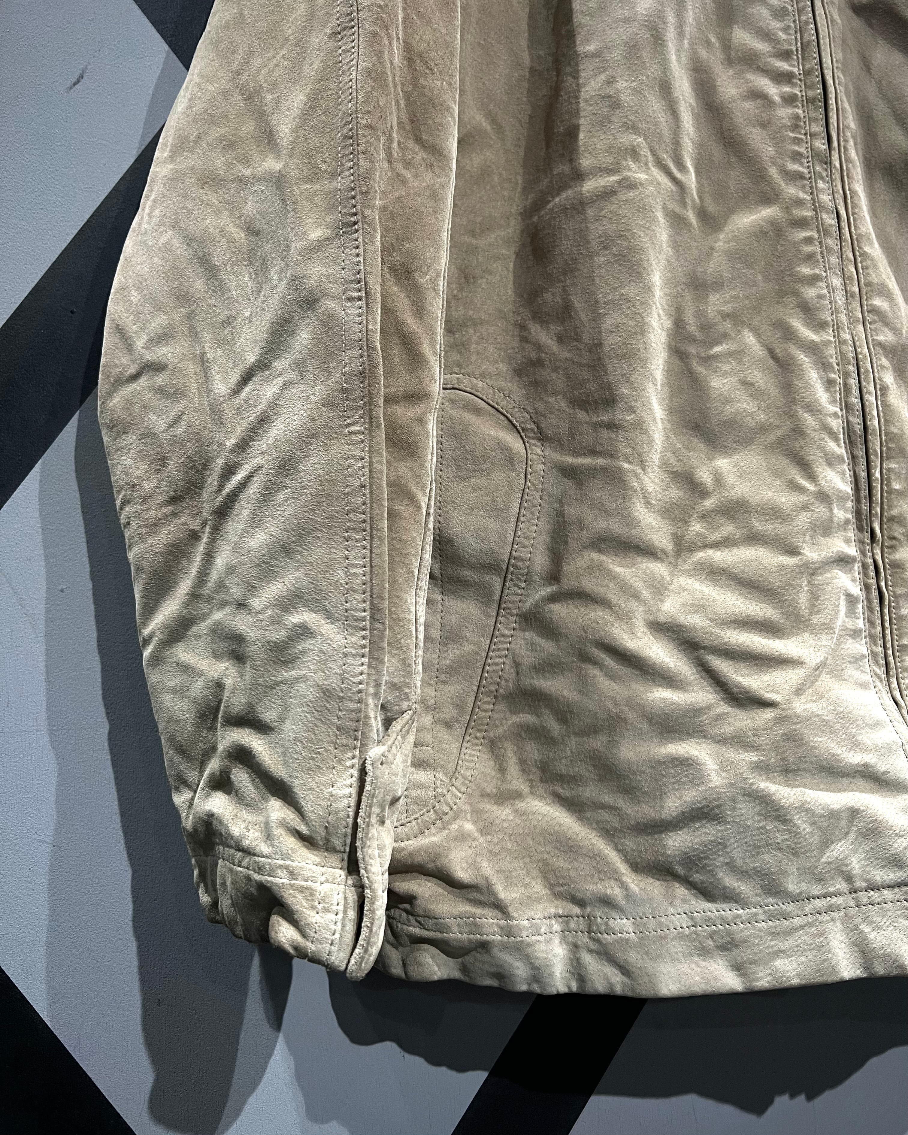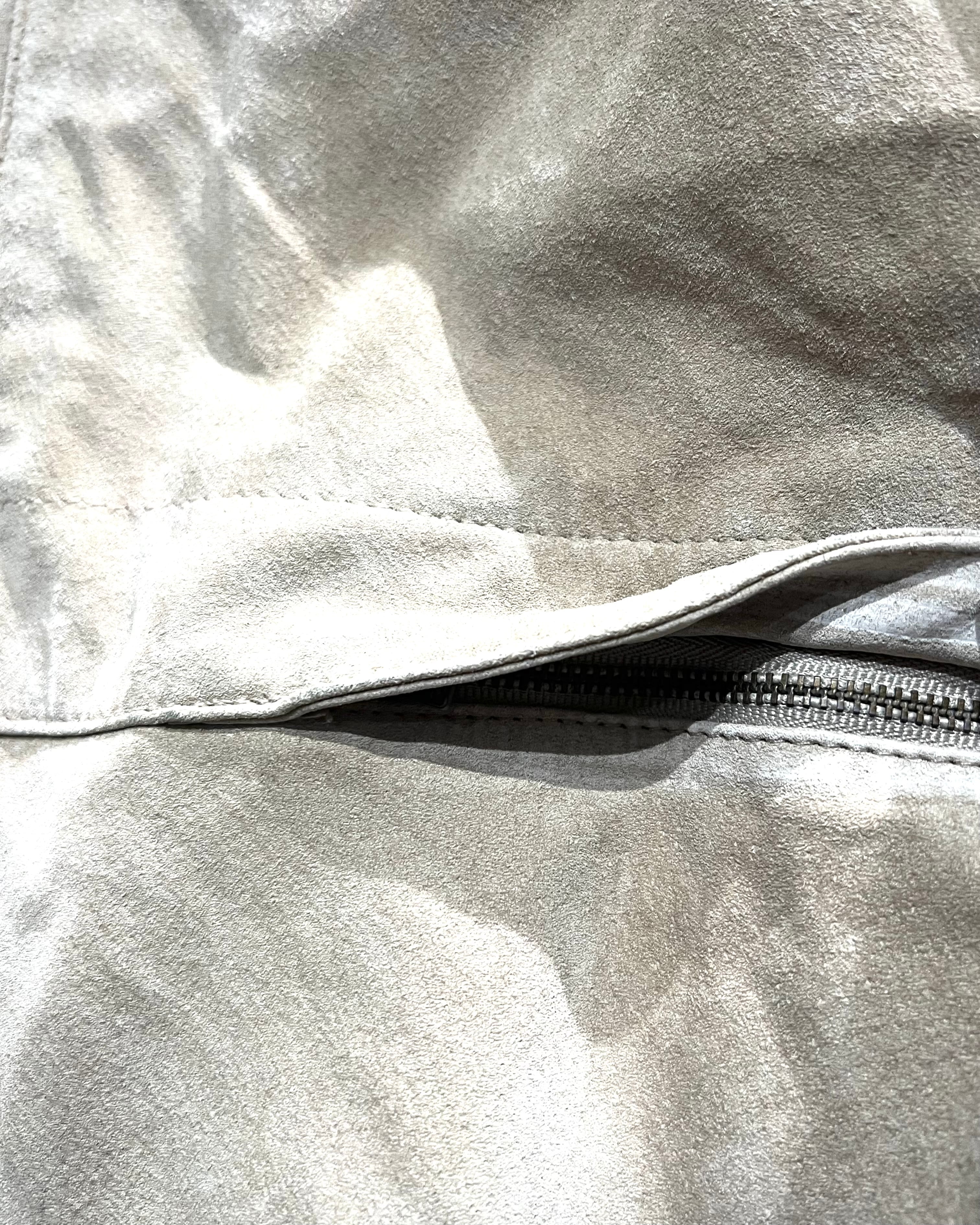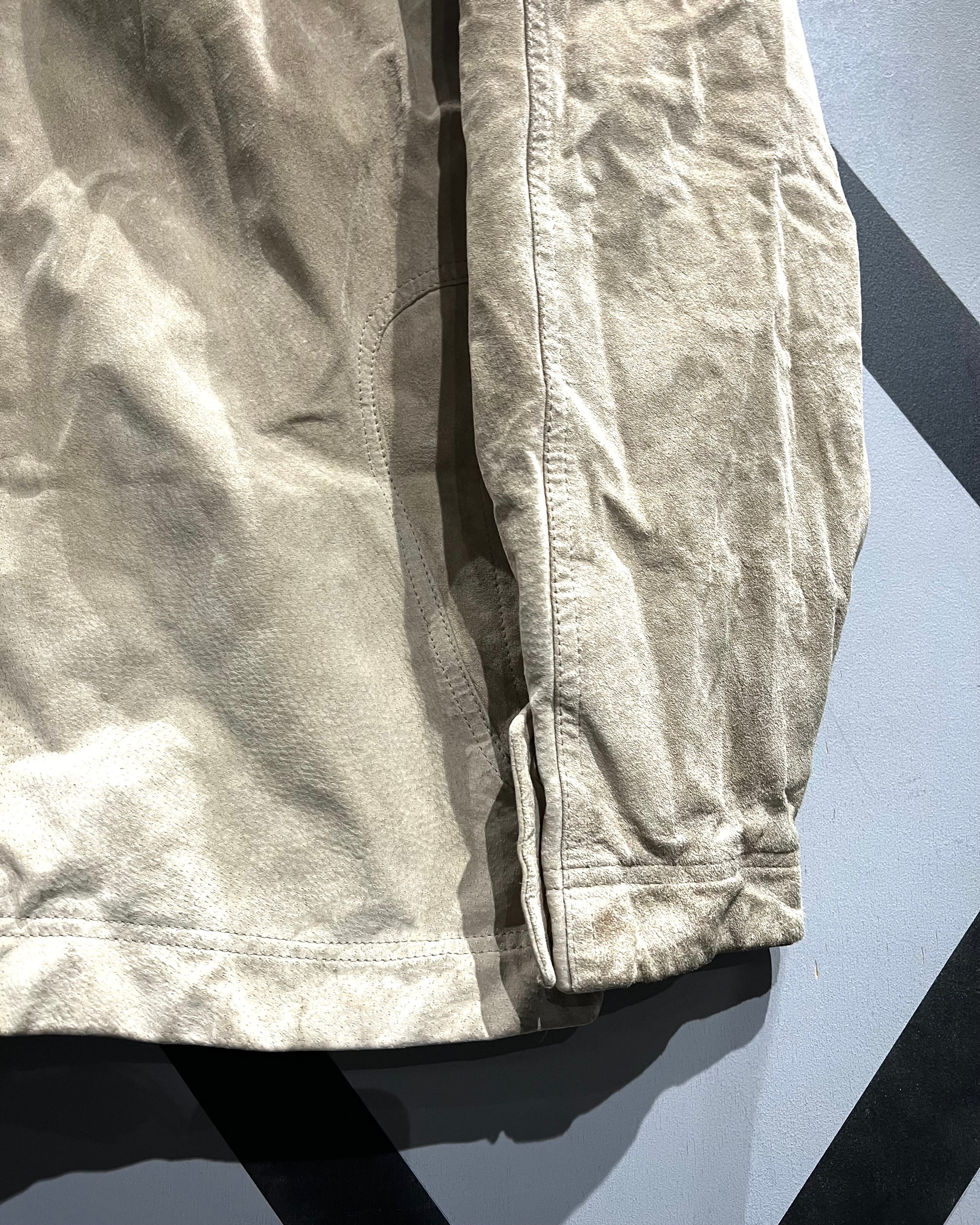 ボディにはスエードレザーを使用し、しっとりとした質感と着用を重ねて生まれたシワや色ムラが、レザー特有の奥行きを感じさせます。ベージュトーンの柔らかな色味も相まって、ハードすぎない表情に。