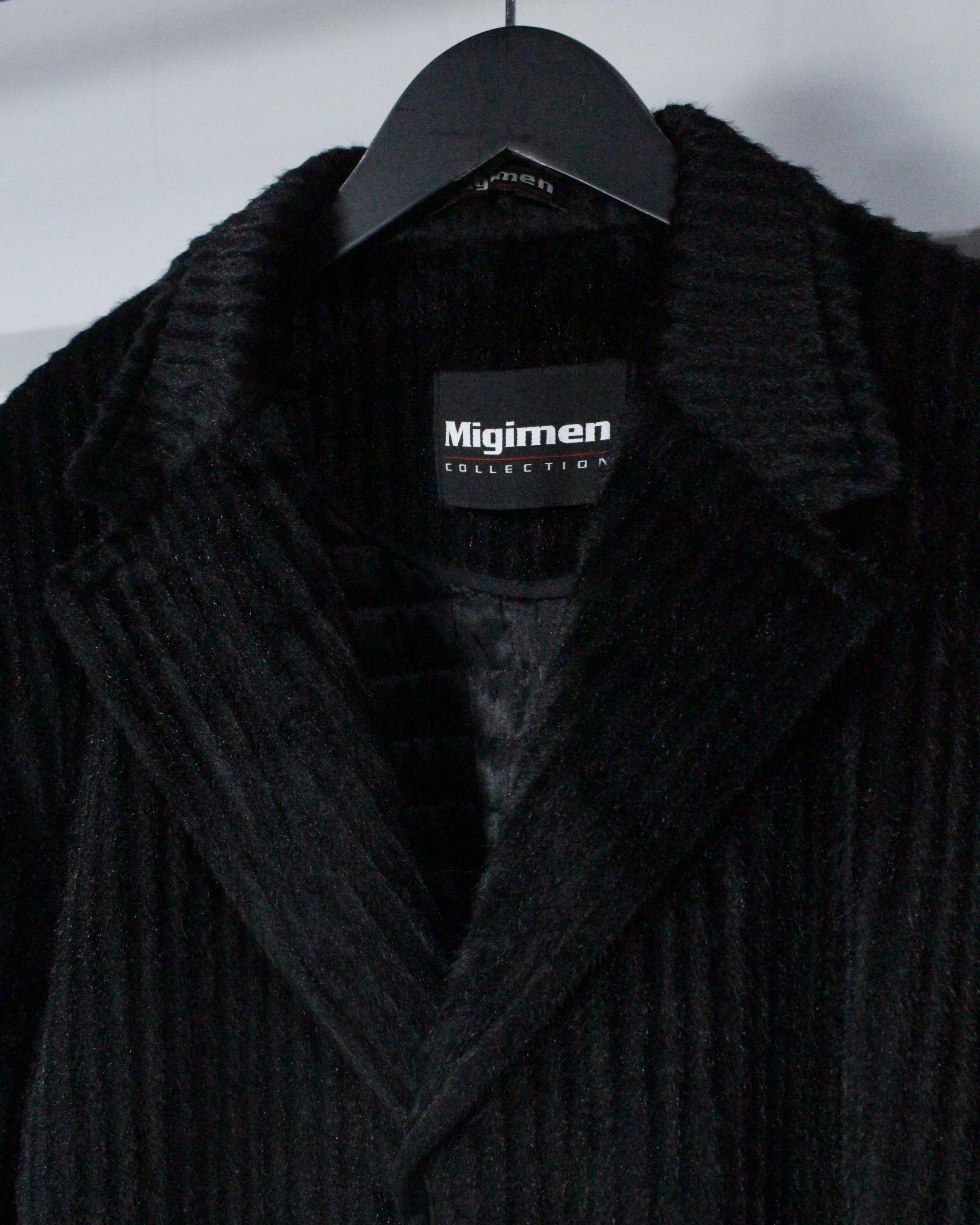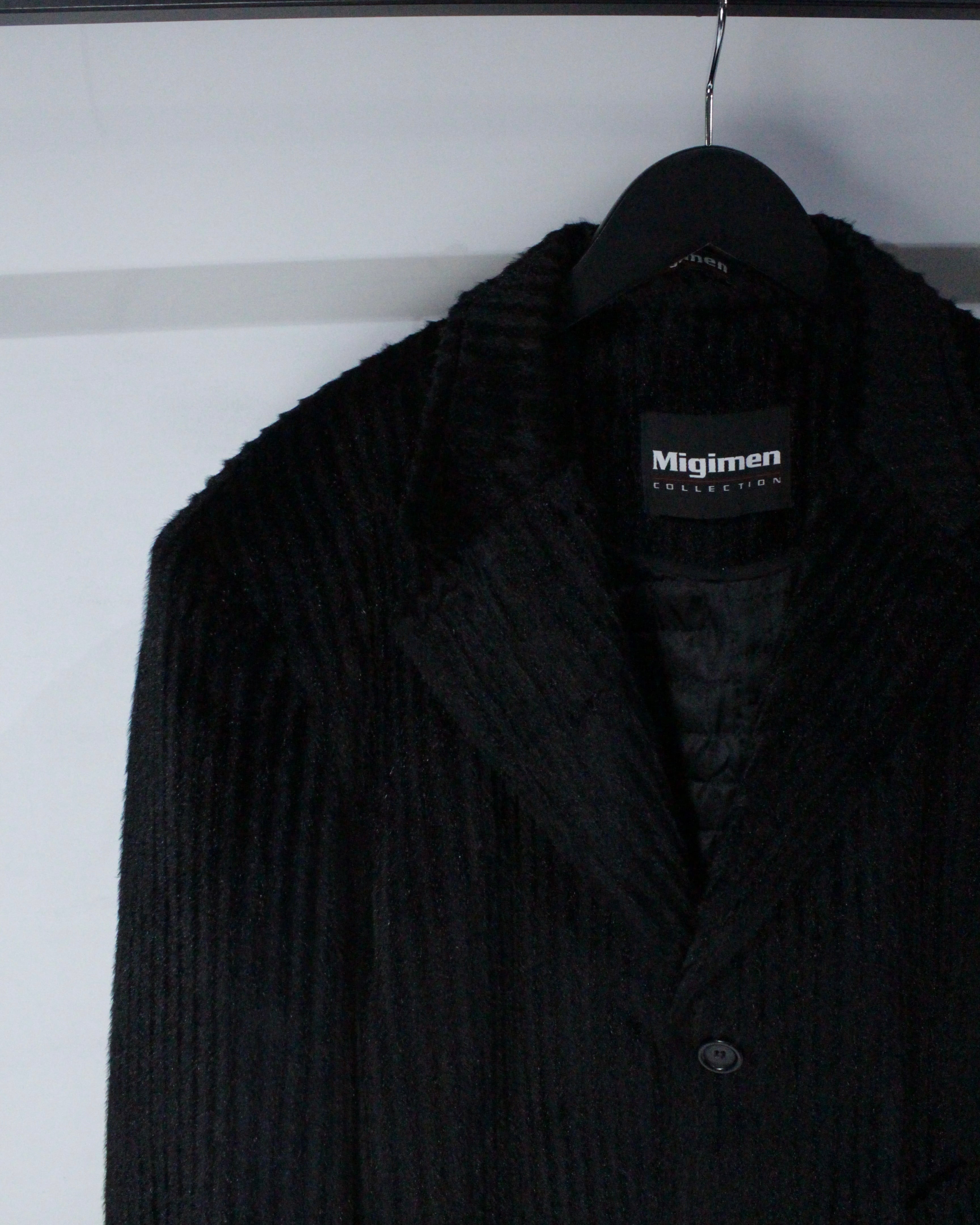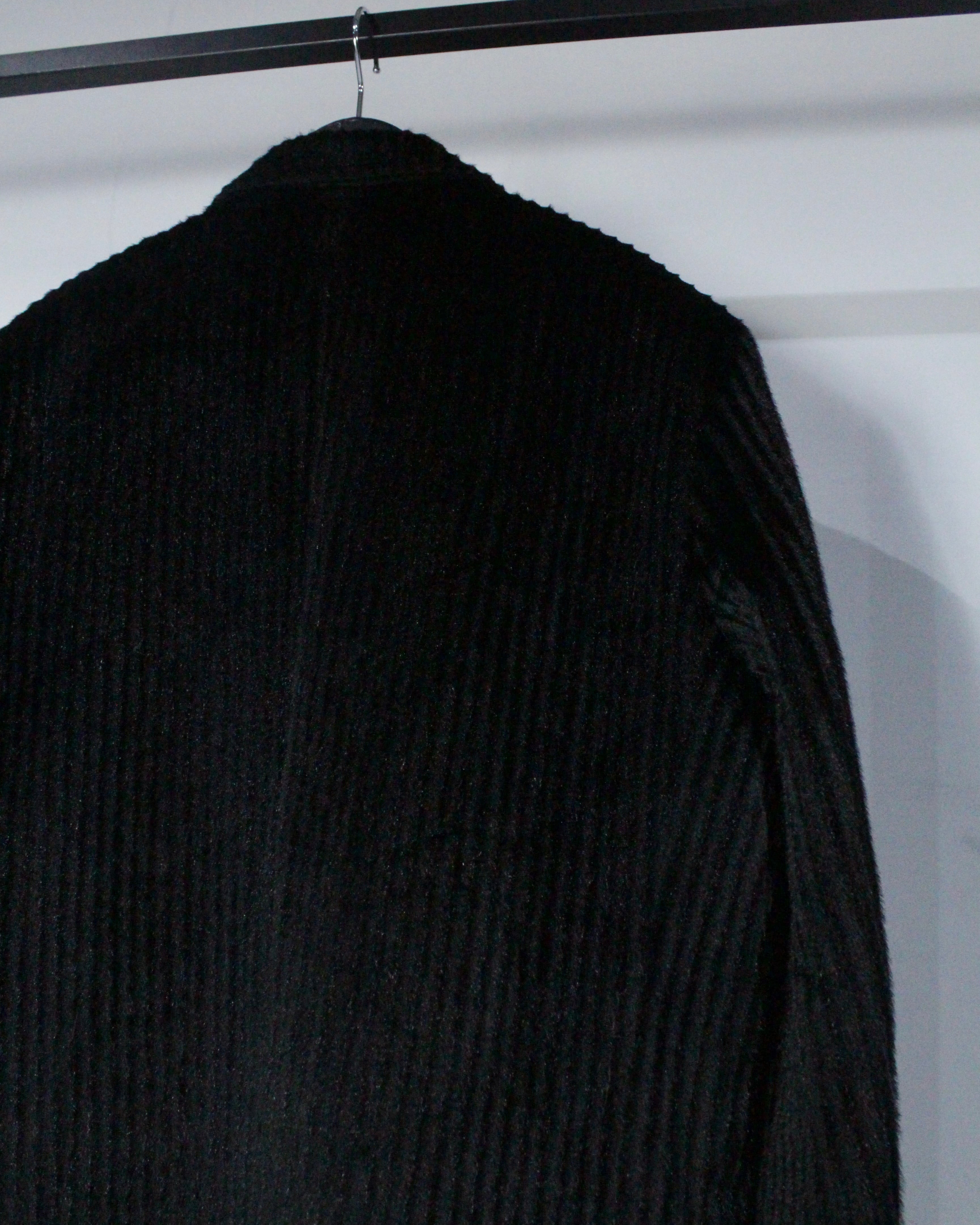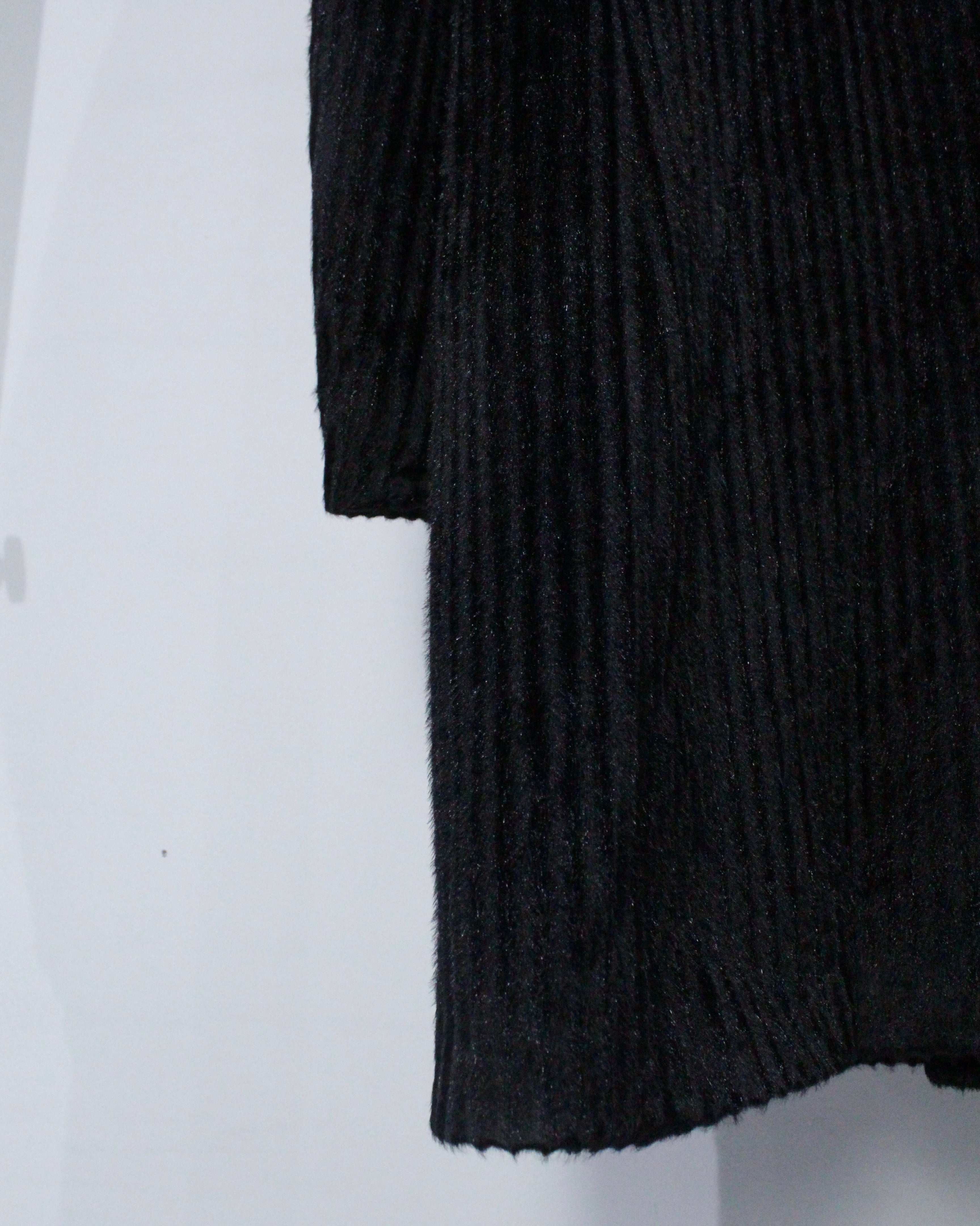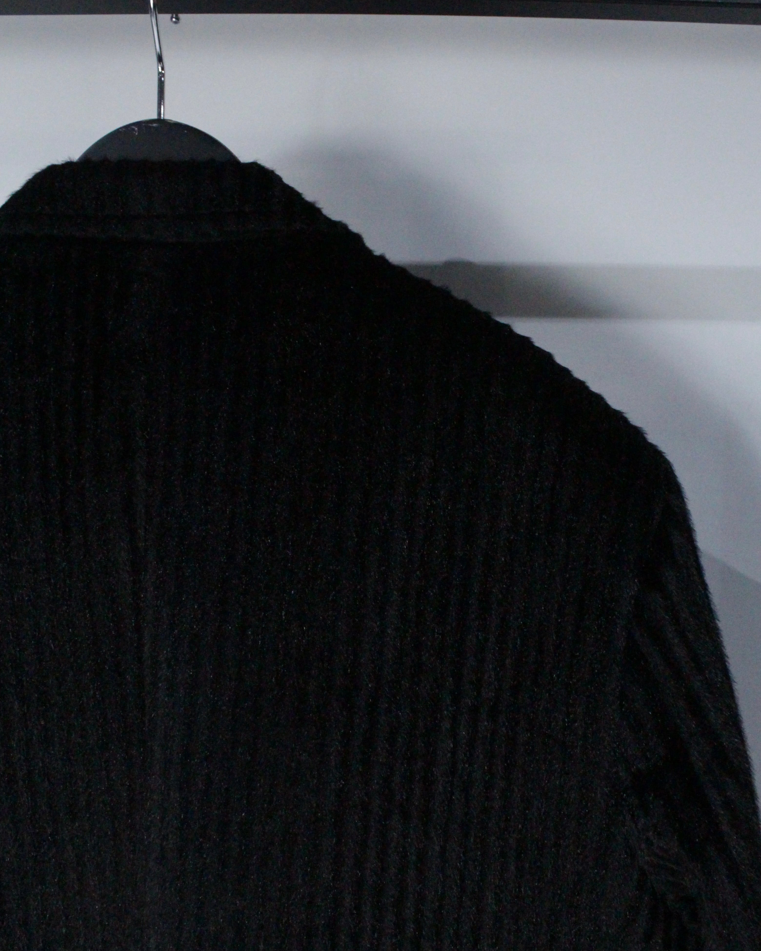 一見するとオールブラックのミニマルな佇まいですが、近くで見ると縦に走る独特な凹凸のある生地表情が際立ちます。光の当たり方によって陰影が生まれ、単色ながらも奥行きのある見え方に。