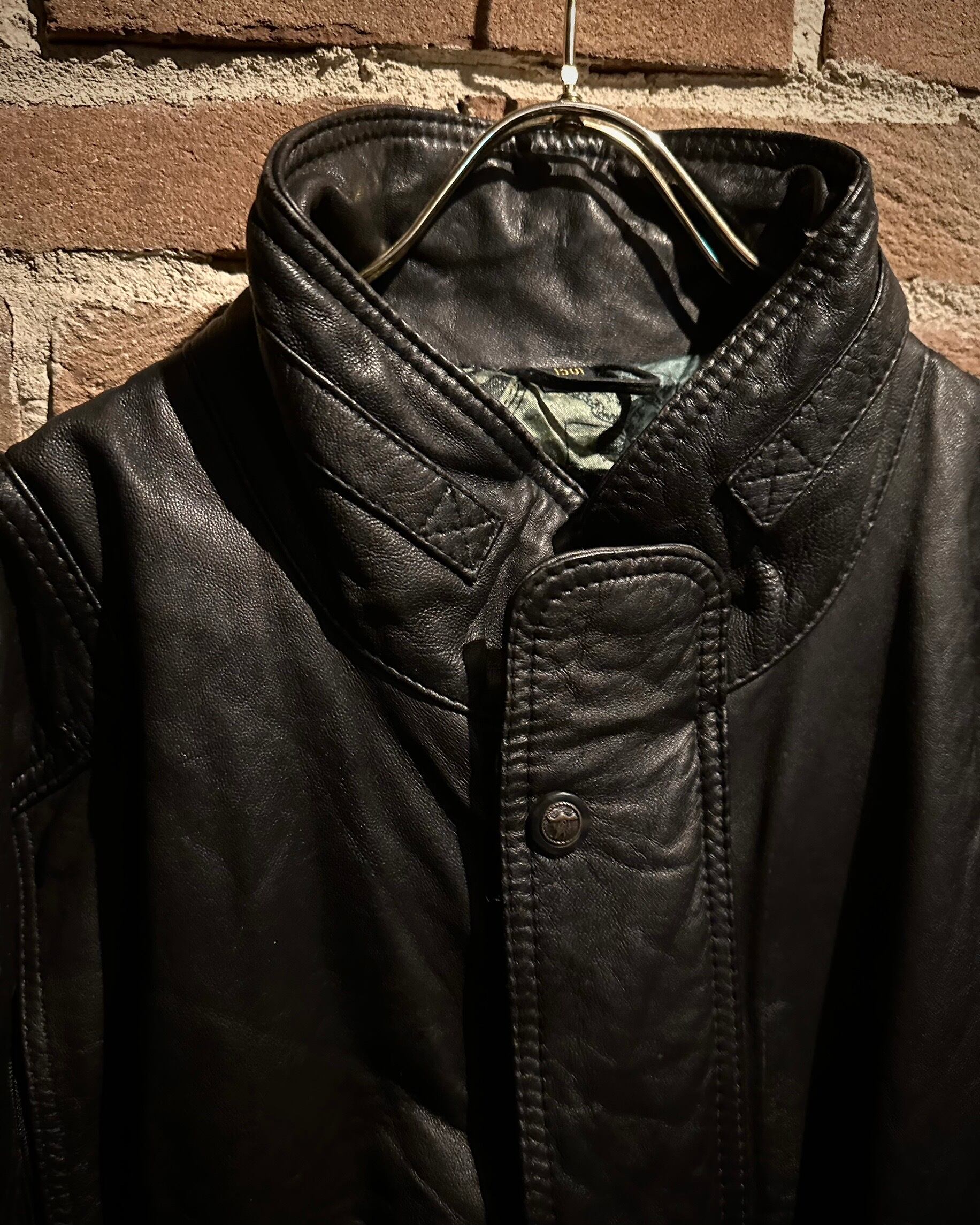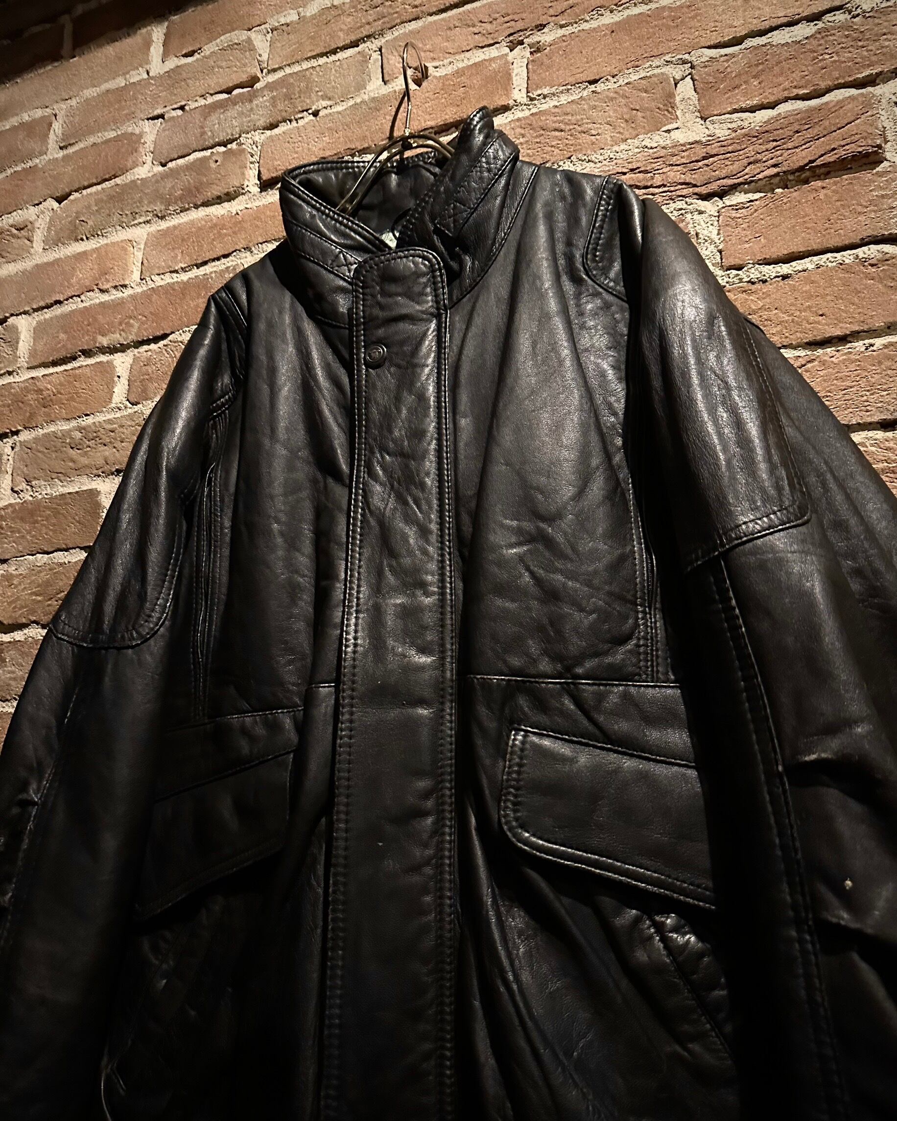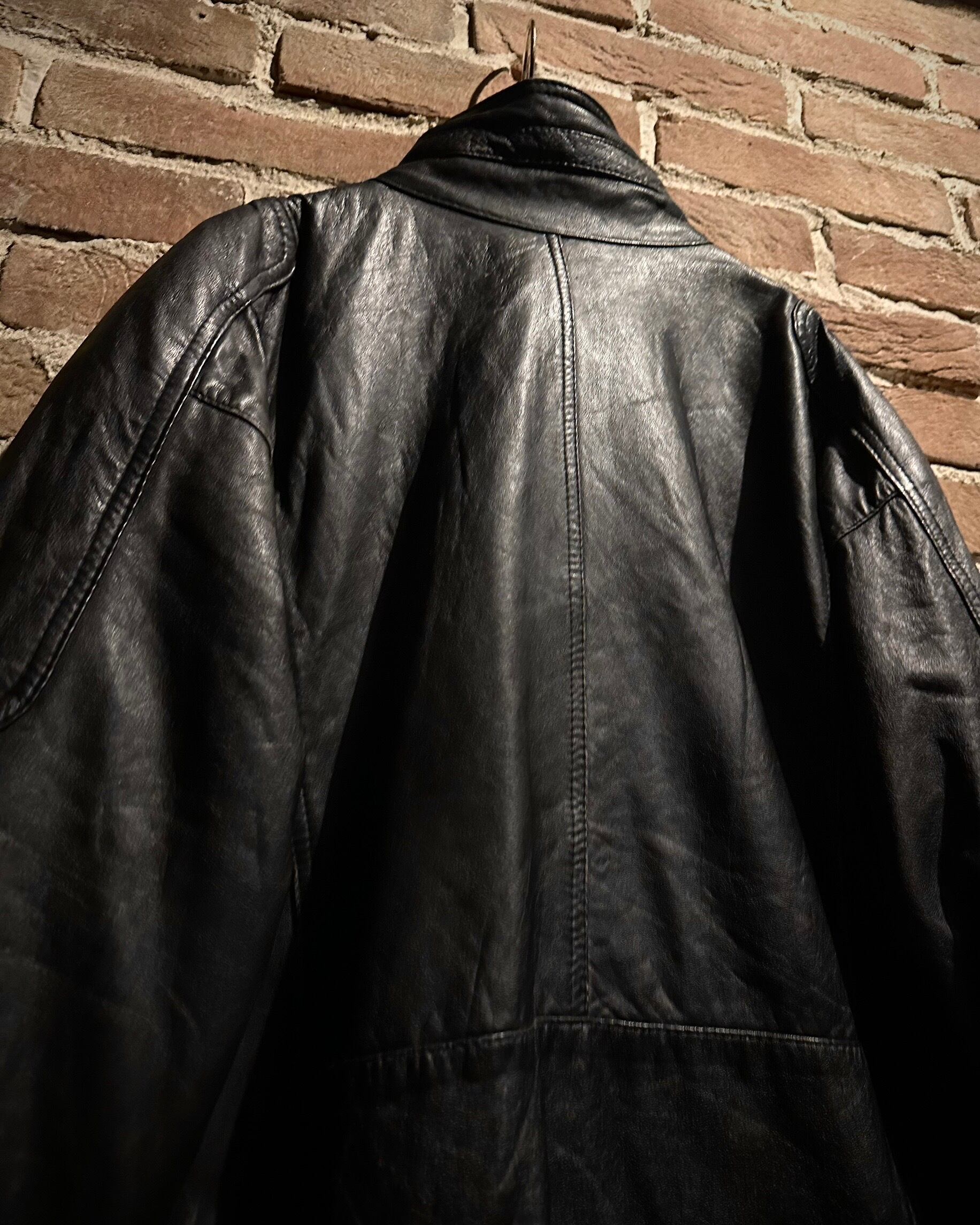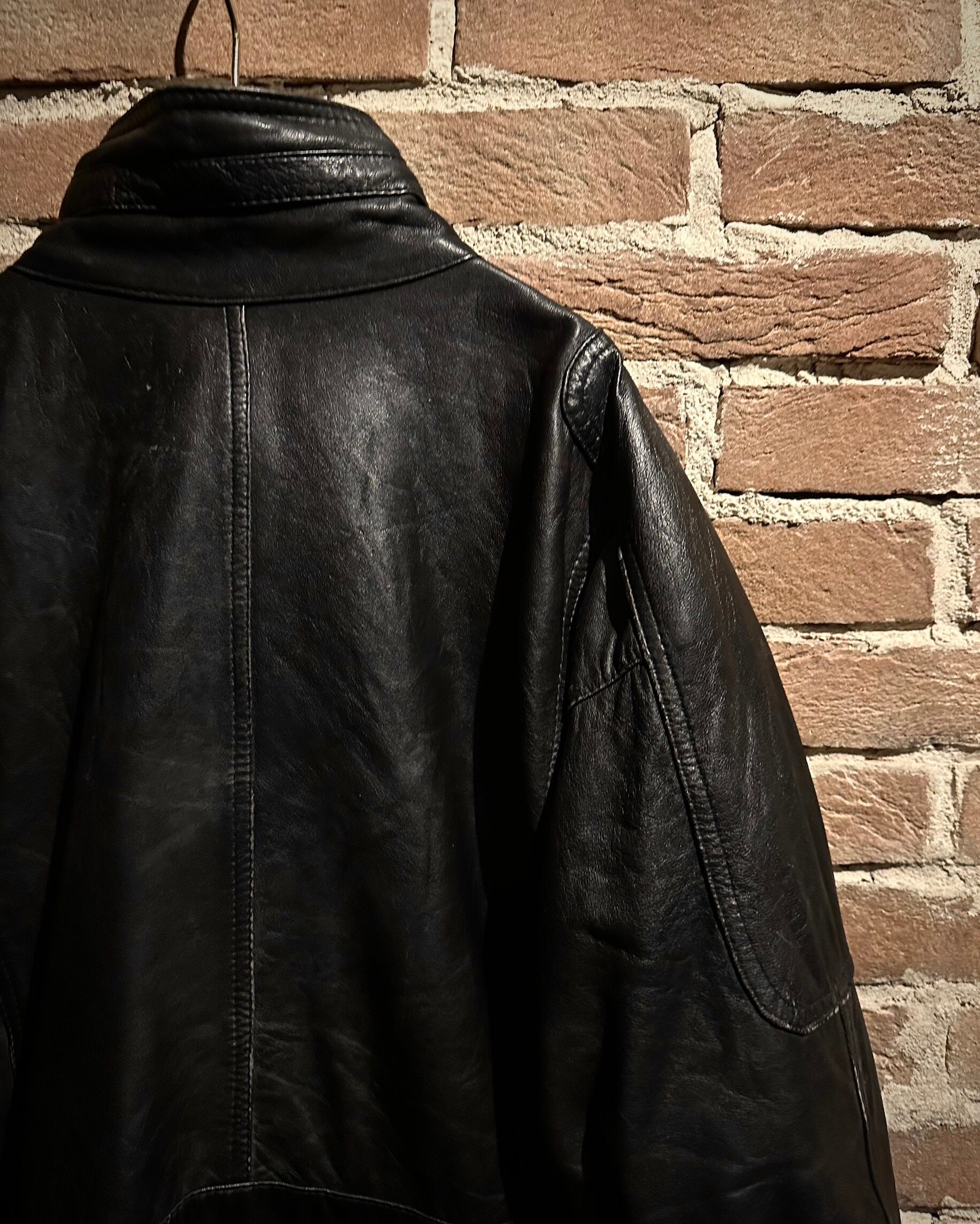 鈍い光沢を放つブラックレザーをベースに、ミリタリー由来の無骨な佇まいをしっかりと踏襲。ハンドウォーマー付きのフラップポケット、アームのアクションプリーツ、比翼仕立てのフロント、肩の切り替えなど、細部まで作り込まれたディテールが魅力です。