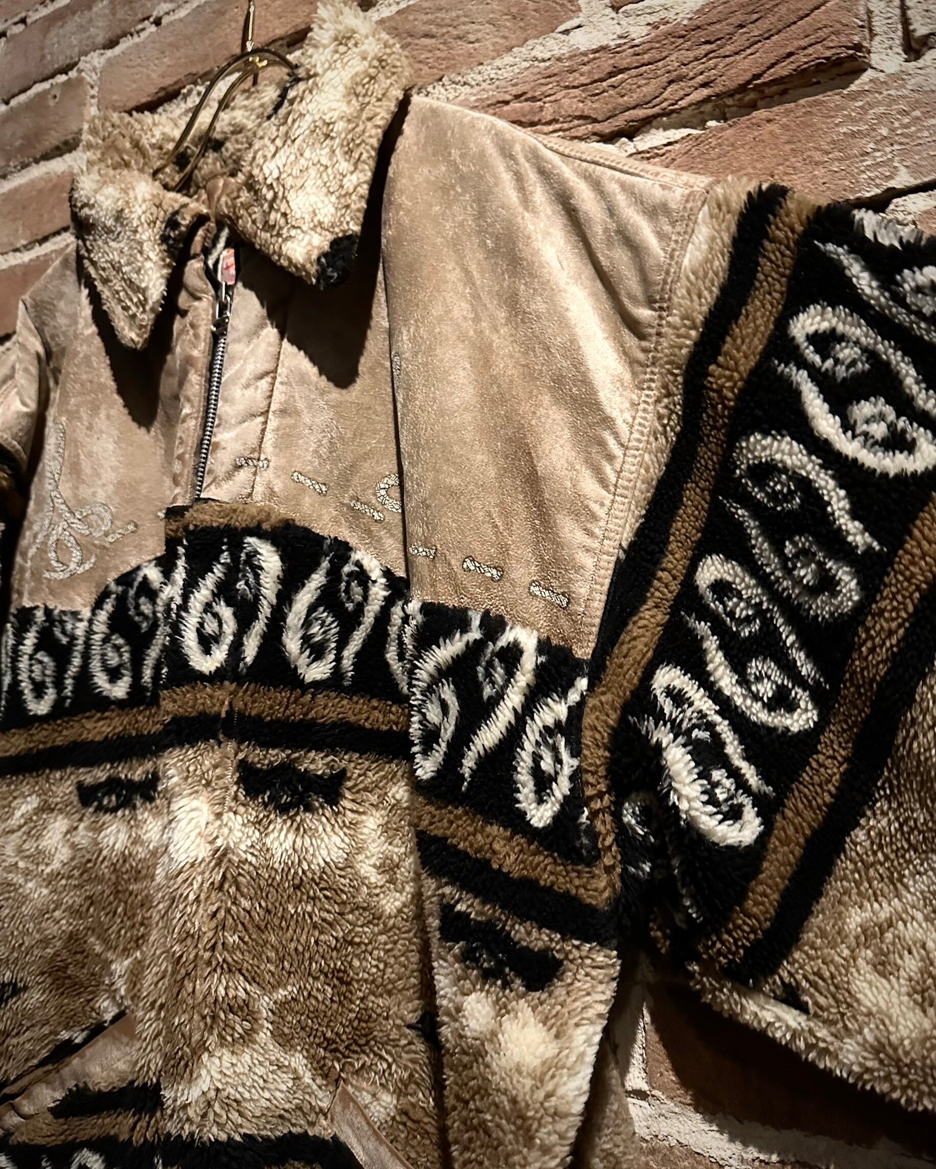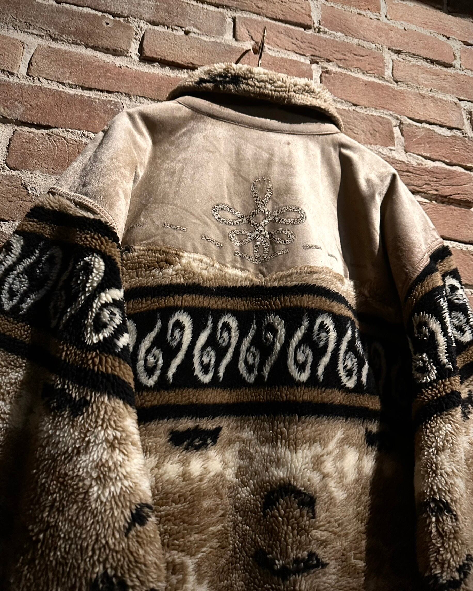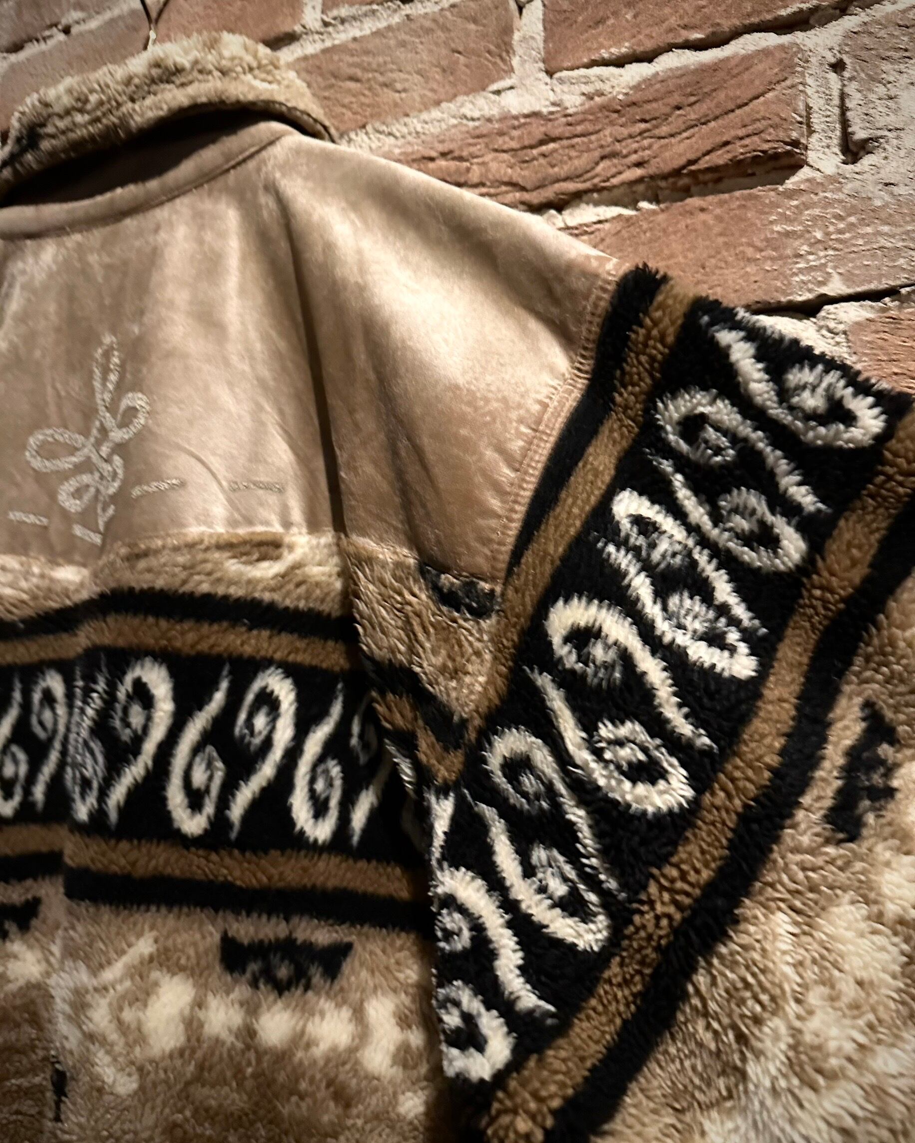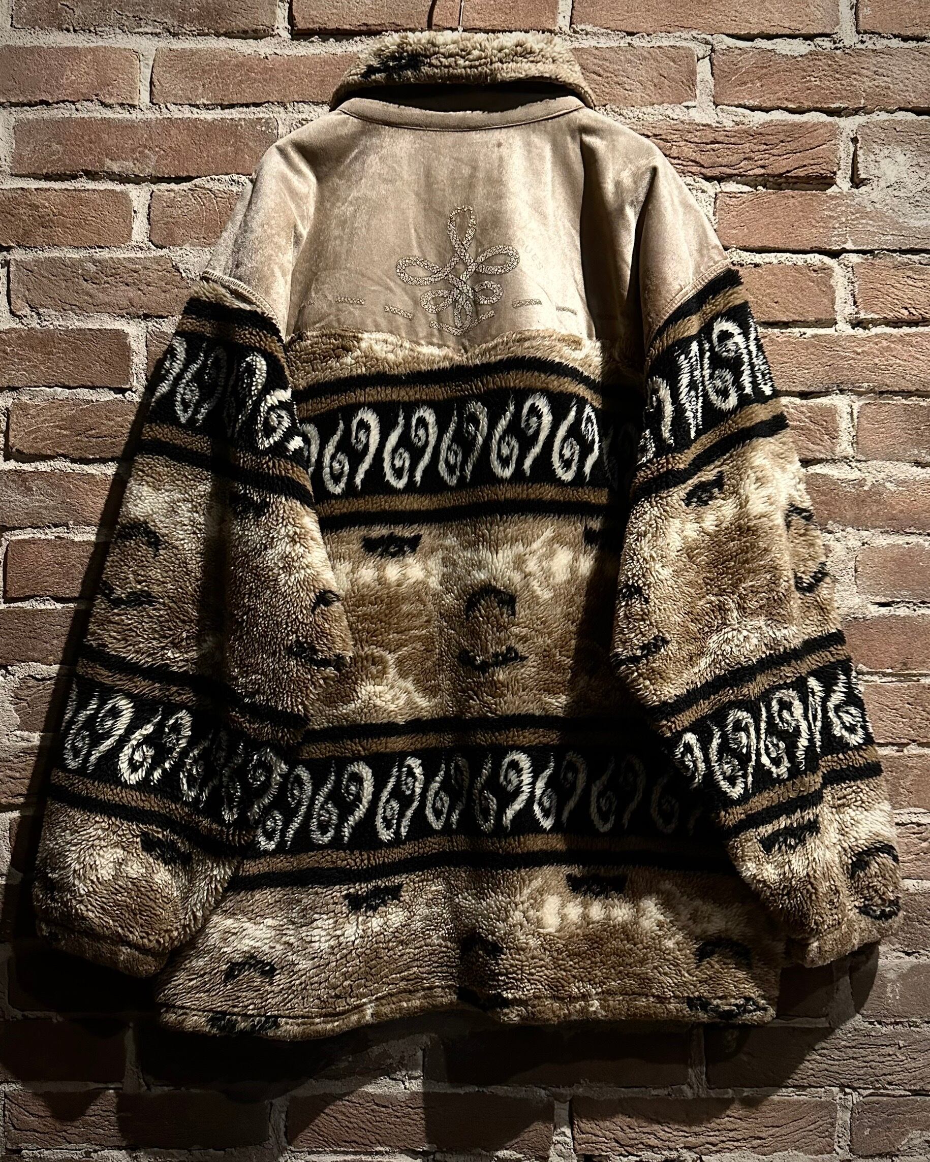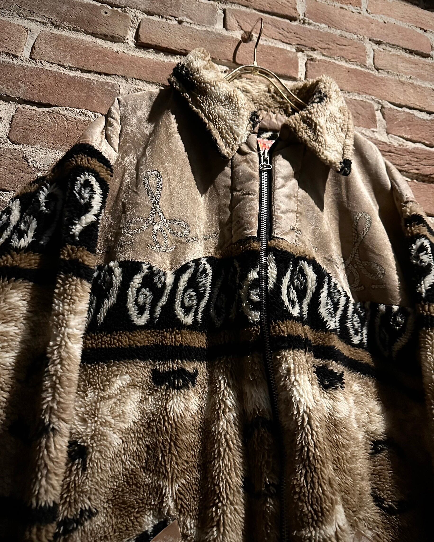 身頃上部や背面に配されたベルベットは、光の当たり方で表情を変え、フリースとのコントラストを際立たせる仕上がり。全面にはオリエンタルな雰囲気を感じさせるパターンが走り、単なる防寒着に留まらないデザイン性を感じさせます。