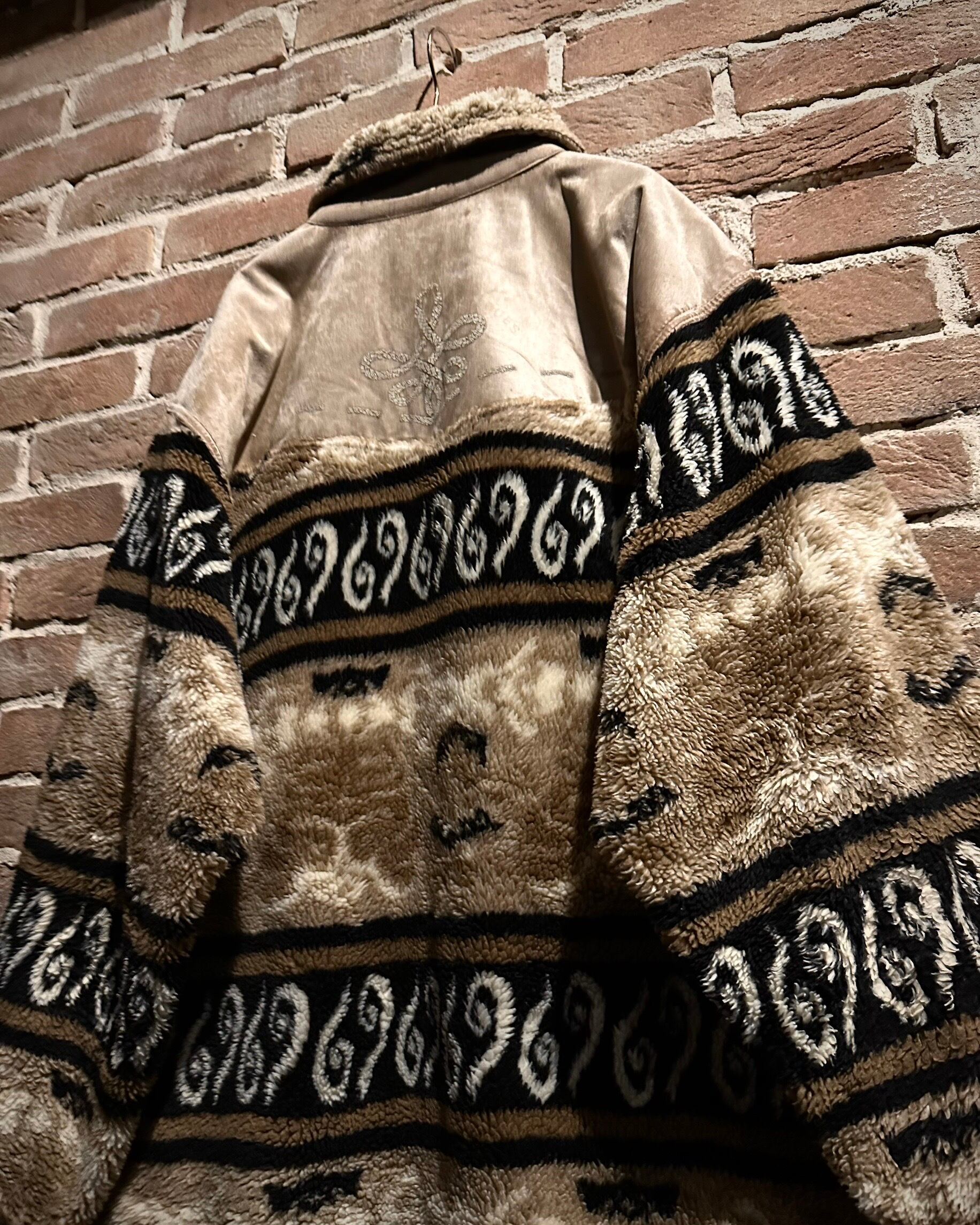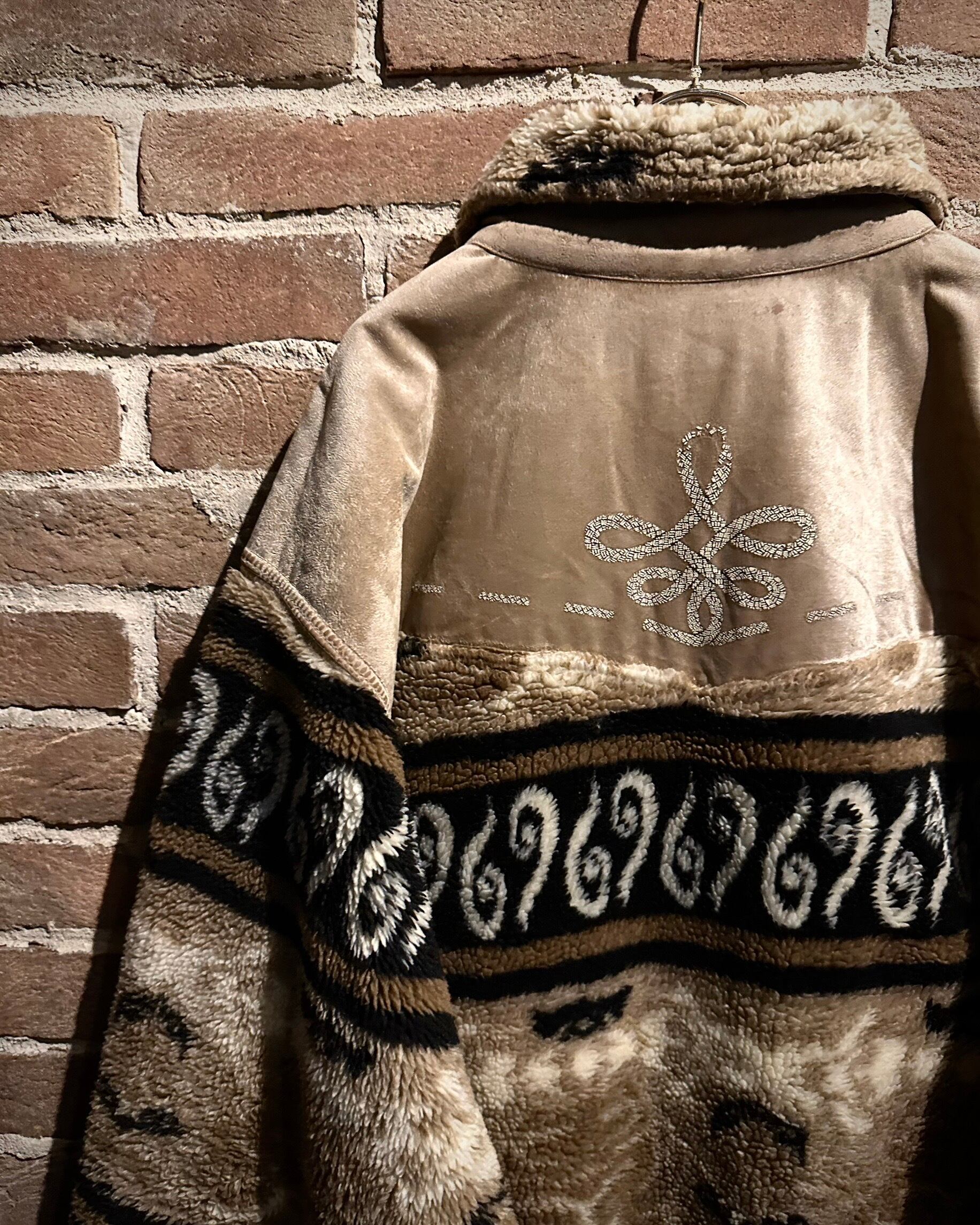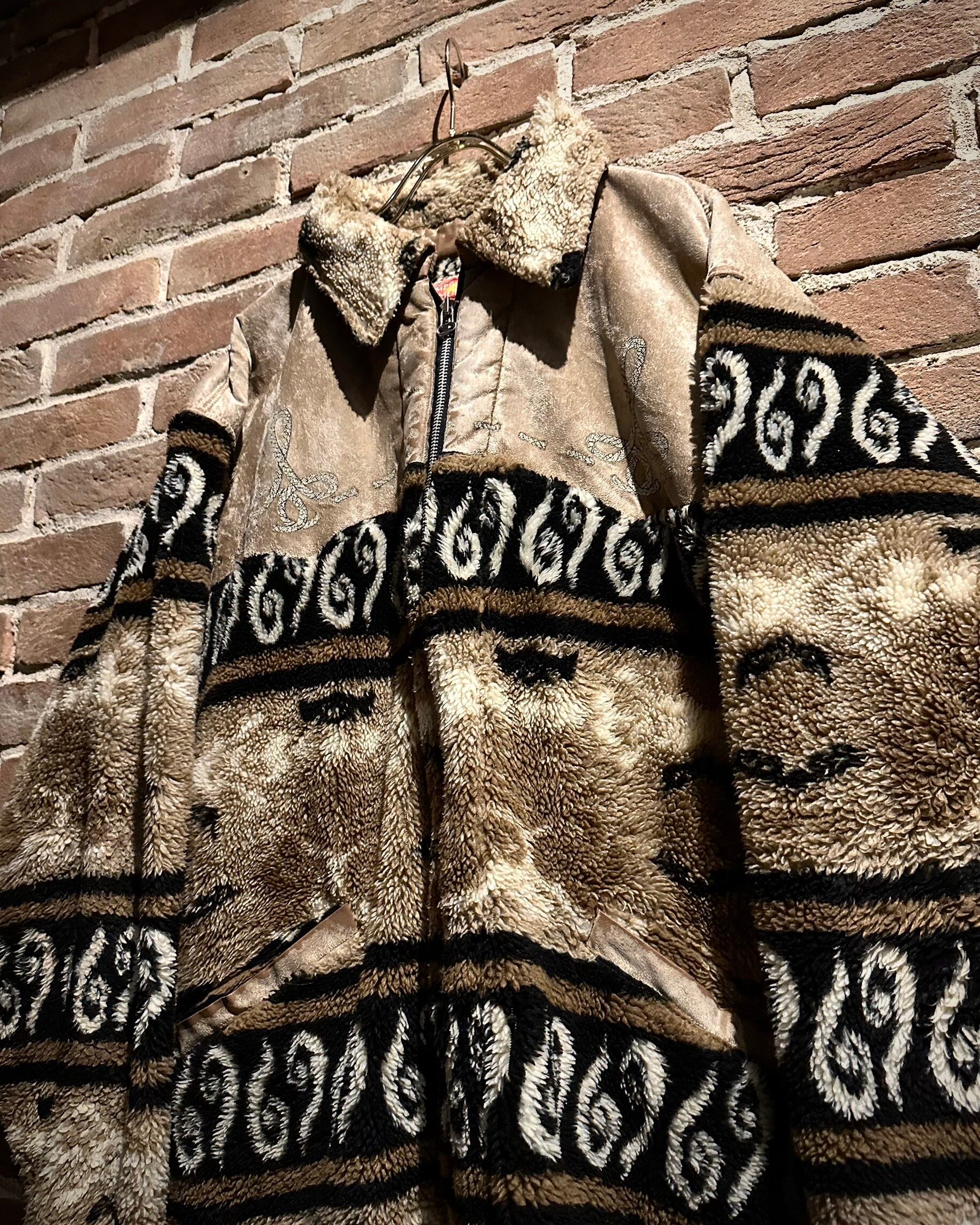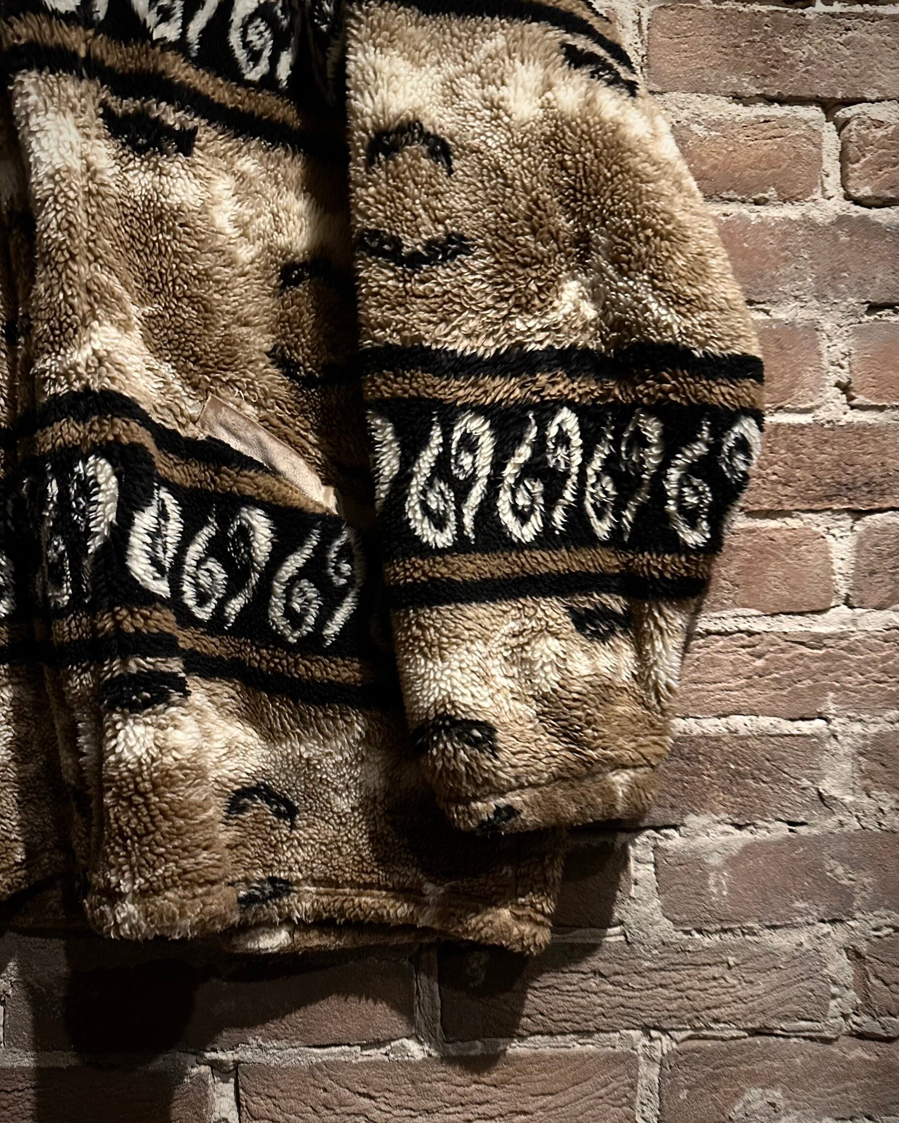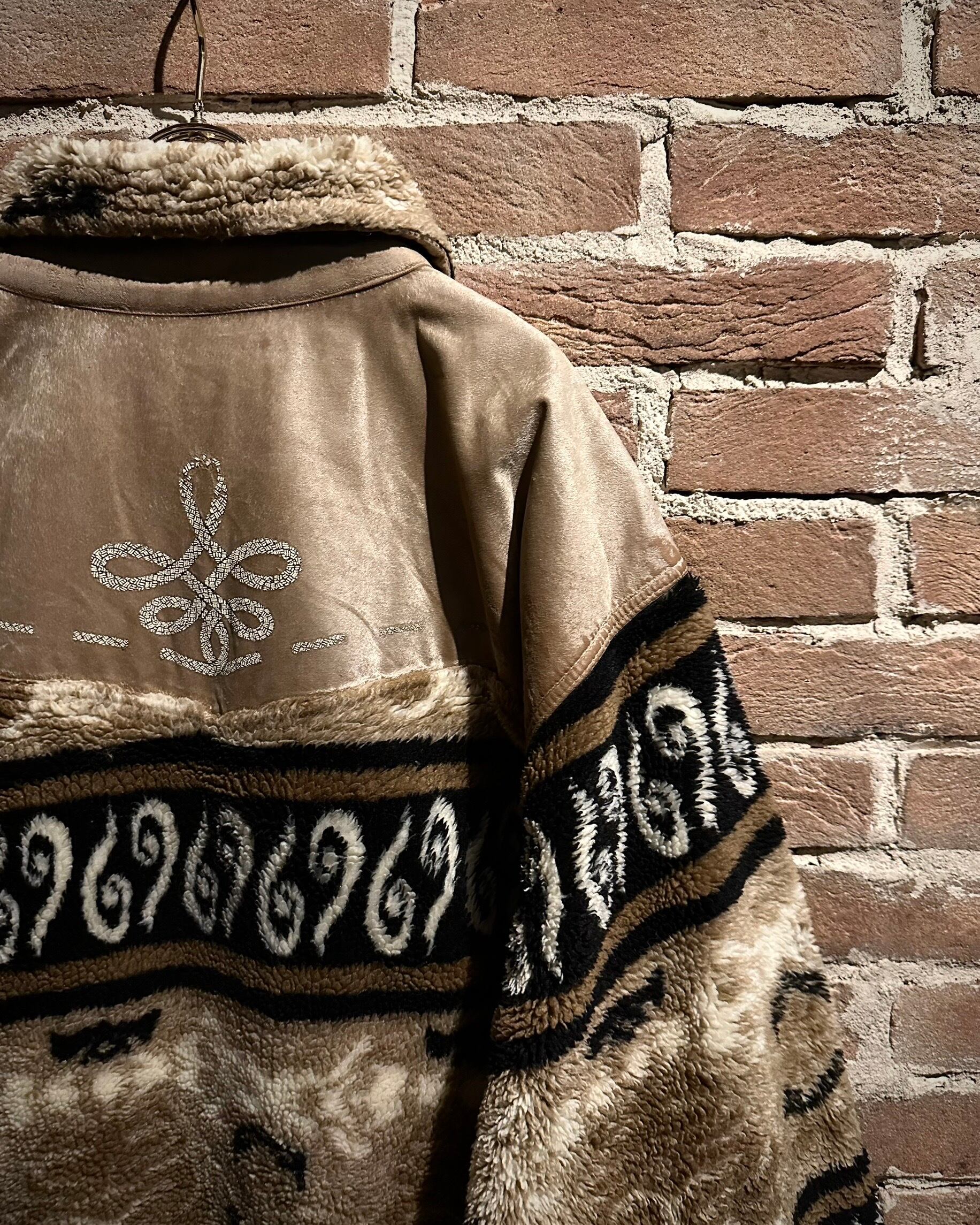 身頃上部や背面に配されたベルベットは、光の当たり方で表情を変え、フリースとのコントラストを際立たせる仕上がり。全面にはオリエンタルな雰囲気を感じさせるパターンが走り、単なる防寒着に留まらないデザイン性を感じさせます。