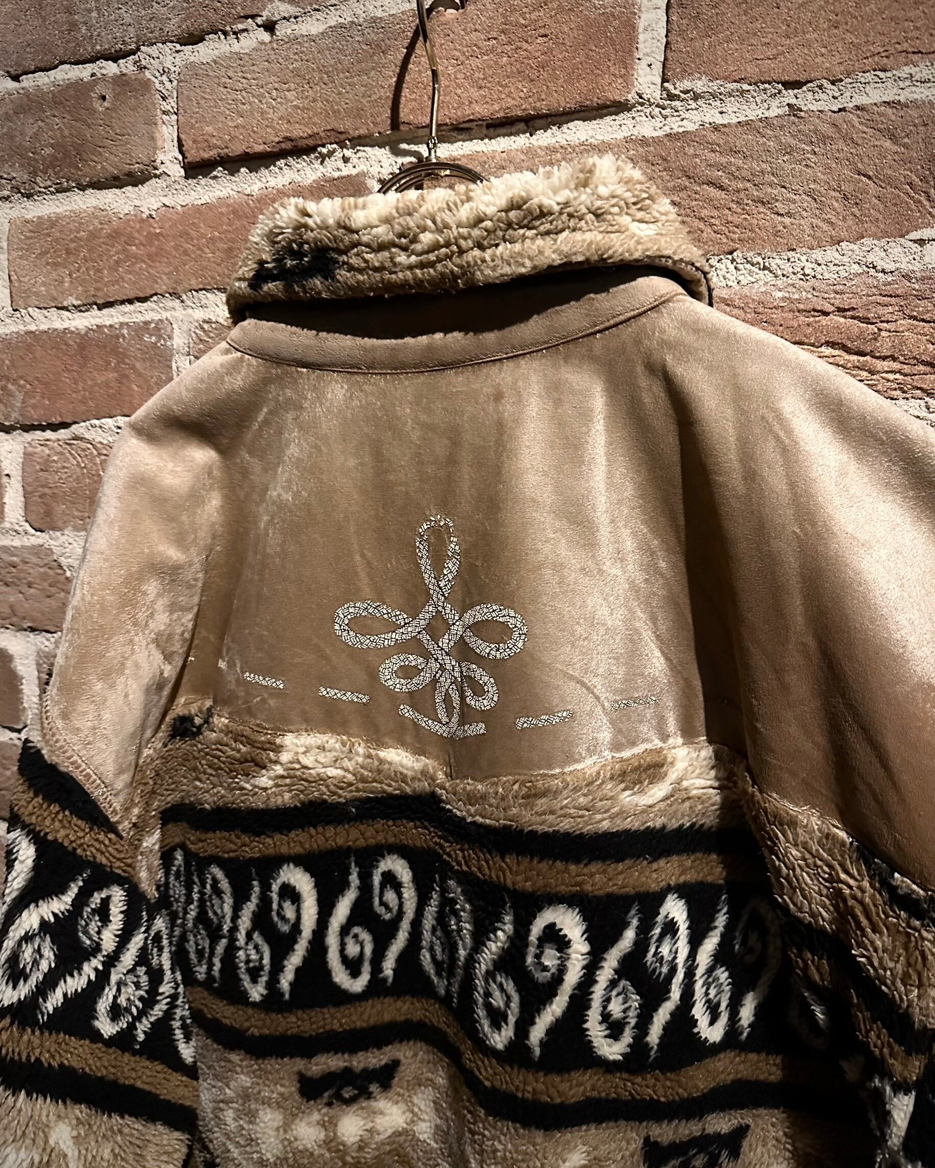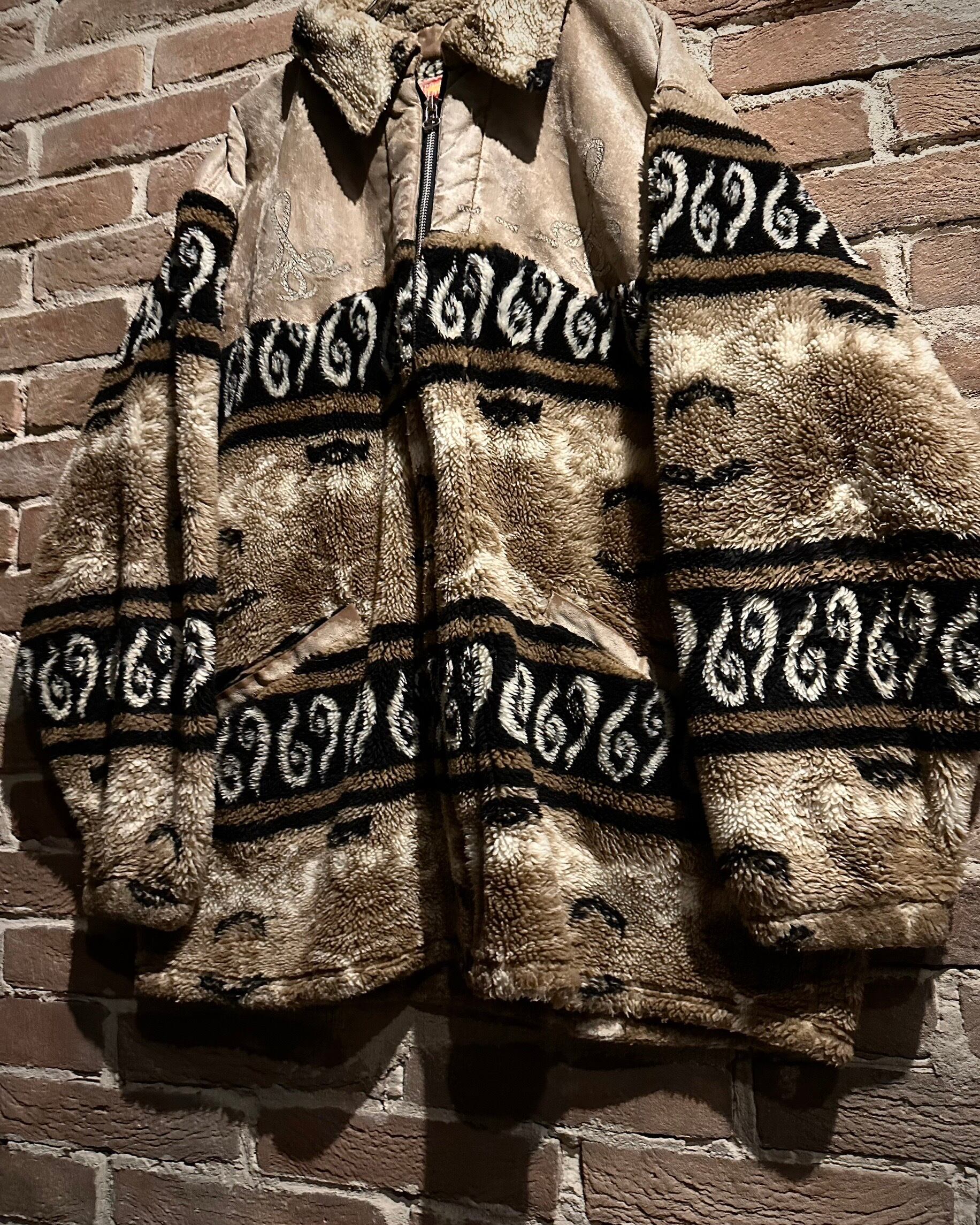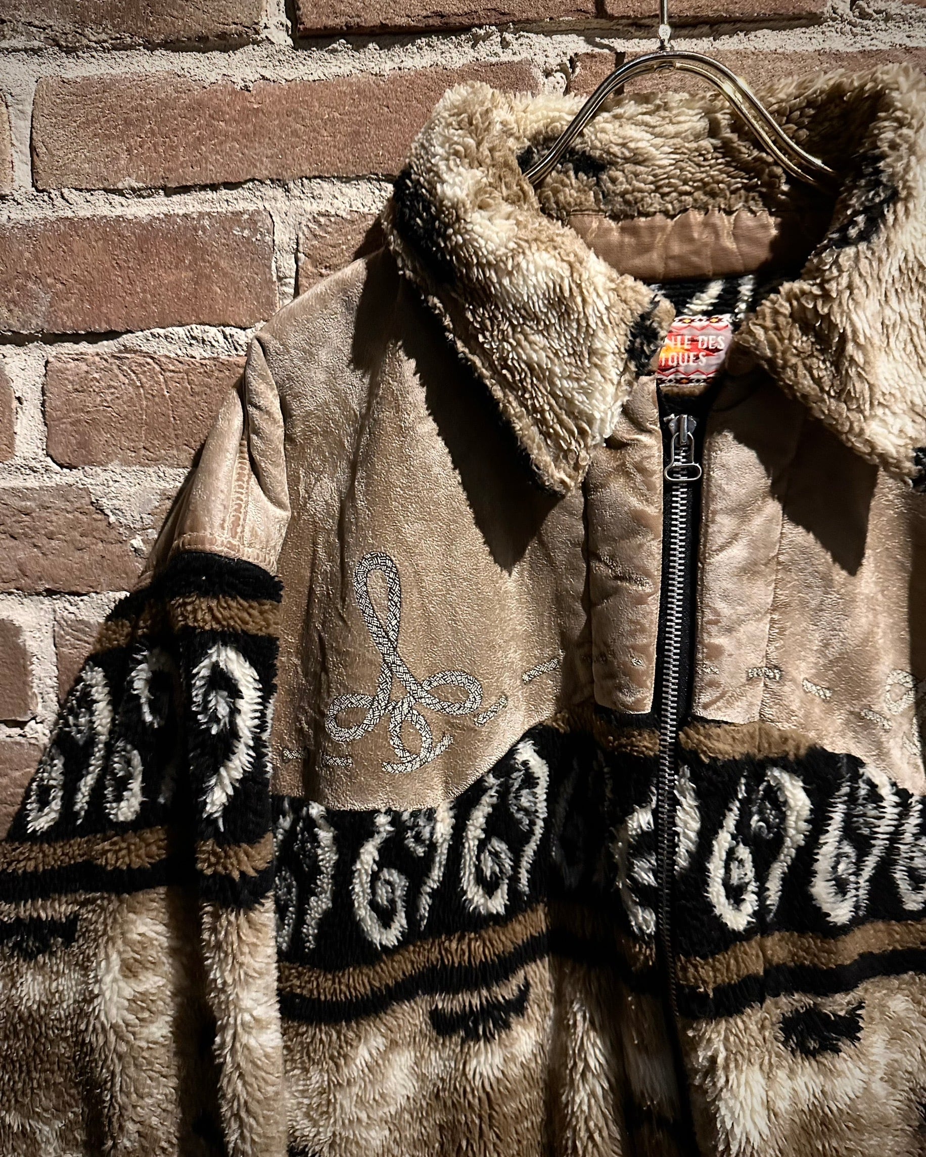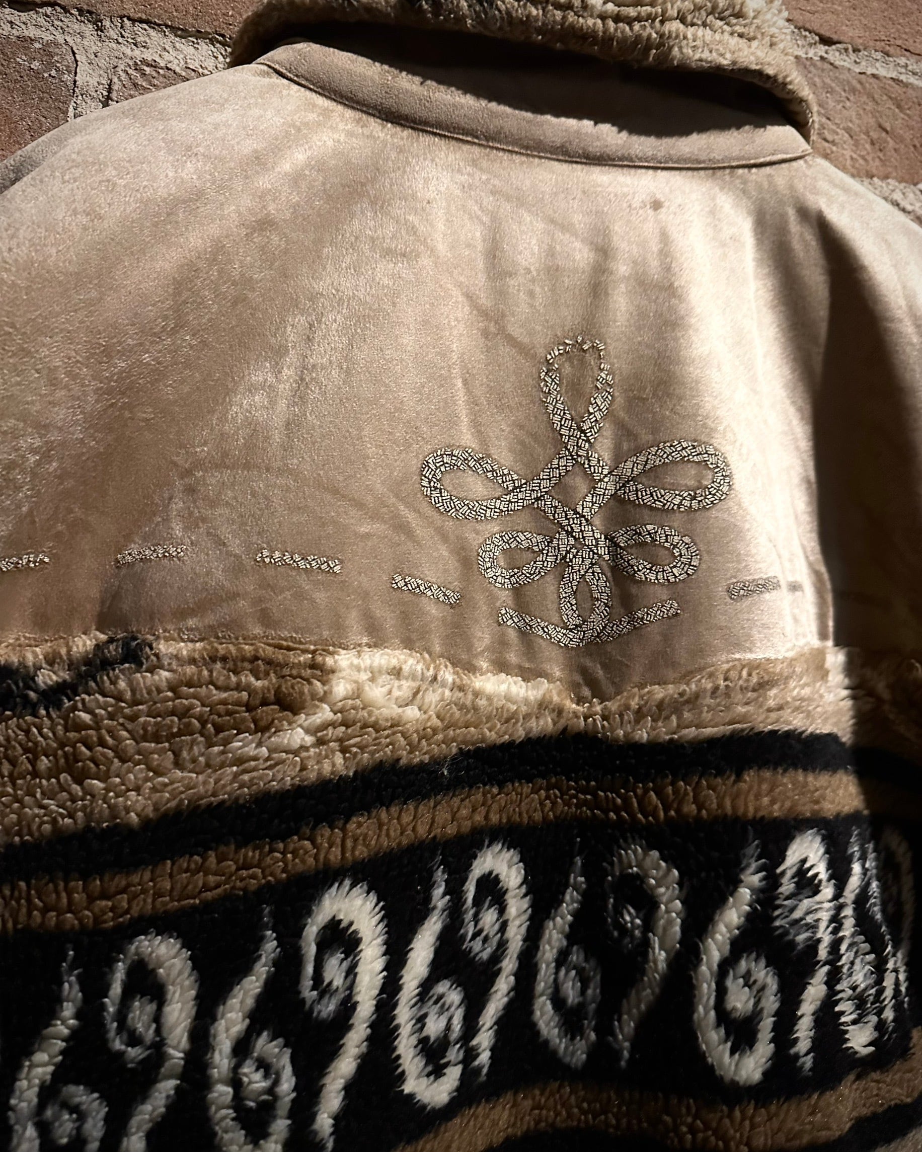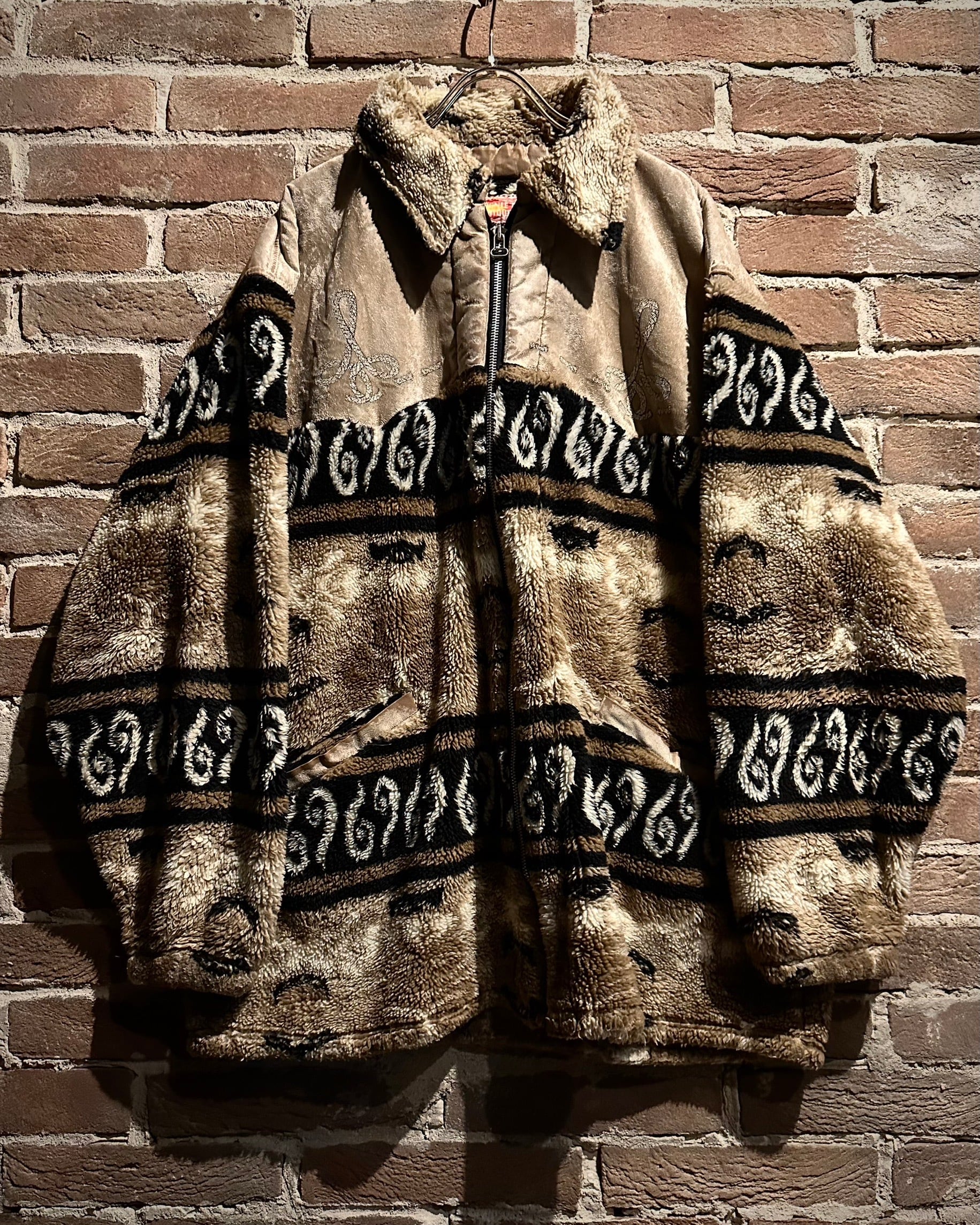 身頃上部や背面に配されたベルベットは、光の当たり方で表情を変え、フリースとのコントラストを際立たせる仕上がり。全面にはオリエンタルな雰囲気を感じさせるパターンが走り、単なる防寒着に留まらないデザイン性を感じさせます。