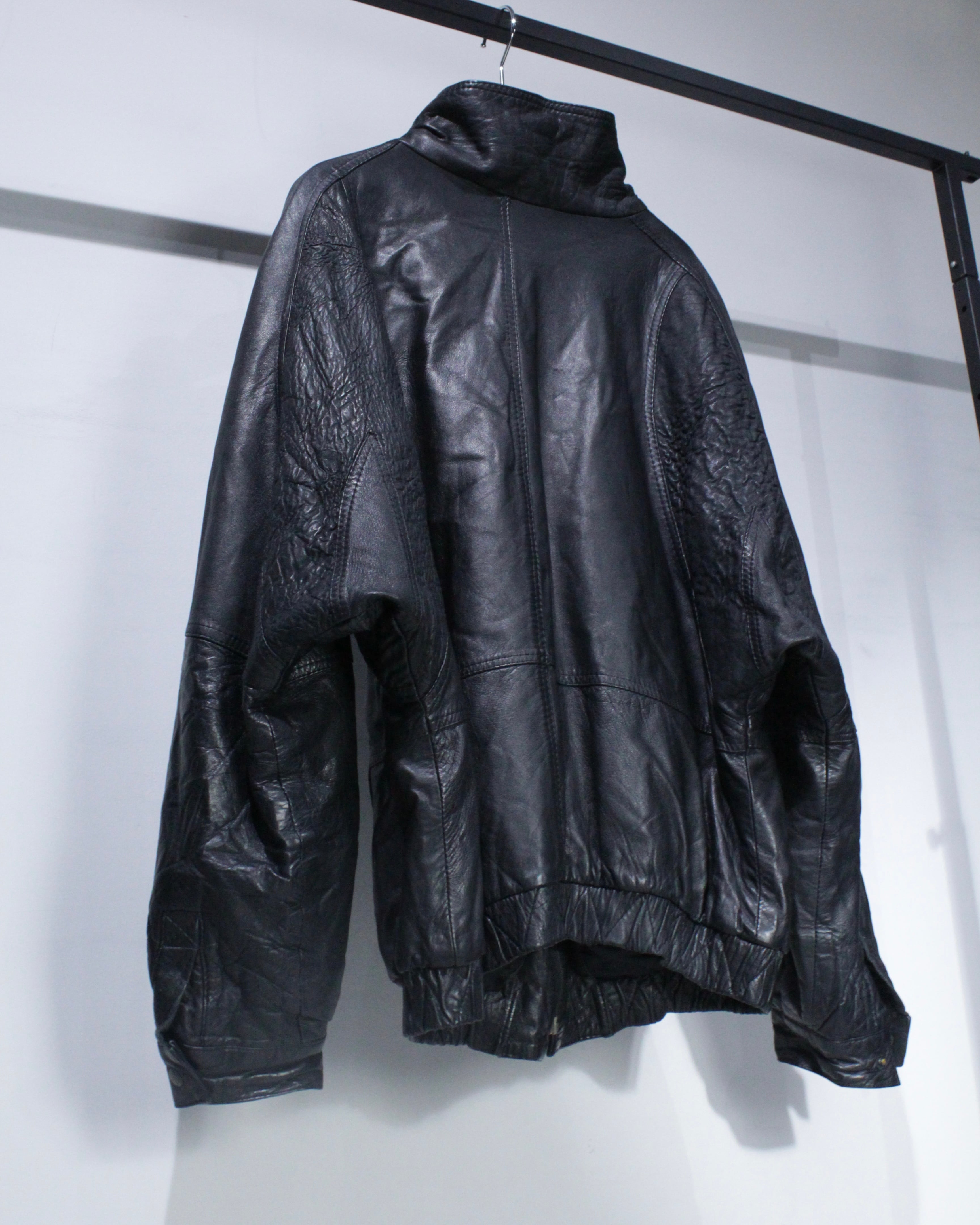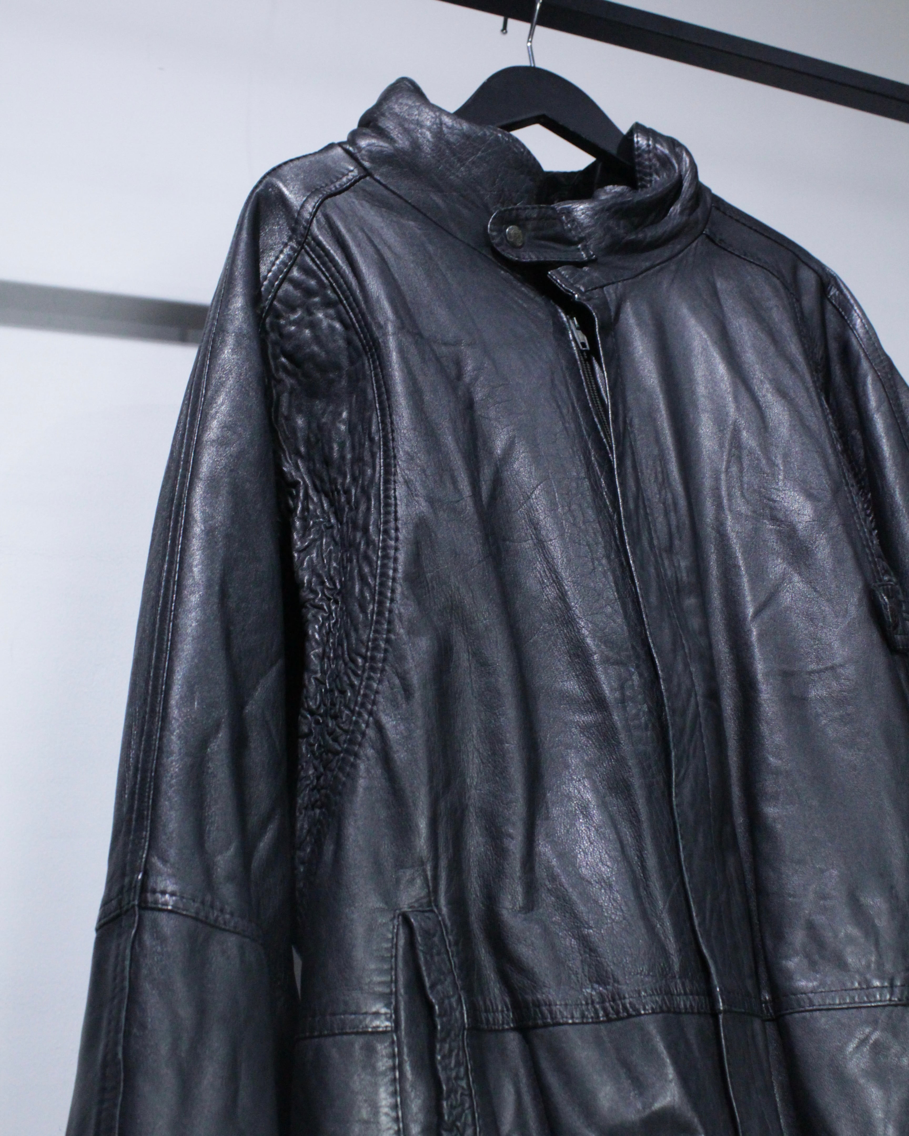 ゆとりのあるサイジングに加え、ドルマンスリーブ特有の可動域の広さにより、レザーアイテムながらストレスの少ない着用感が◎