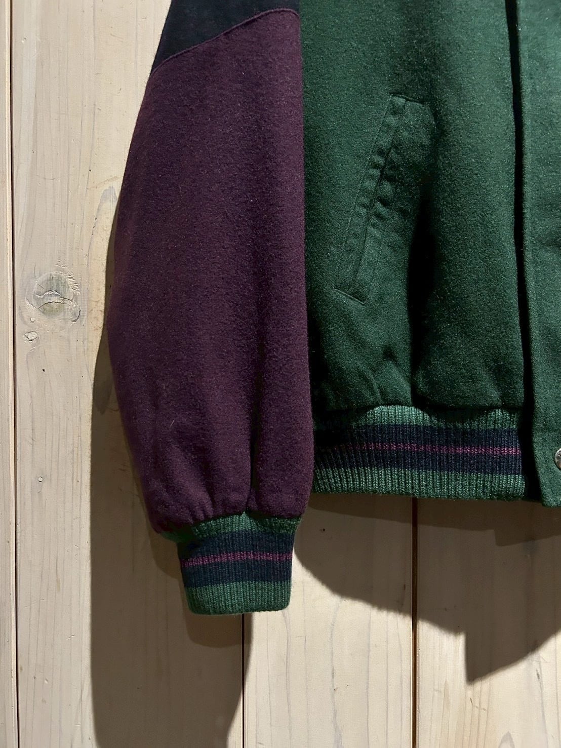 柔らかく上質なウール素材を用いたボディは、深みのあるグリーンをベースにブラックとパープルを切り替え。クラシックなブルゾン型を軸にしながら、カラーコントラストでしっかりと個性を打ち出しています。