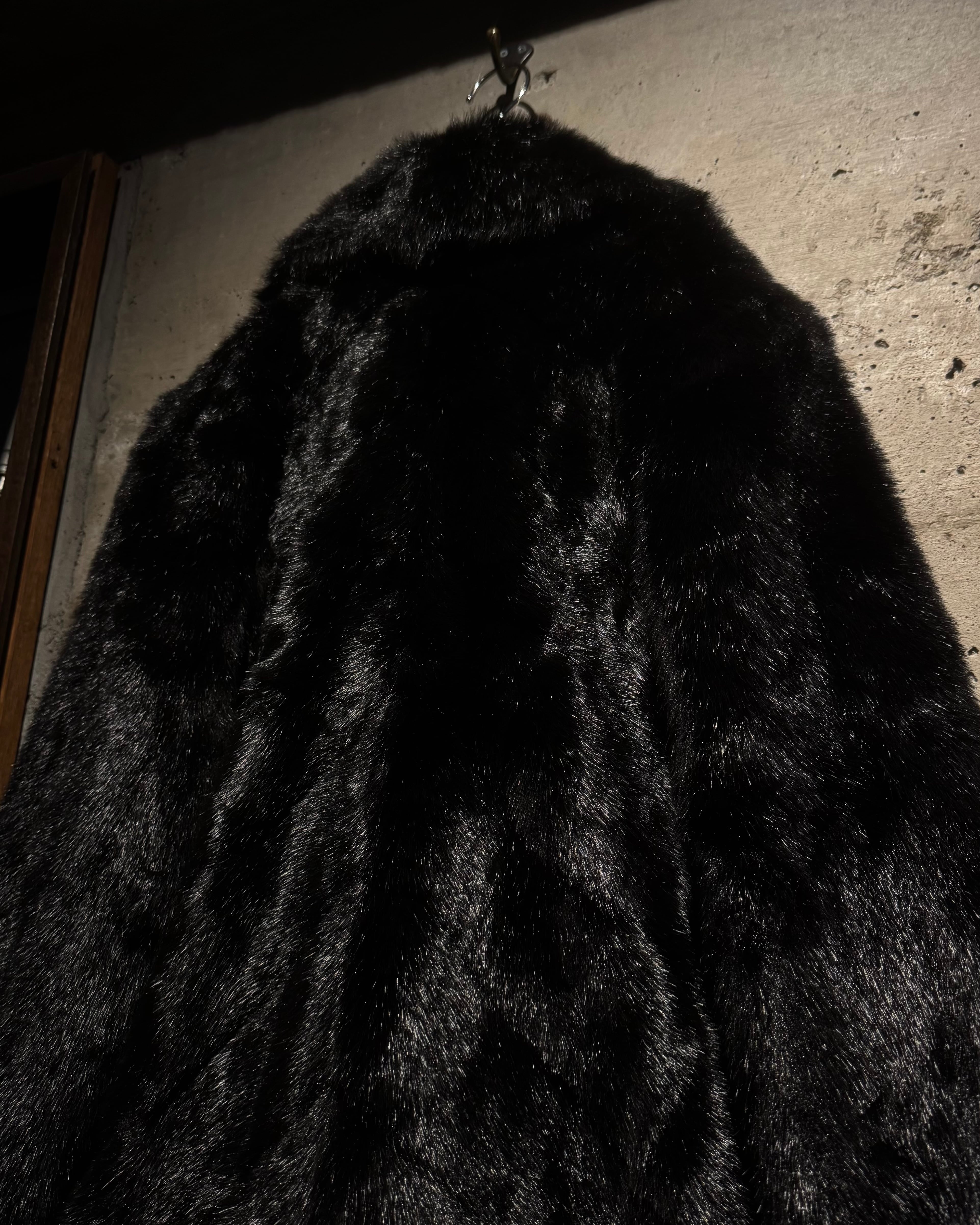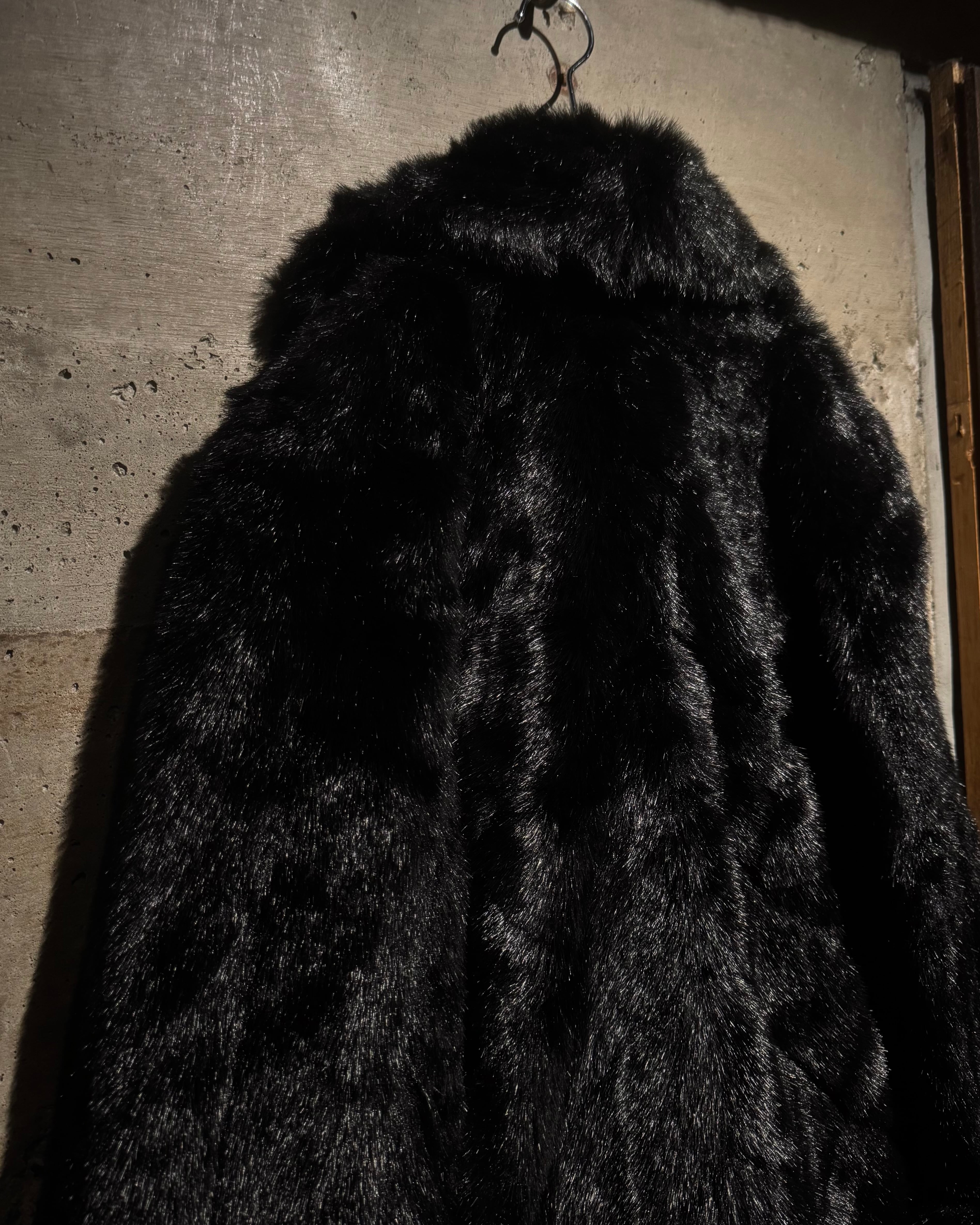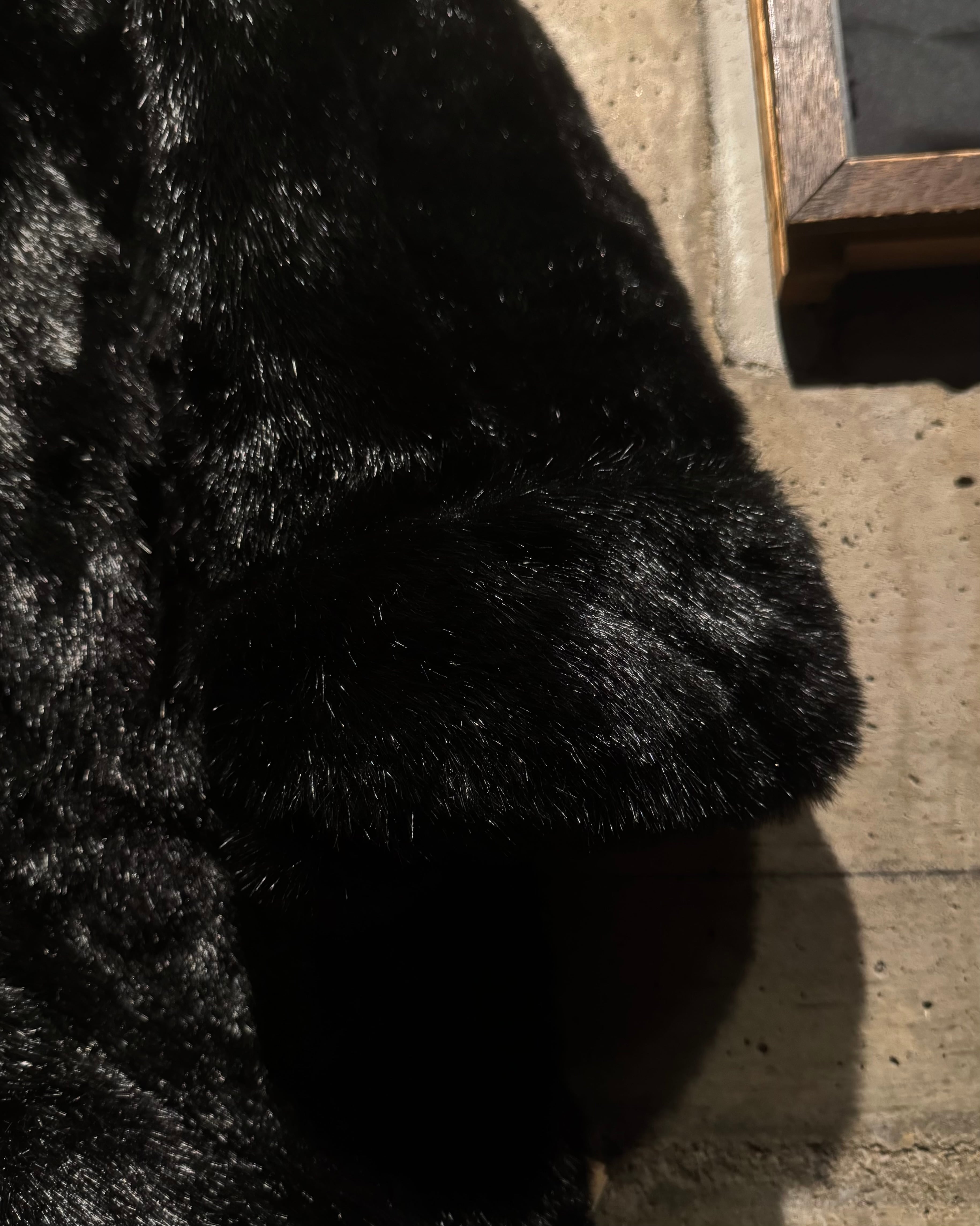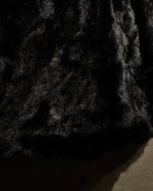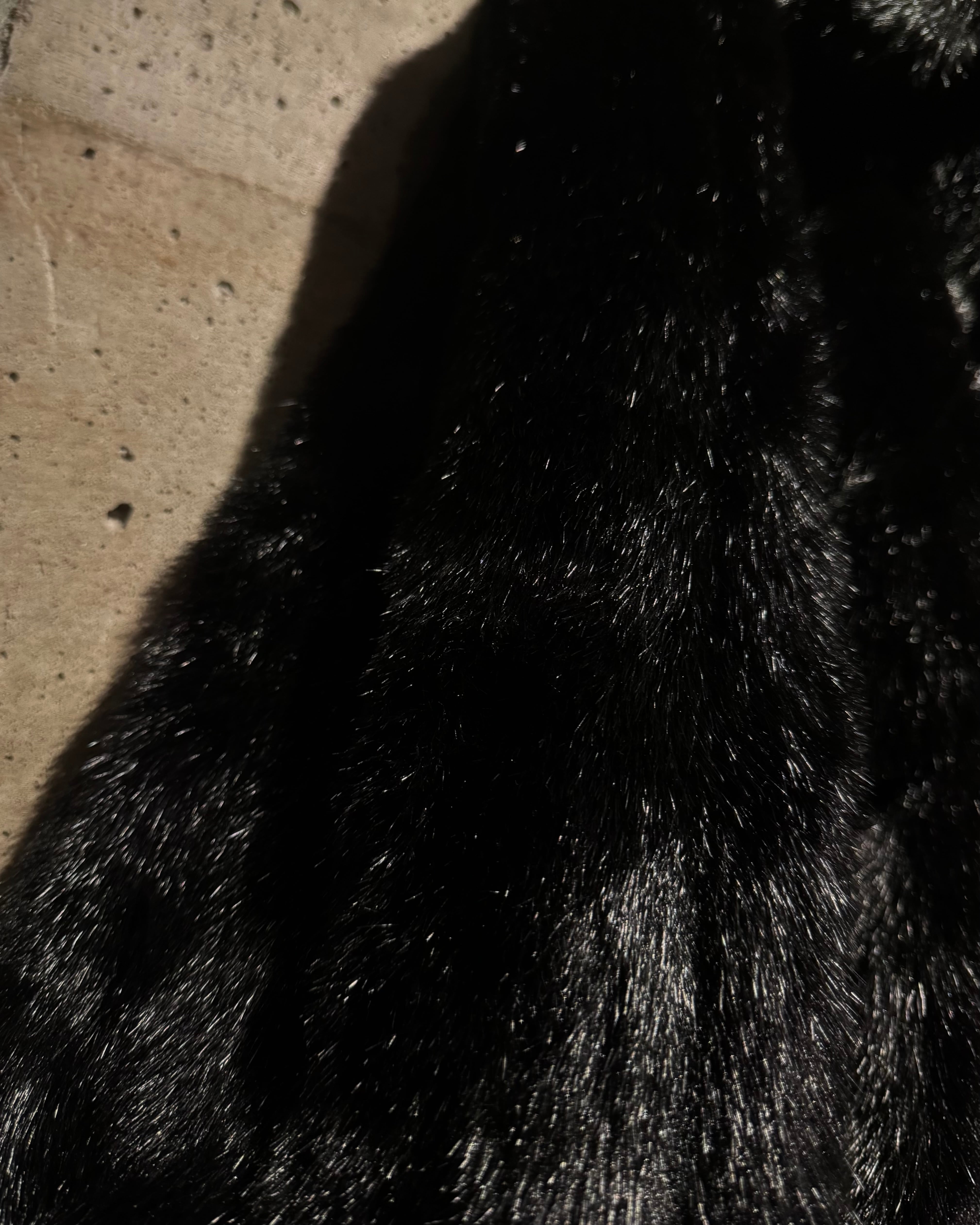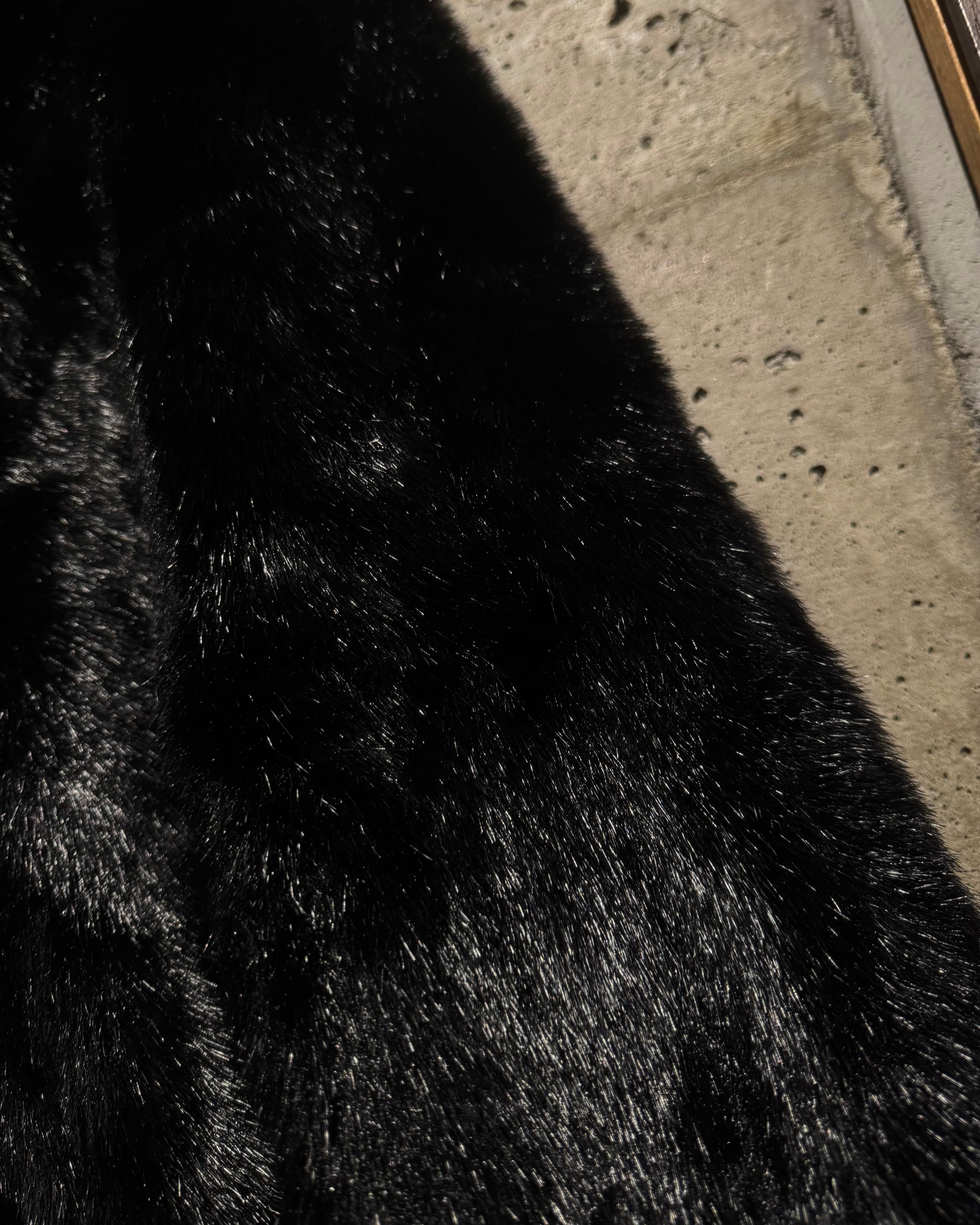 毛足の長いシャギーファーを全面に使用したボディは、光の当たり方によって表情が変わる立体的な質感。ブラックベースながら奥行きがあり、重たく見えないのがこの手のファーでは非常に珍しいポイントです。