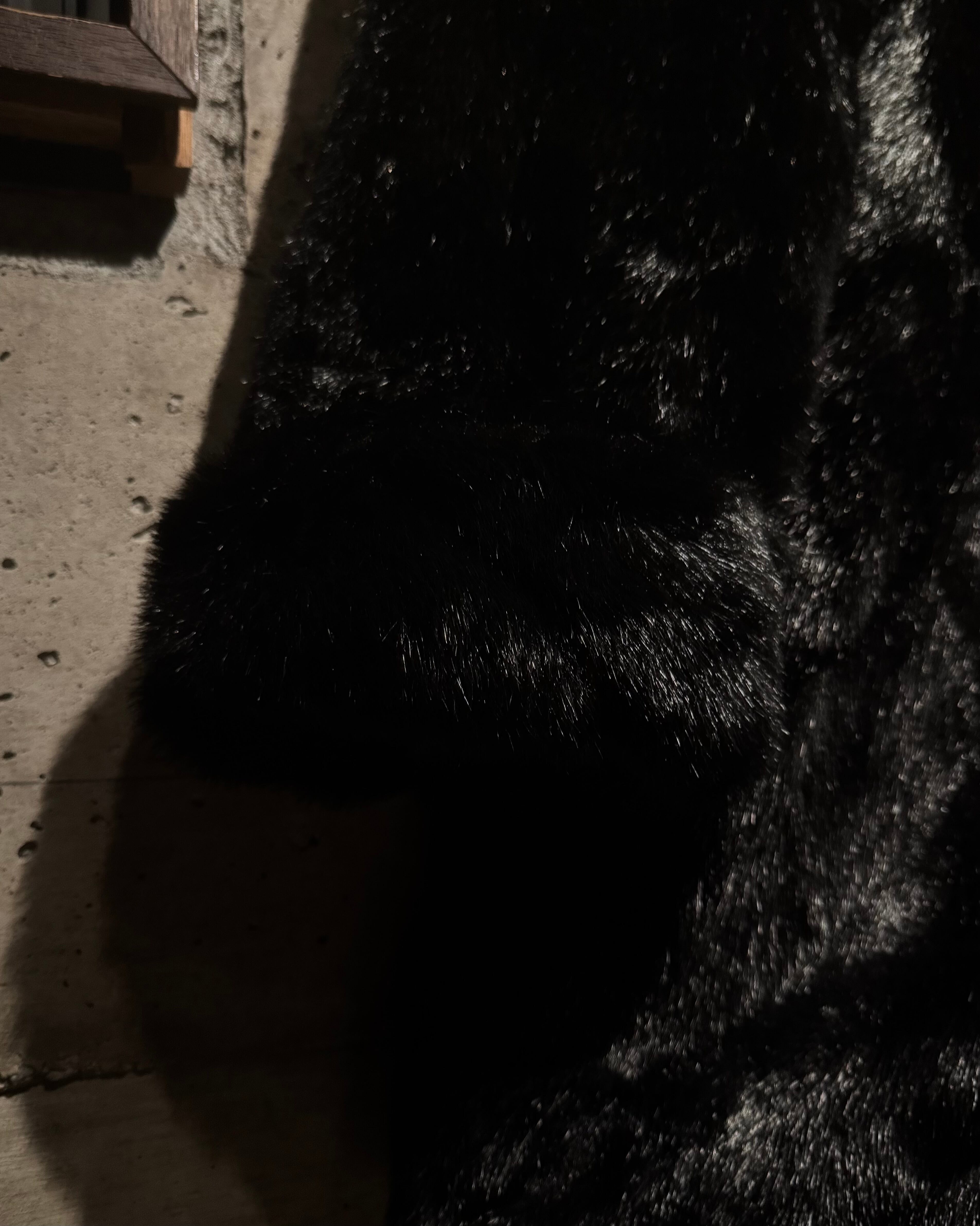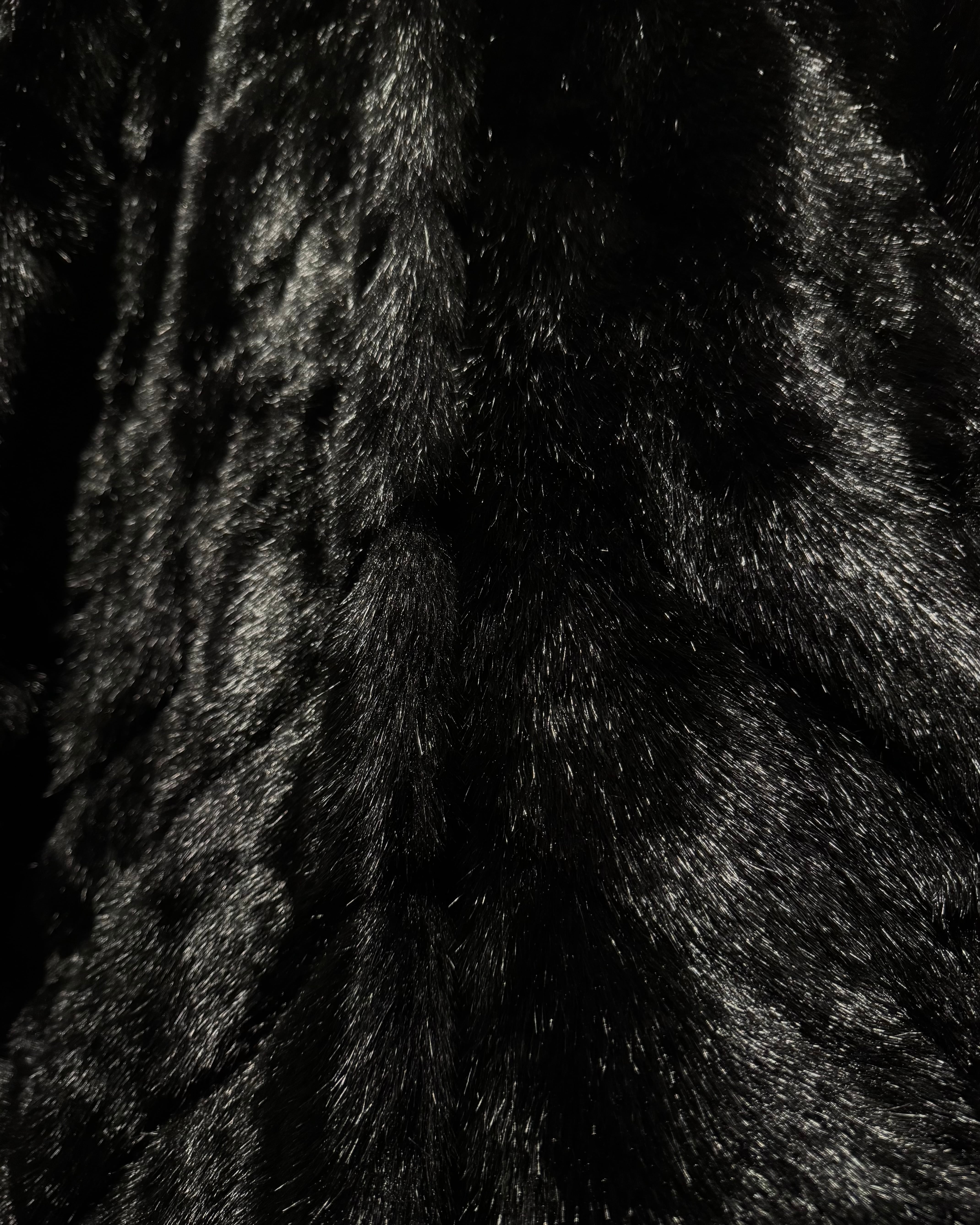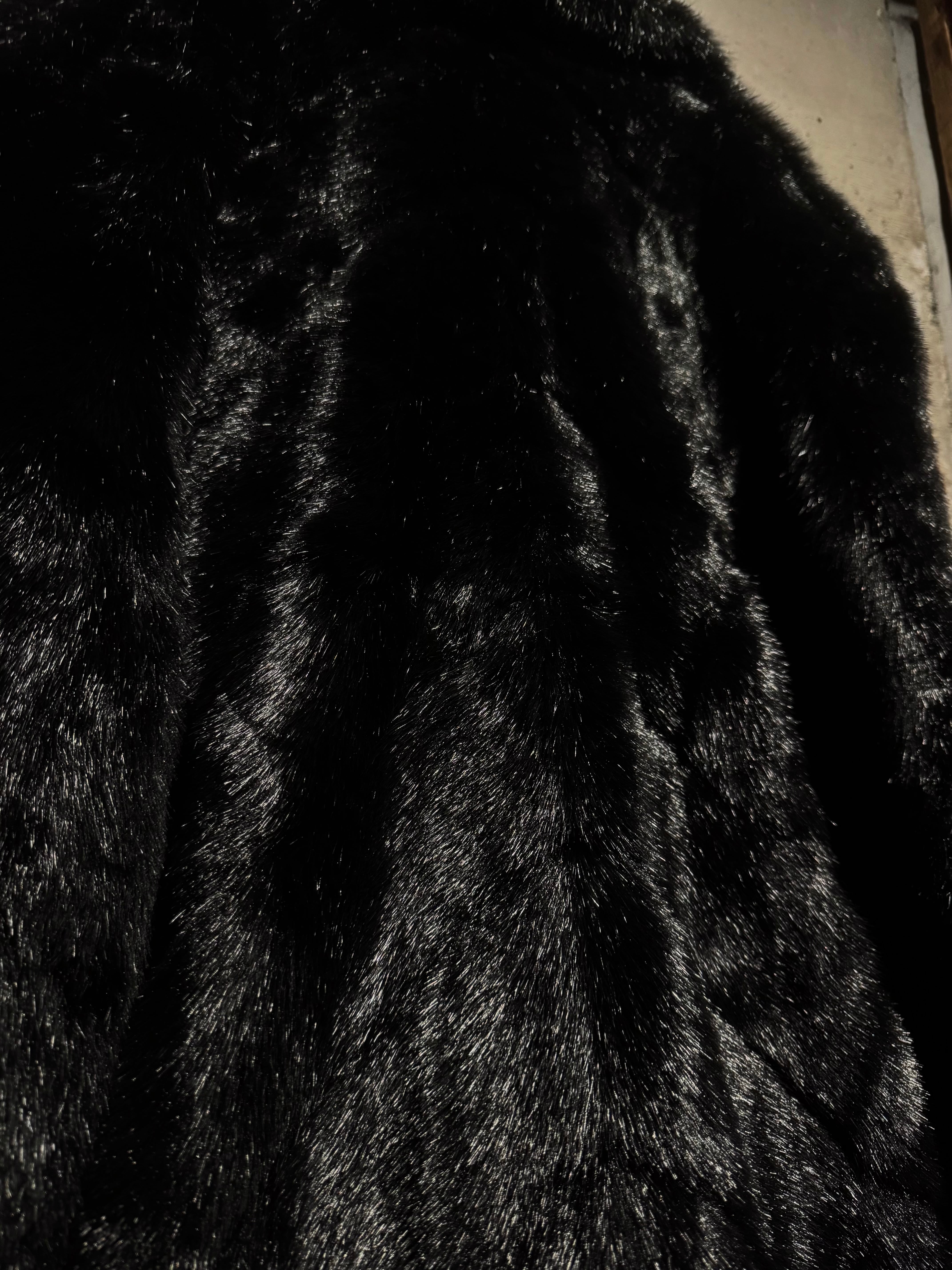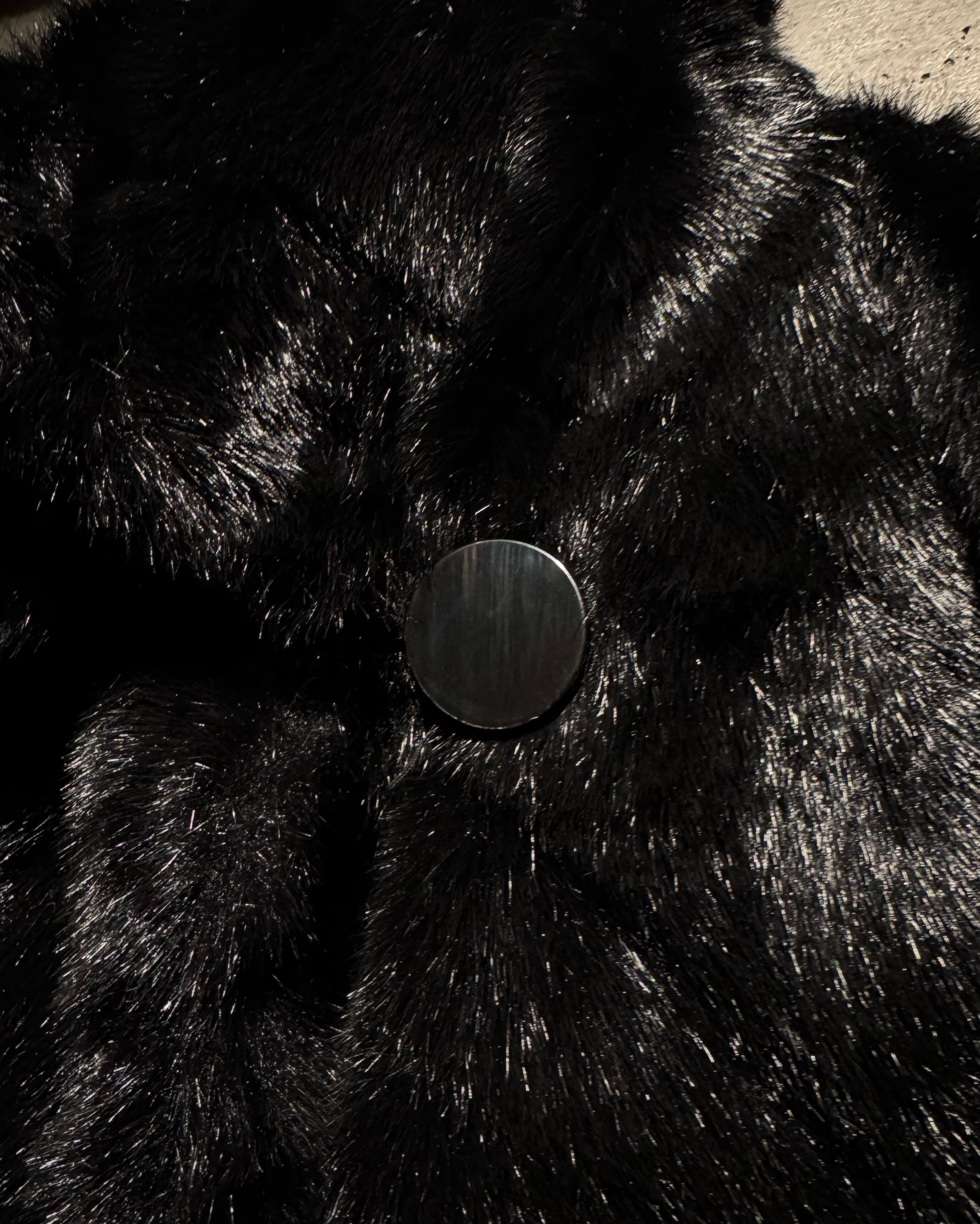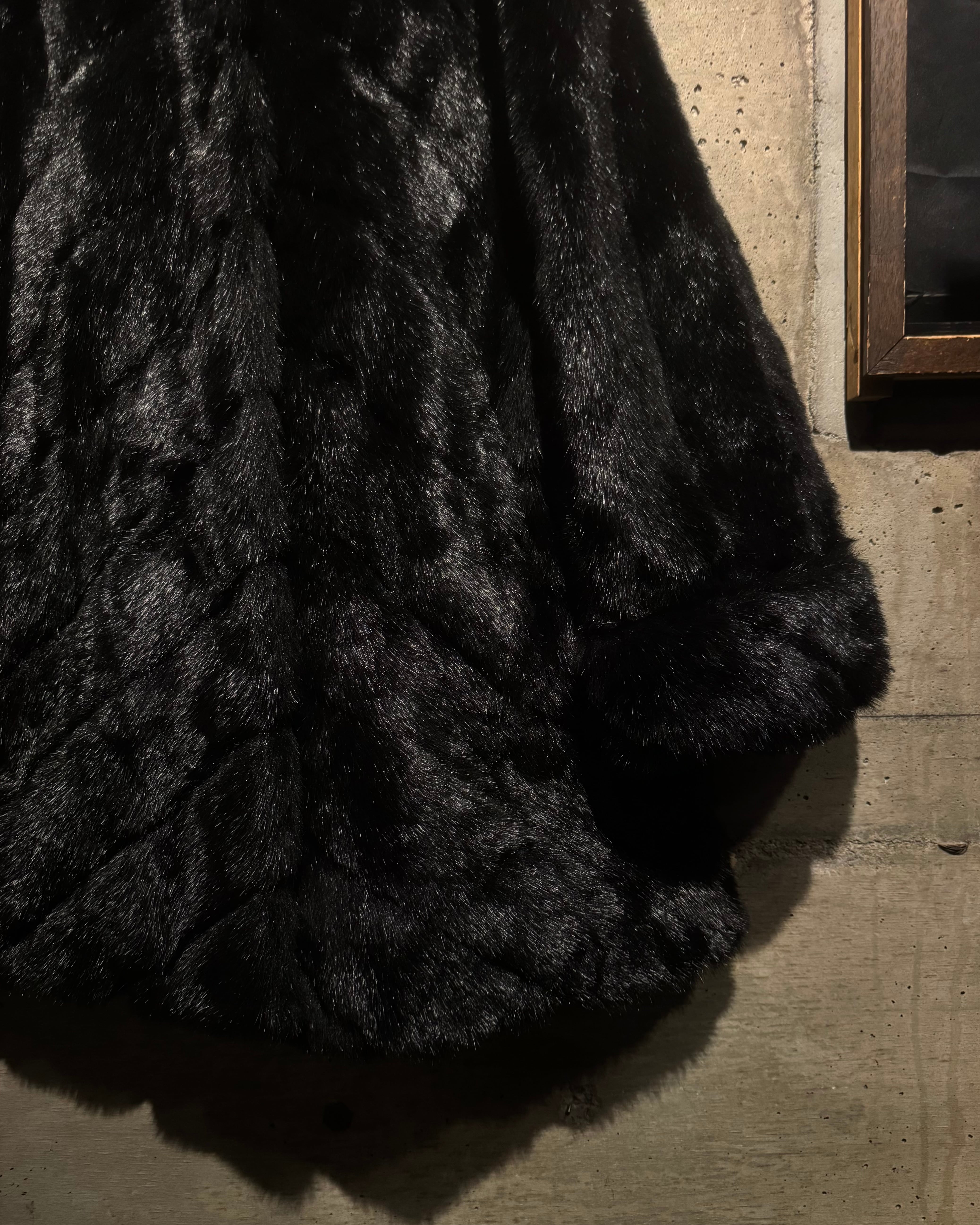 毛足の長いシャギーファーを全面に使用したボディは、光の当たり方によって表情が変わる立体的な質感。ブラックベースながら奥行きがあり、重たく見えないのがこの手のファーでは非常に珍しいポイントです。
