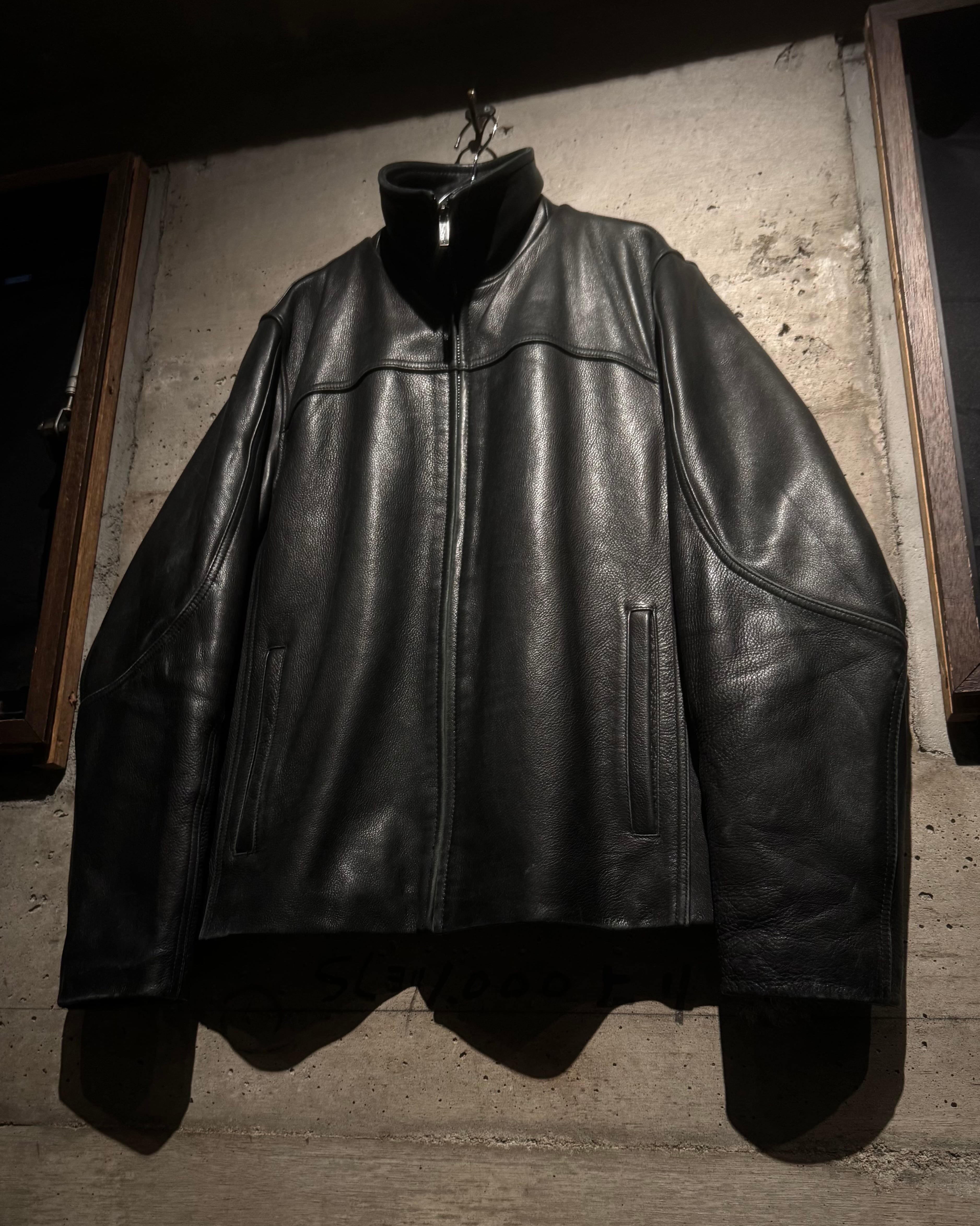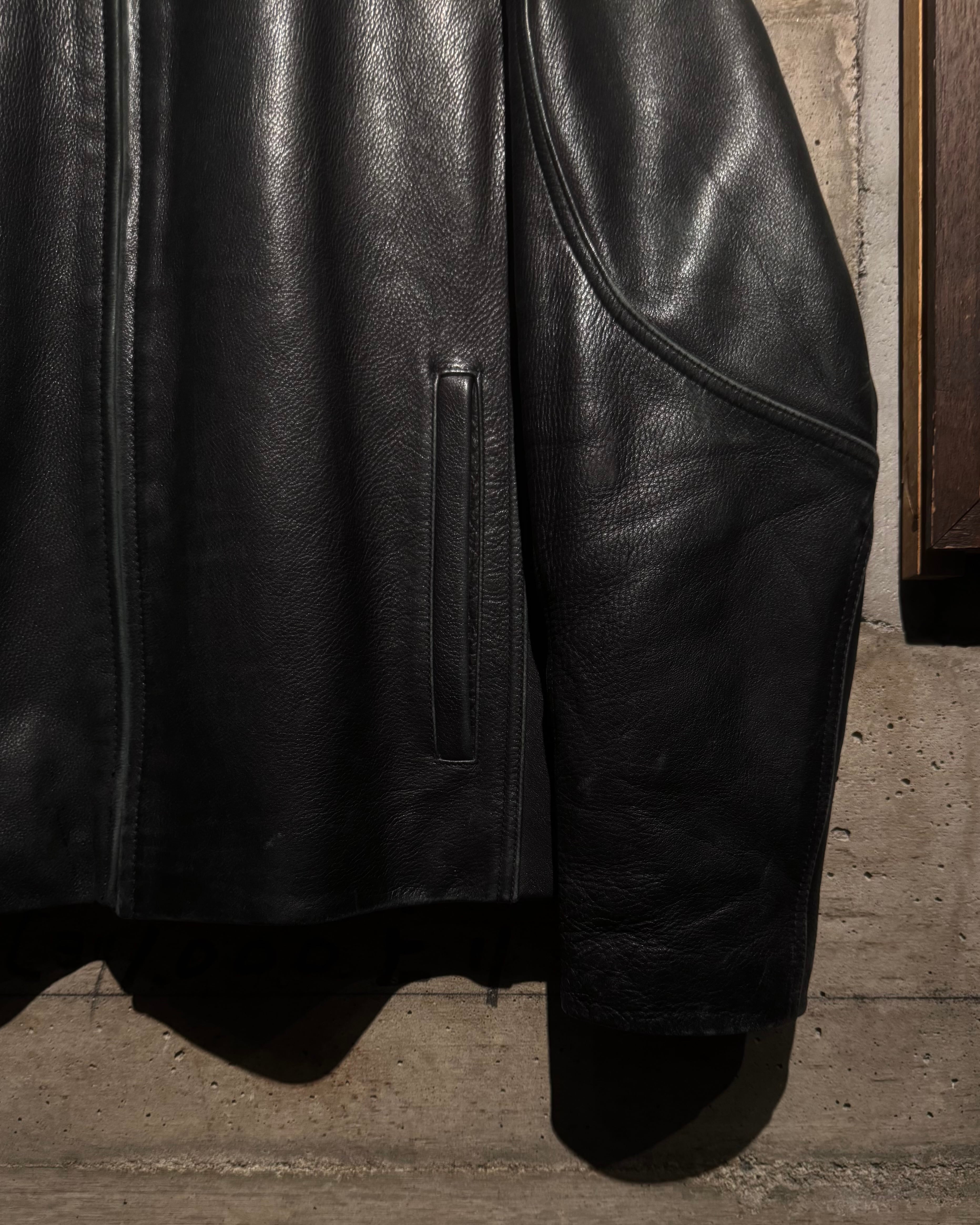 襟部分は寝かせることも可能。上品な切り替えライン。美しいパターニングとレザーの重厚感で着用時は文句なし。レザーそのものの質感とシルエットの美しさが際立ちます。
