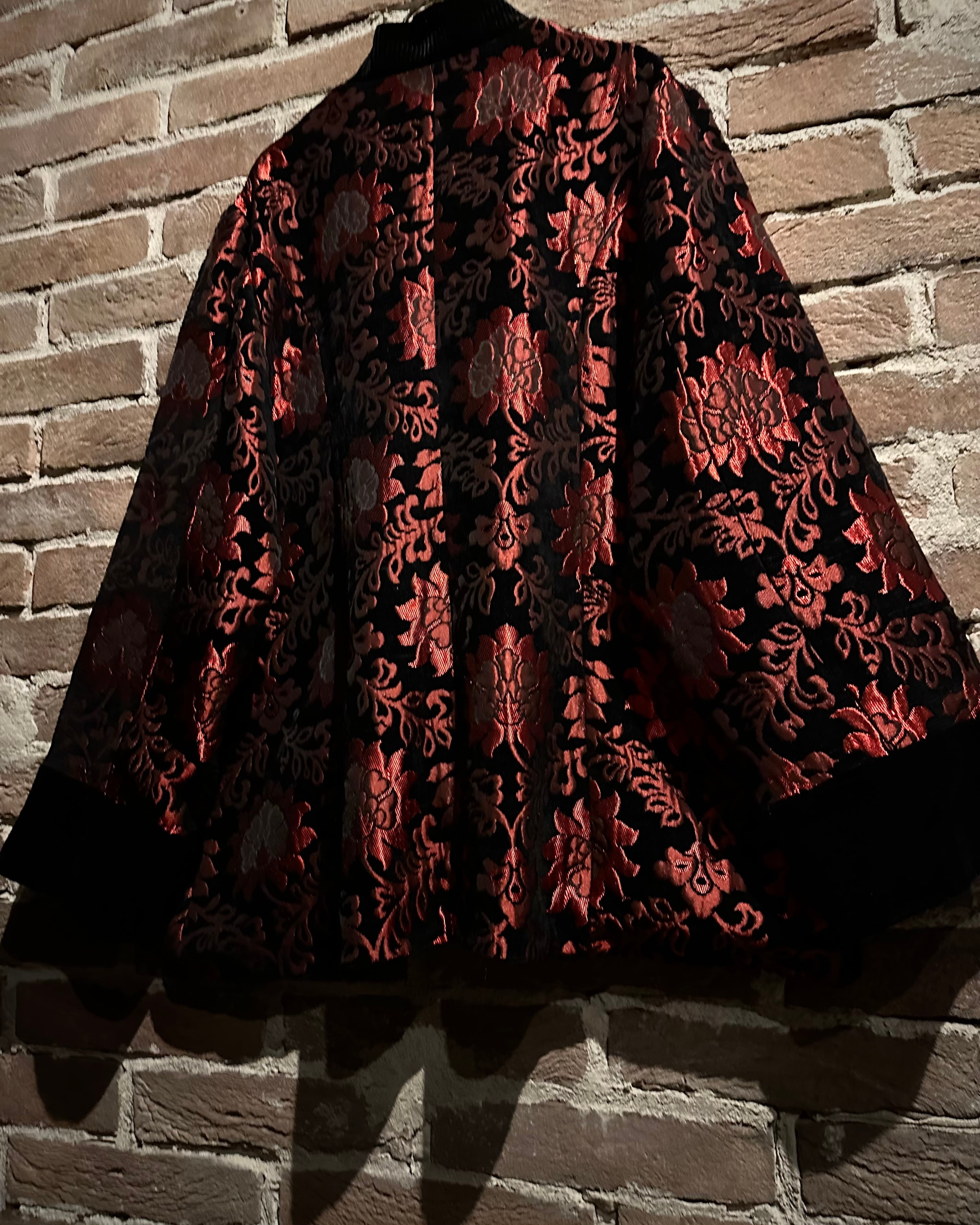 畝のあるベロアのような表情を持つファブリックに、織りで奥行きのあるボタニカル柄を落とし込んだチャイナシャツ。