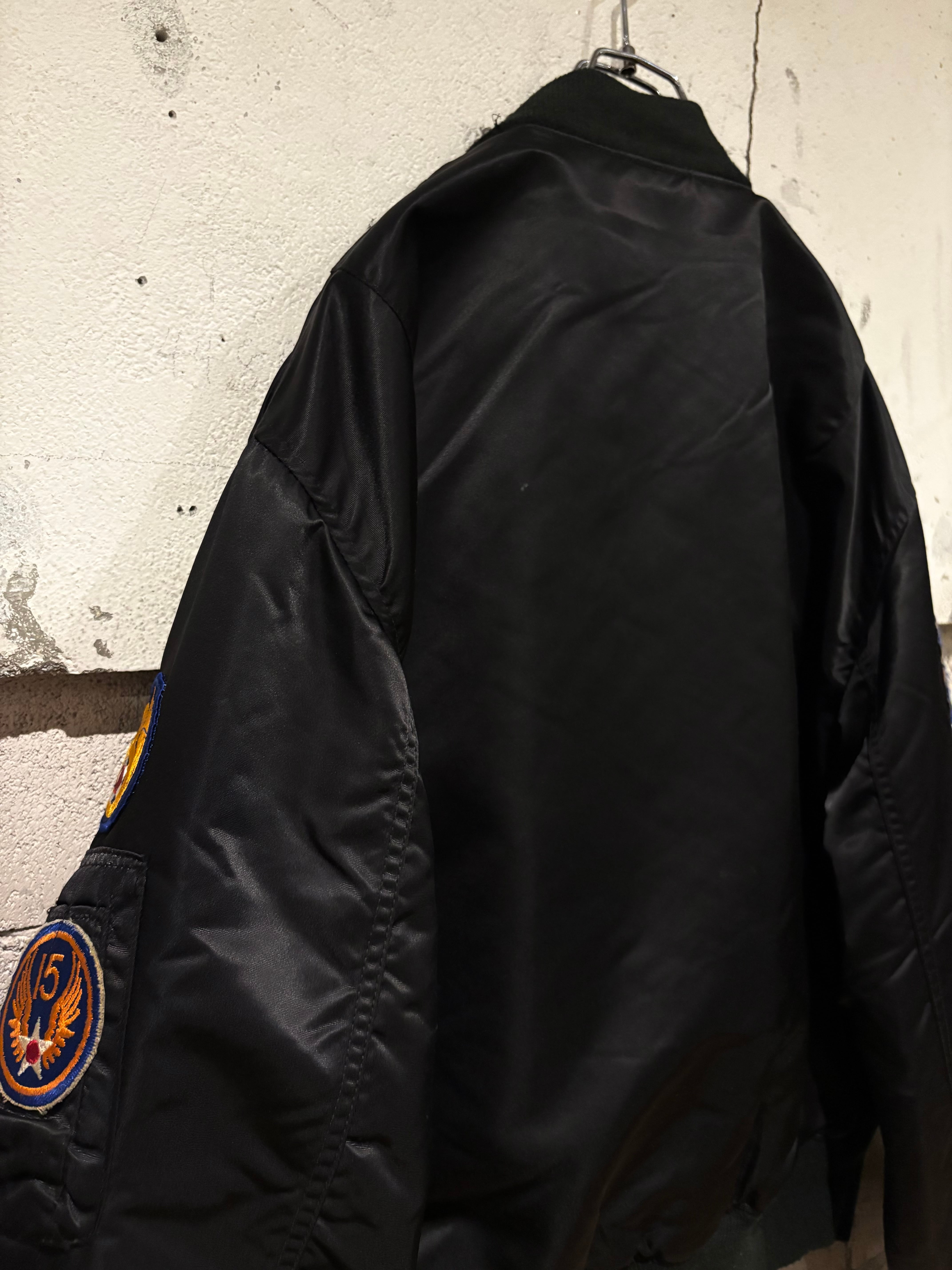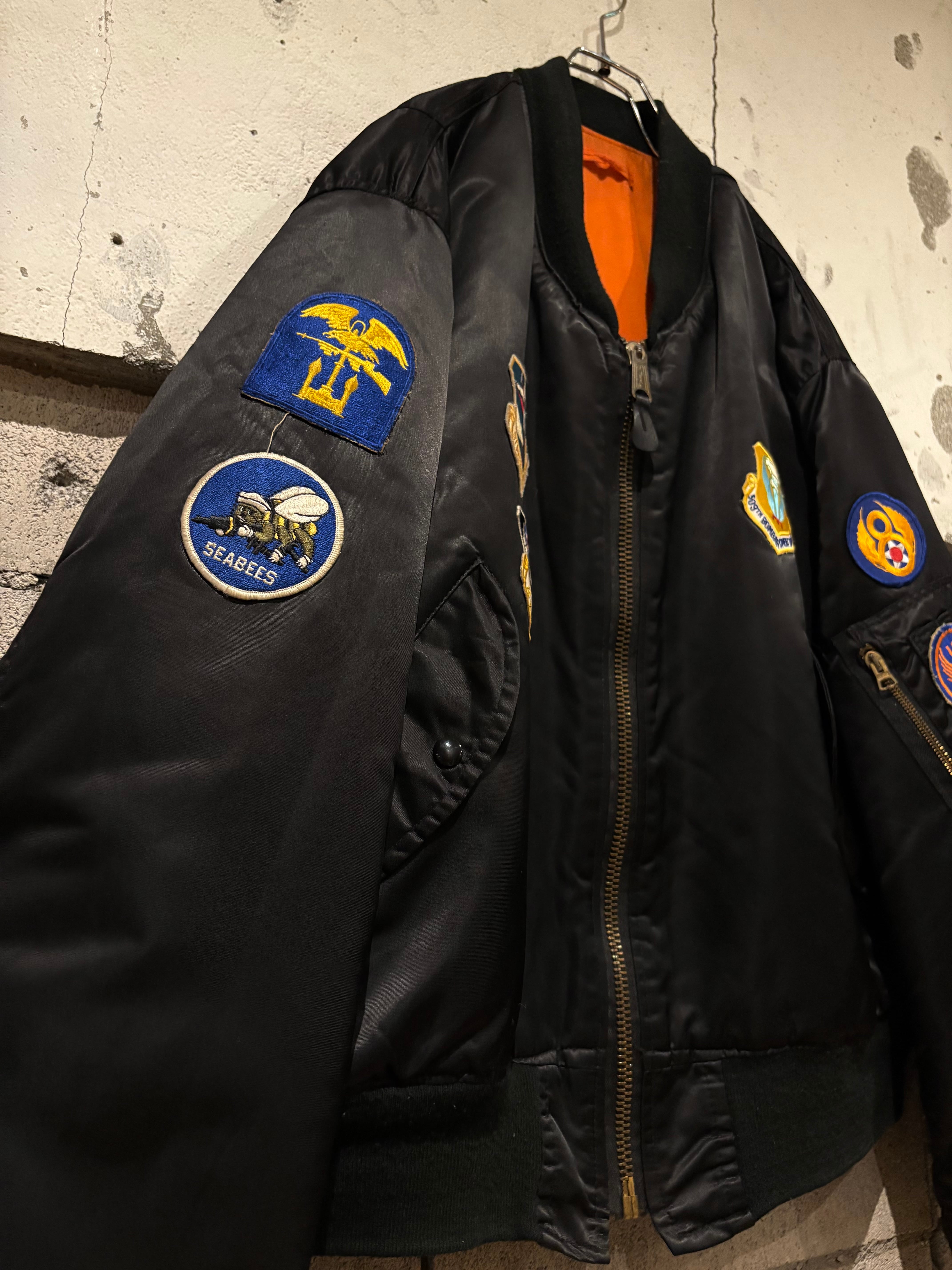 ミリタリーアイテムMA-1に、古着ならではの前所有者のカスタムを前面、袖等に載せた、唯一無二の一着をご紹介致します。