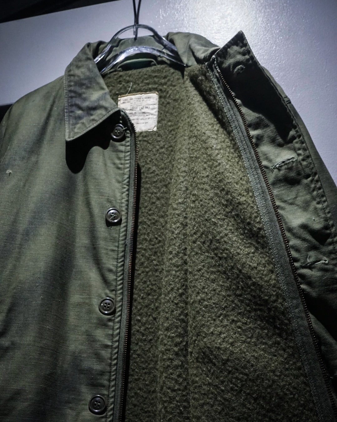 高密度で織られたナイロン、コットンシェルに、内側は防寒性を意識した起毛感のあるライニング。フロントはボタン+ジップの二重構造となっており、ミリタリーらしい計算されたディテールが随所に見られます。
