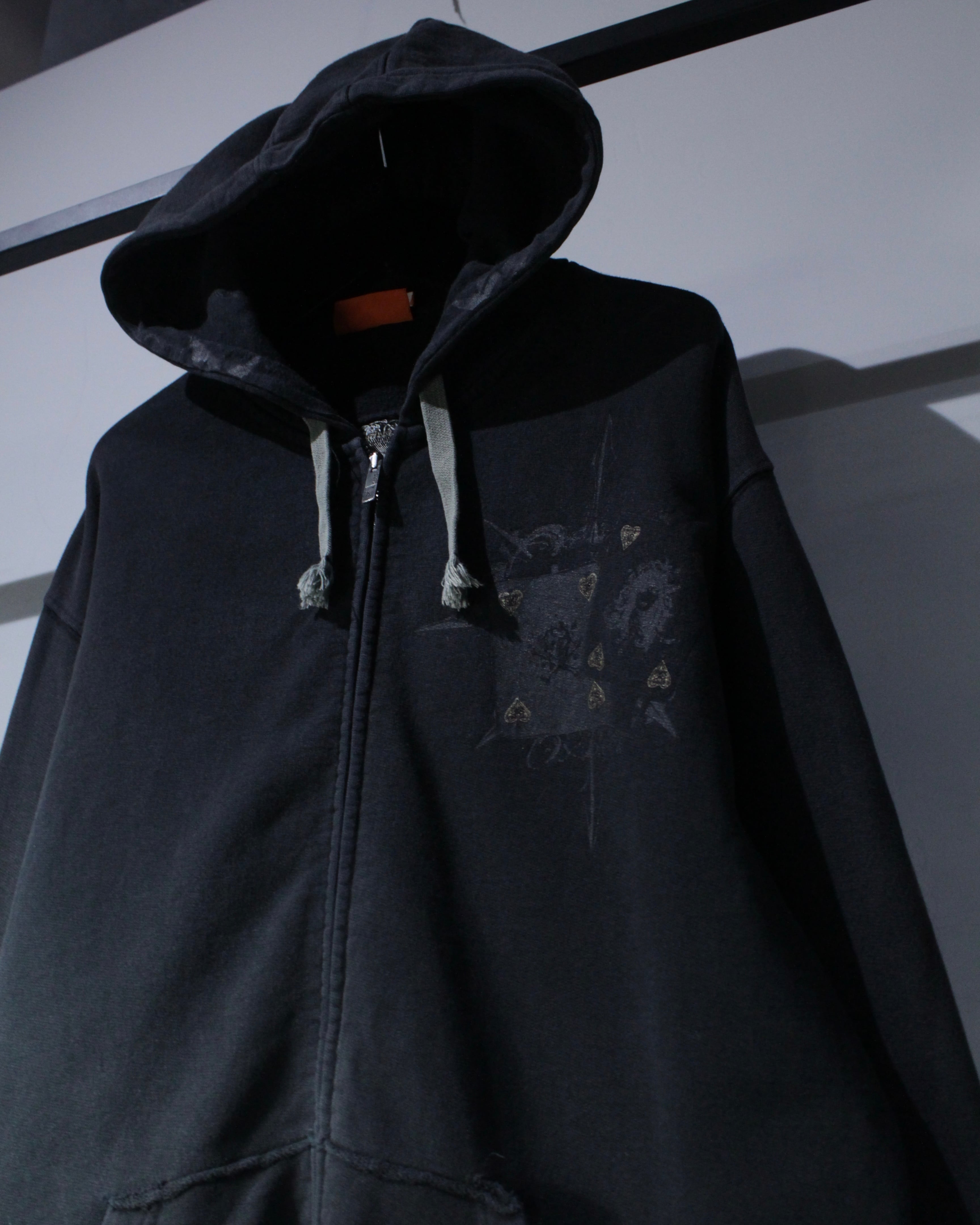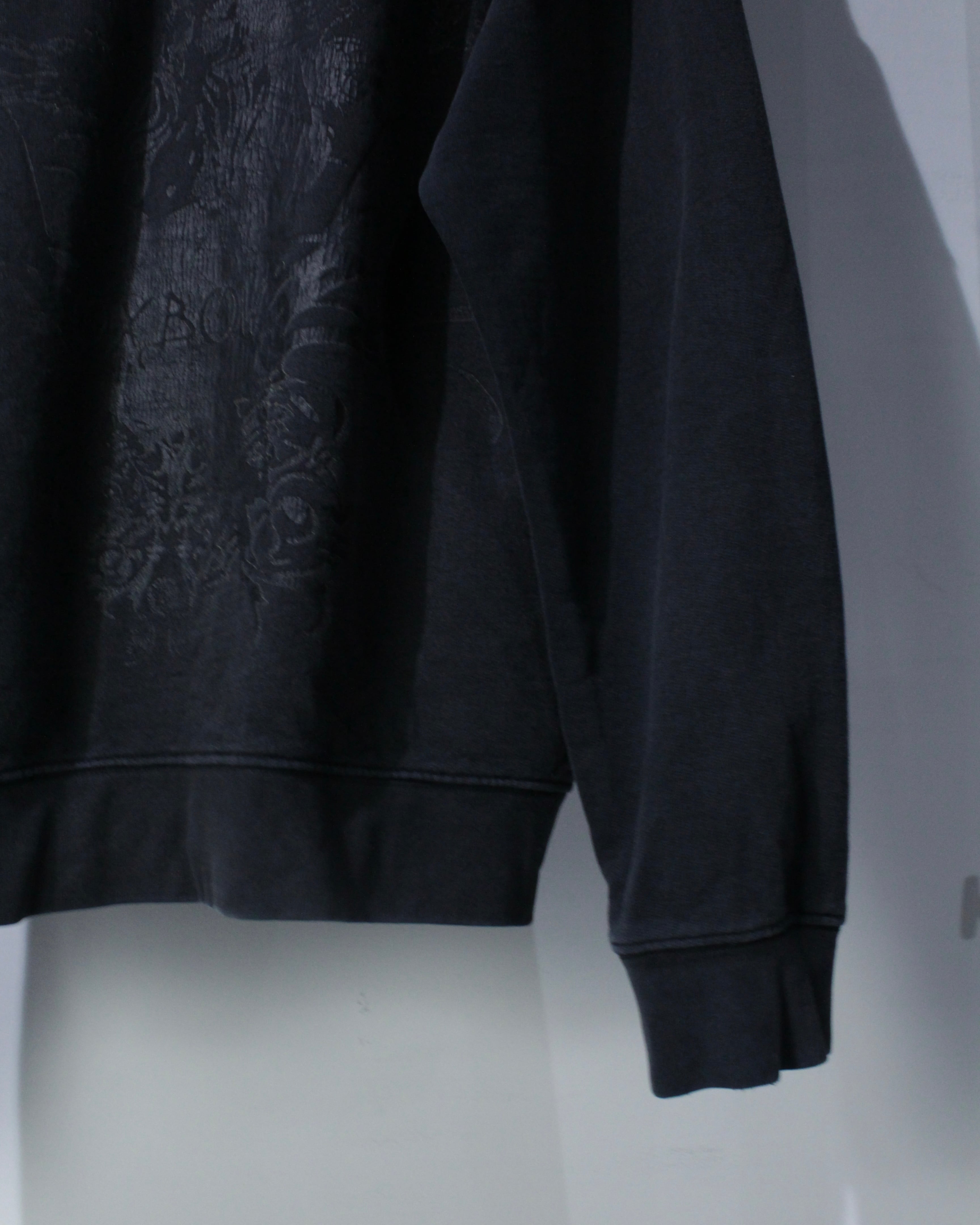 単なる色落ちではなく、黒がチャコールへと移ろうグラデーションが、時間の経過をそのまま表情として残しています。左胸、背面のプリントのアクセントも◎