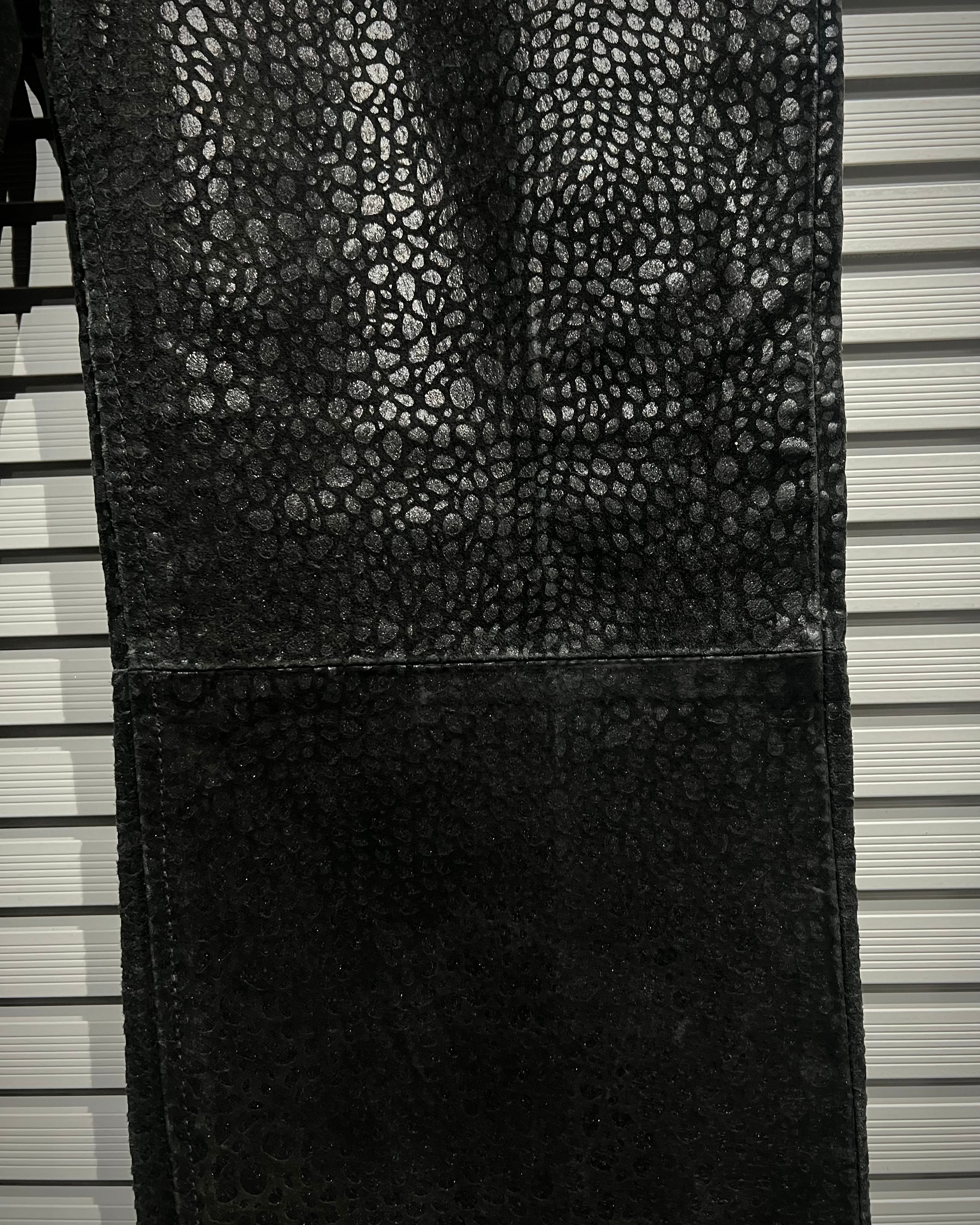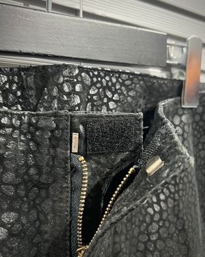 プリントによる柄表現のためレザーの硬さが抑えられ、動きに合わせてしなやかに馴染むのもポイント。光の当たり方で柄の浮き沈みが変わり、シンプルなトップスと合わせるだけでもスタイリングが完成します。
