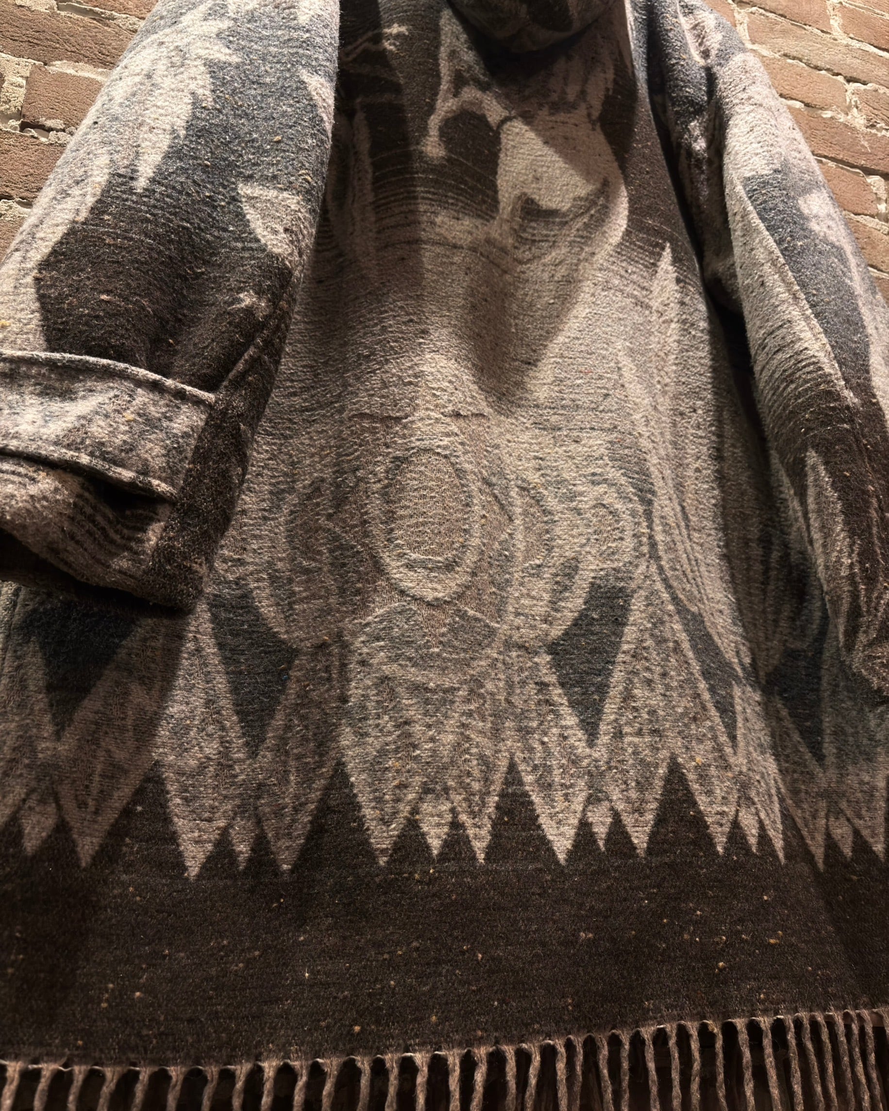 目を引くのは、全体に落とし込まれたユニコーンのグラフィック。幻想的かつ神秘性のあるデザインに、細かなネップが加わることで立体感と温かみのある表情を演出しています。裾にはフリンジを配し、着用時の動きもプラス。