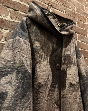 表地はウール主体の起毛感あるファブリックで、柔らかさと保温性を兼備。フード付きに加え、フロントはボタン仕様、袖口にはストラップを搭載するなど、アウターとしての完成度も非常に高い仕上がりです。