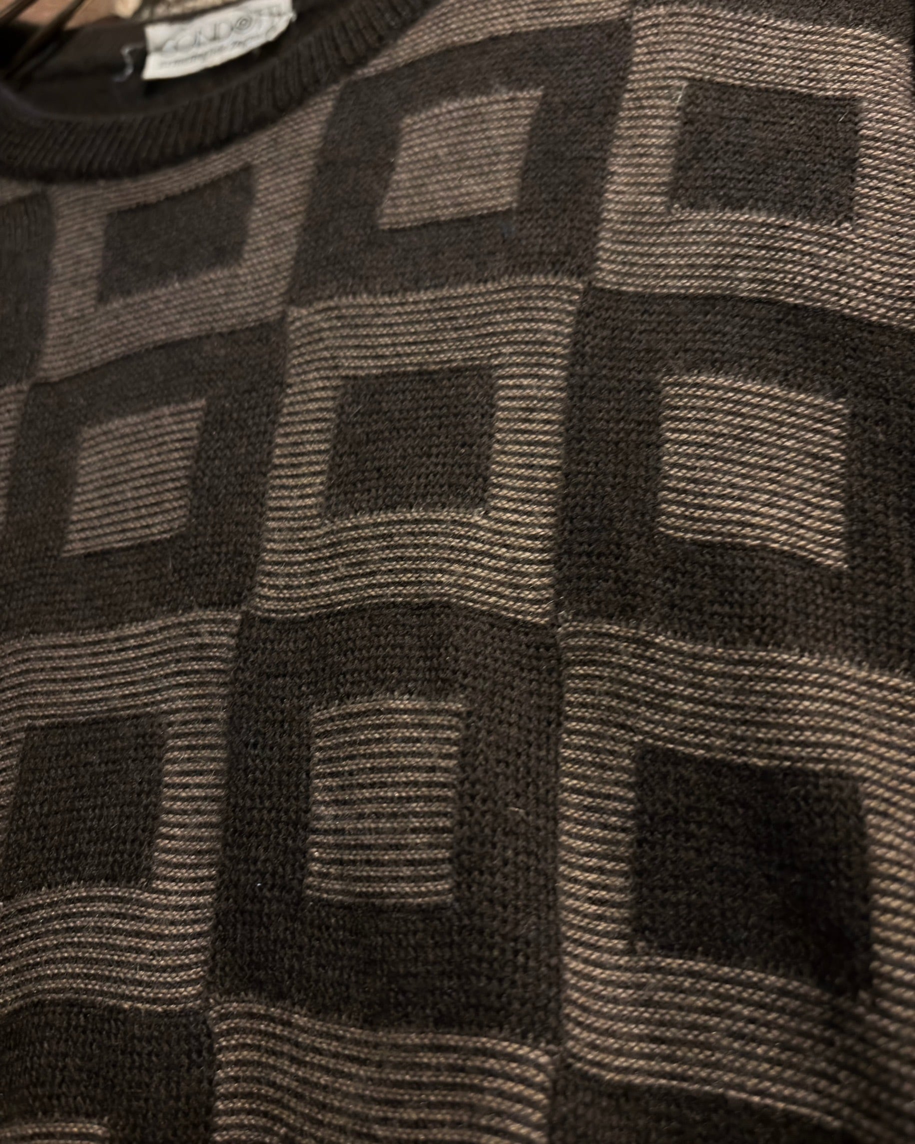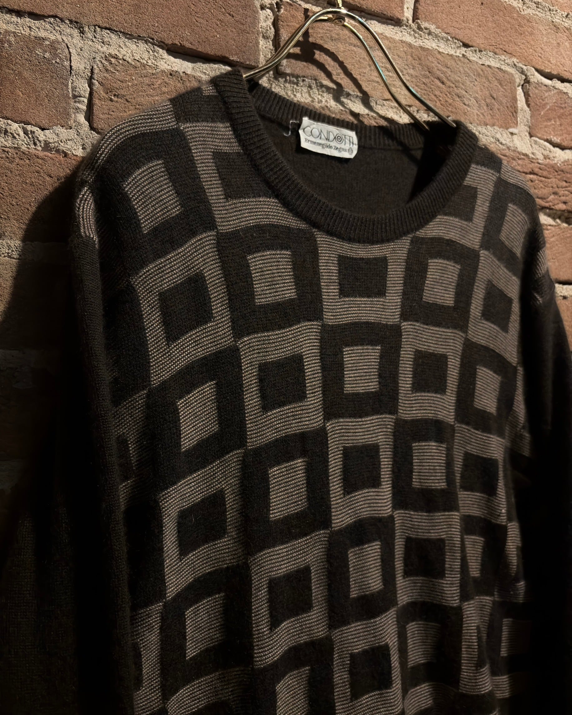 フロントにはスクエアモチーフを表現した幾何学的な編み柄を採用。ブラウンをベースに、トーンを抑えたベージュを組み合わせた配色は主張しすぎず、それでいて確かな存在感を放ちます。編み地の切り替えによる立体感もあり、独特な表情を楽しめる仕上がりです。