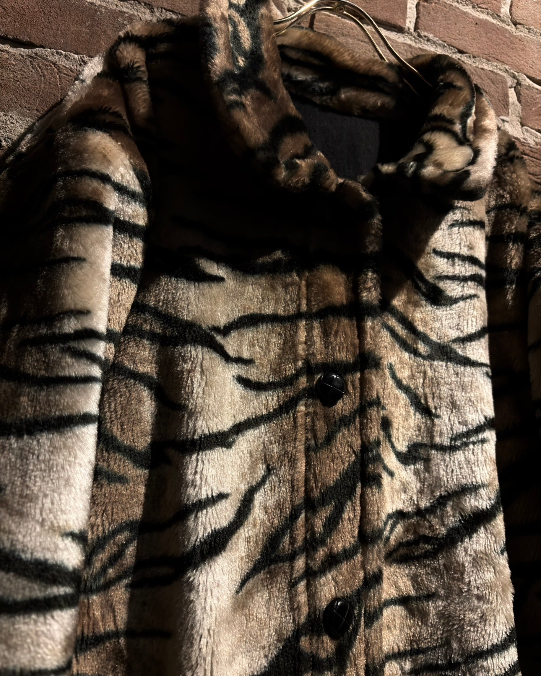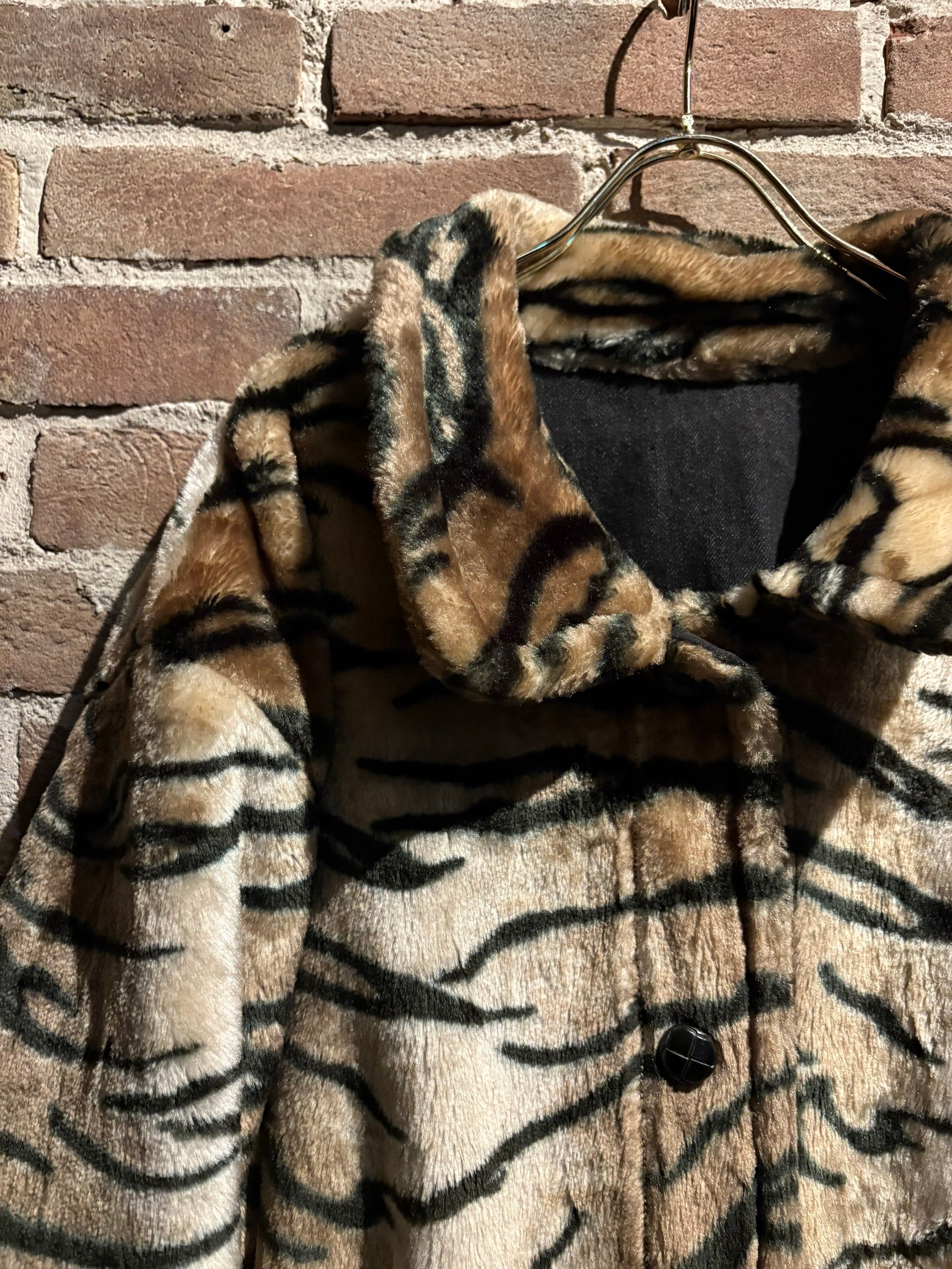 主役級の存在感を放つのは、毛足のあるファーに描かれたタイガーパターン。ラグジュアリーな柄ながら、過度に主張しすぎない絶妙なバランス感が魅力です。ファー特有の柔らかさとボリュームがあり、羽織るだけでスタイリングに奥行きを与えてくれます。