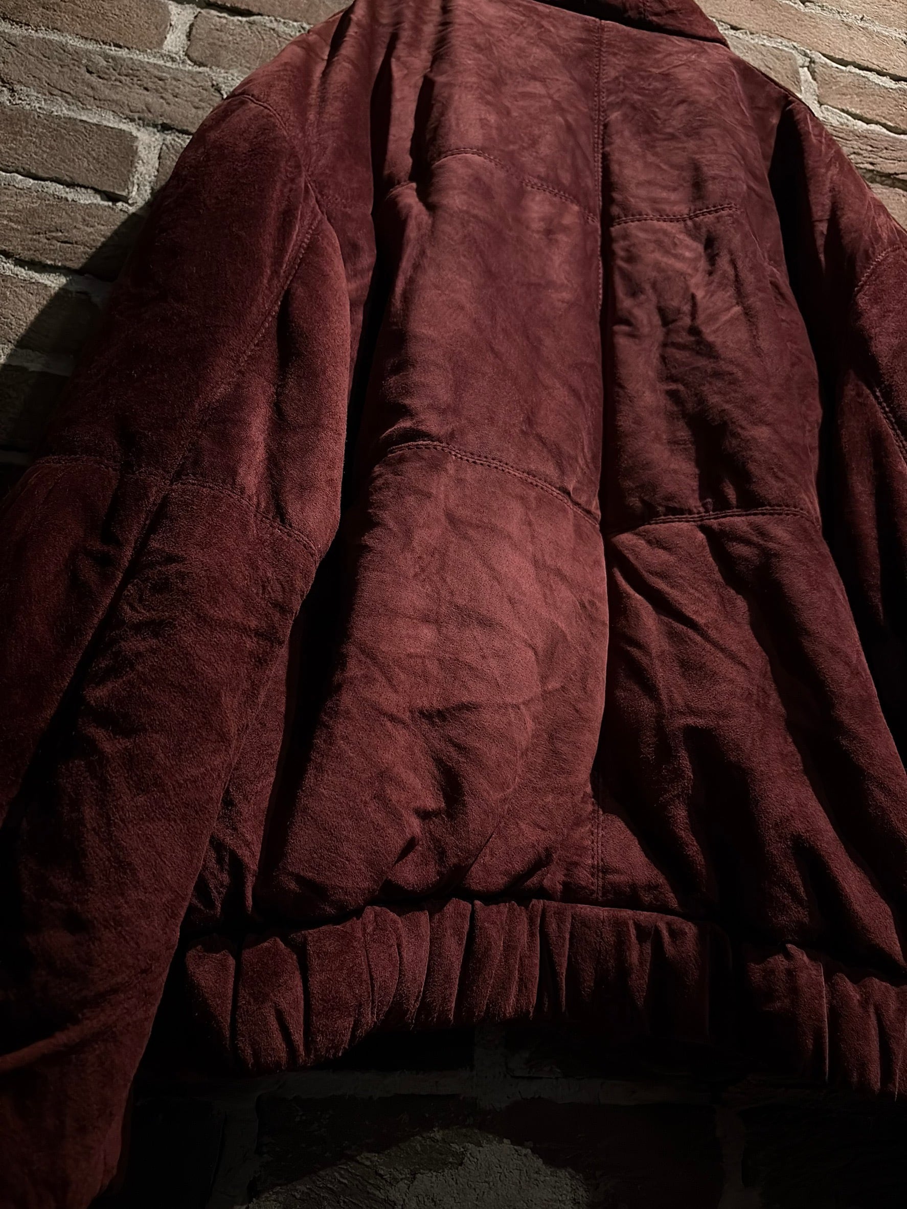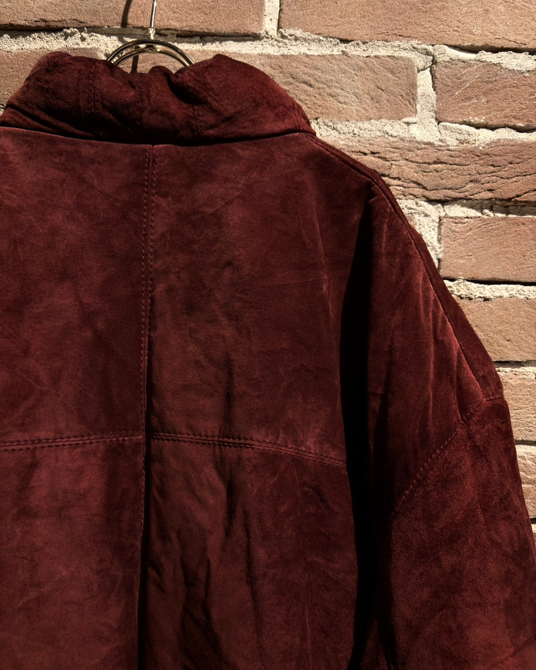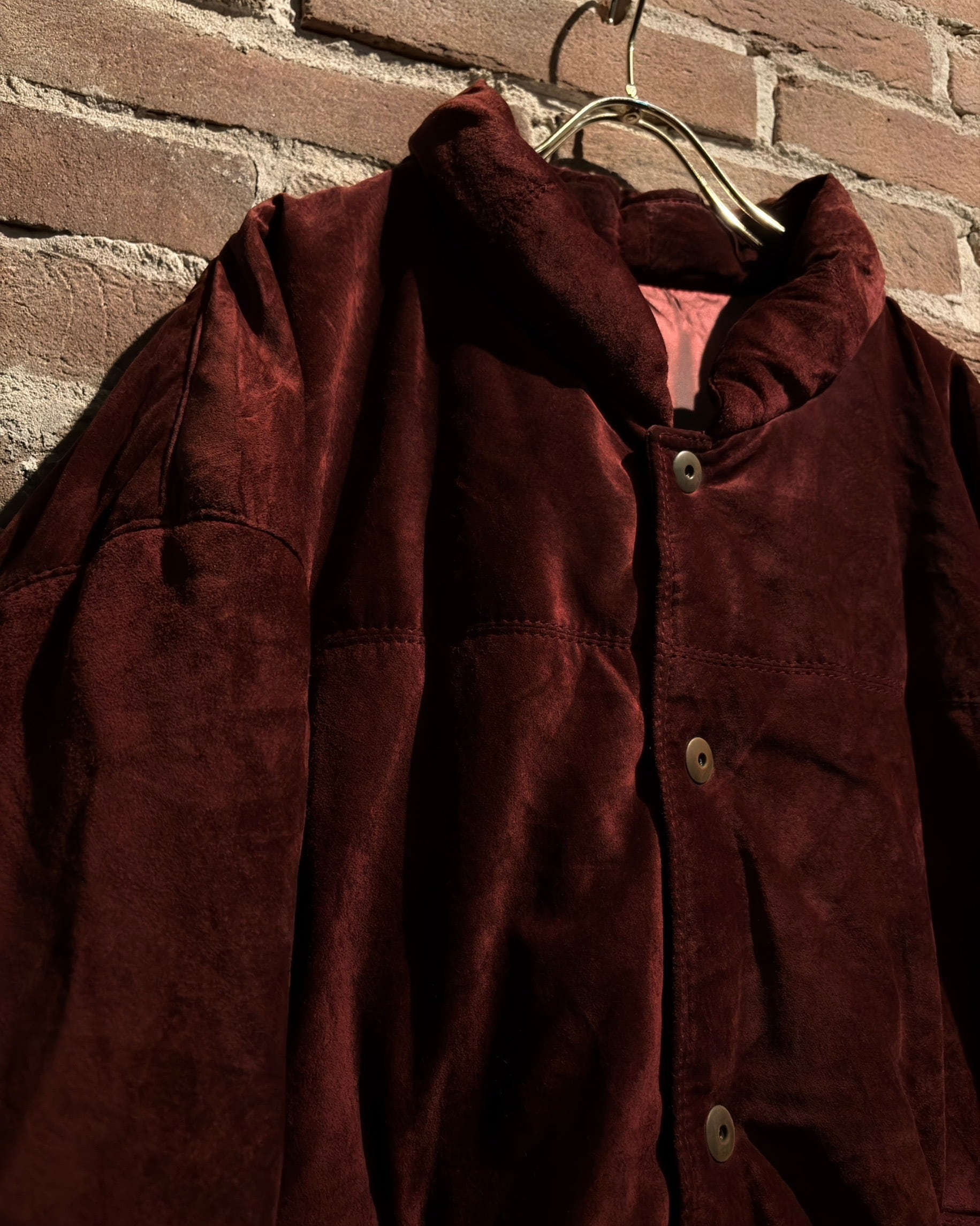 深みのあるボルドーカラーに、スエード特有の柔らかな陰影が重なり、光の当たり方によって表情が変化。シンプルながら、色気のある雰囲気を存分に漂わせる1着です。