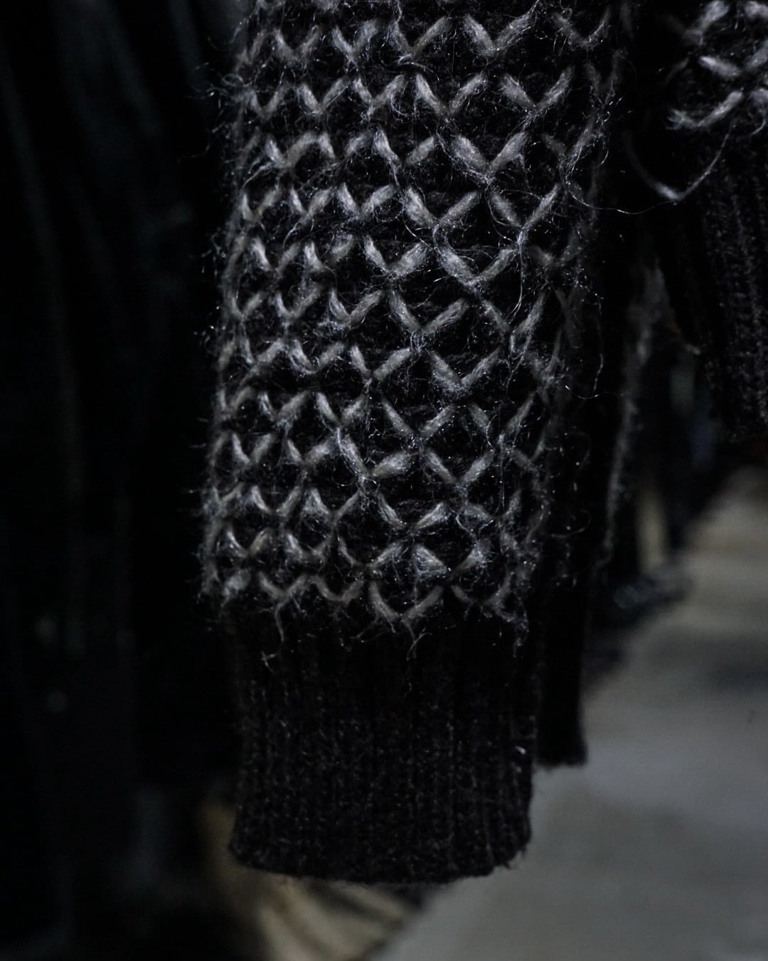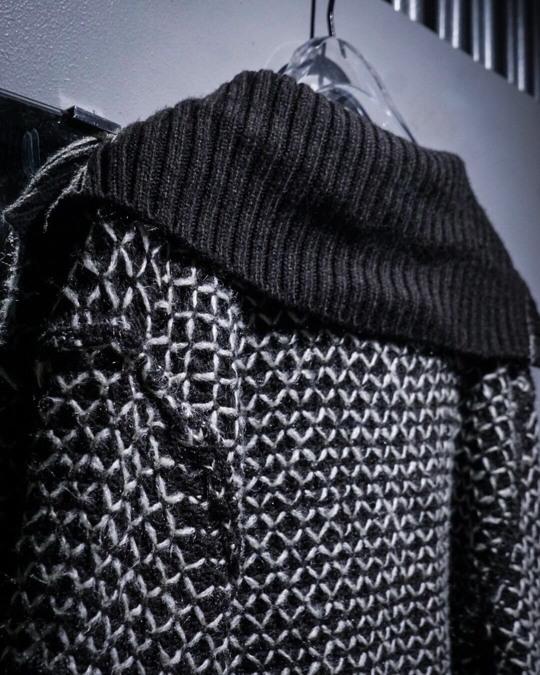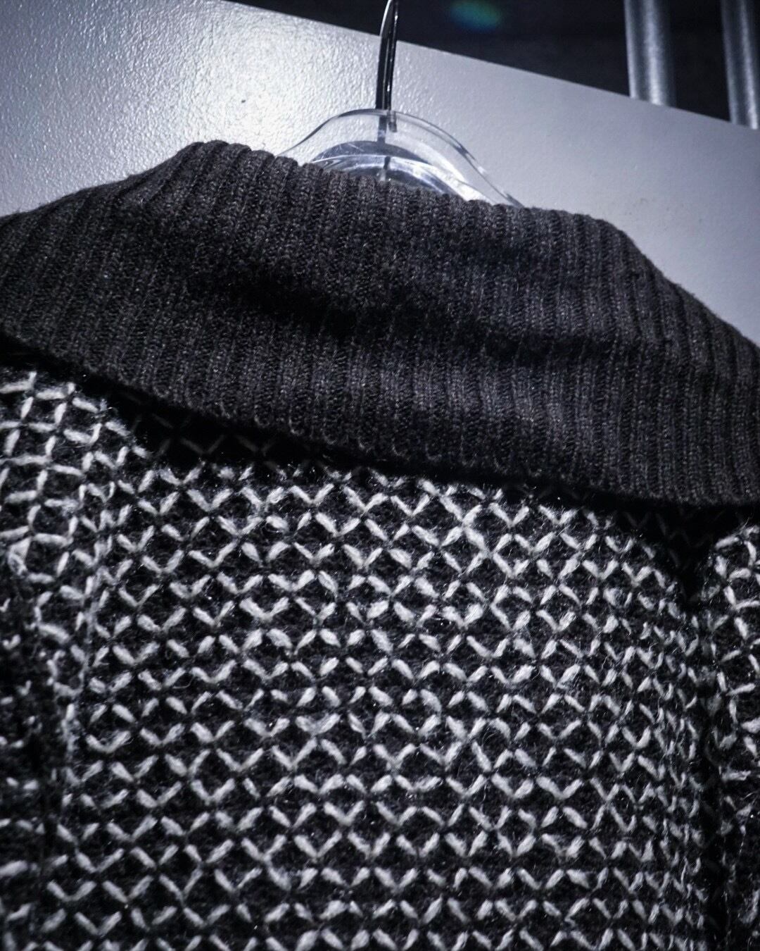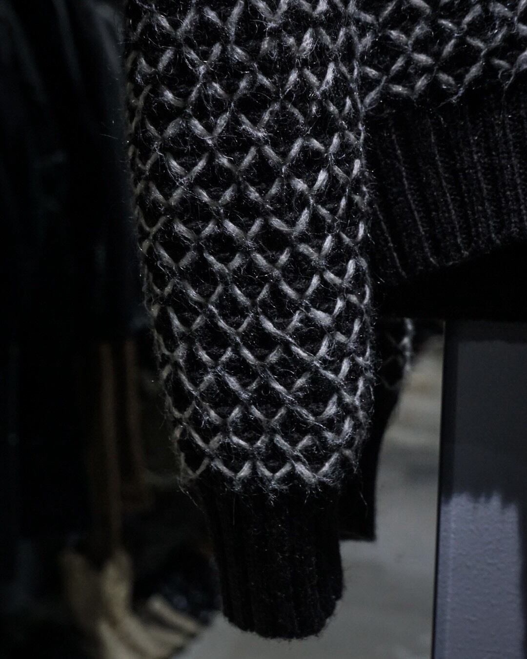 ブラックをベースに、ホワイトの糸を重ねた立体感のある編み柄が全面に広がり、単色ながら奥行きのある表情を生み出しています。