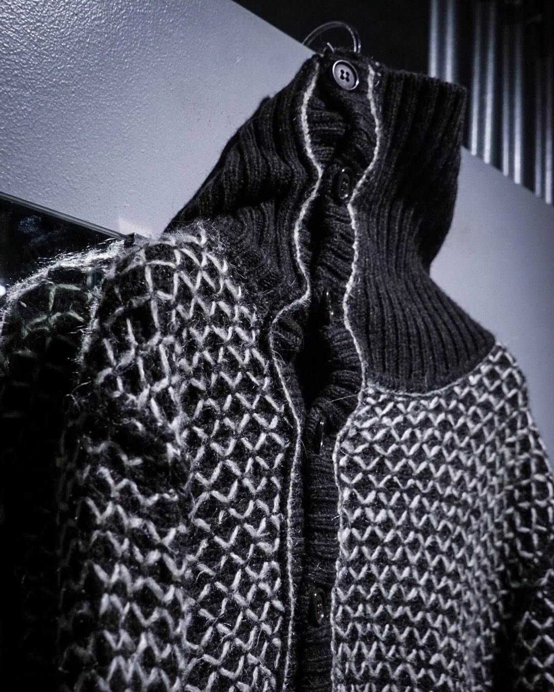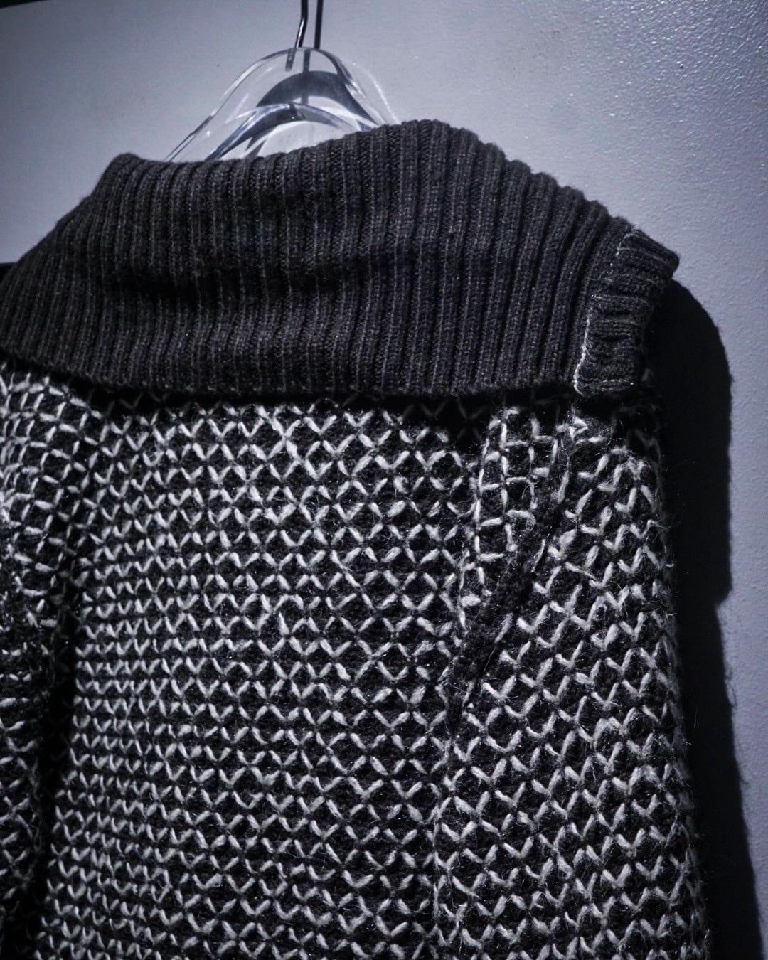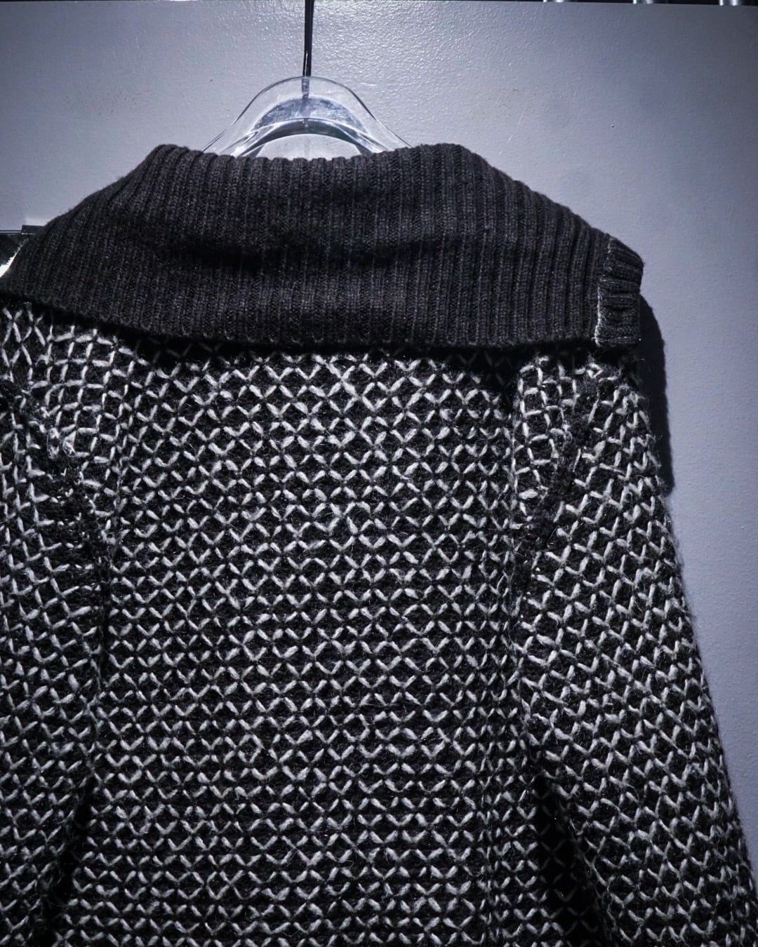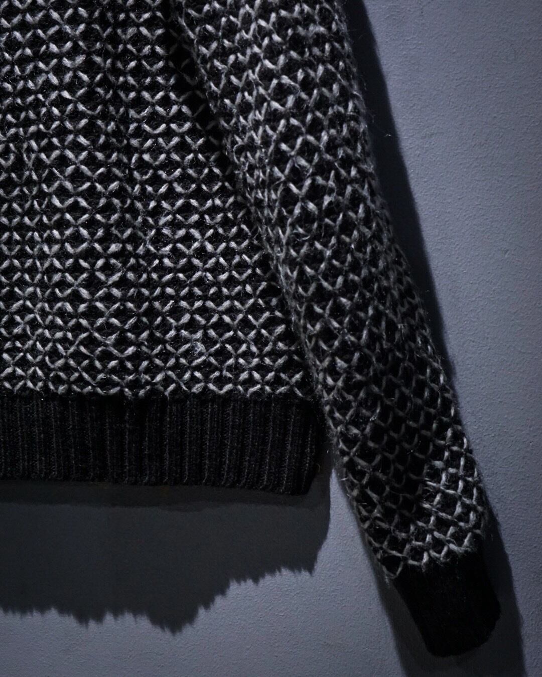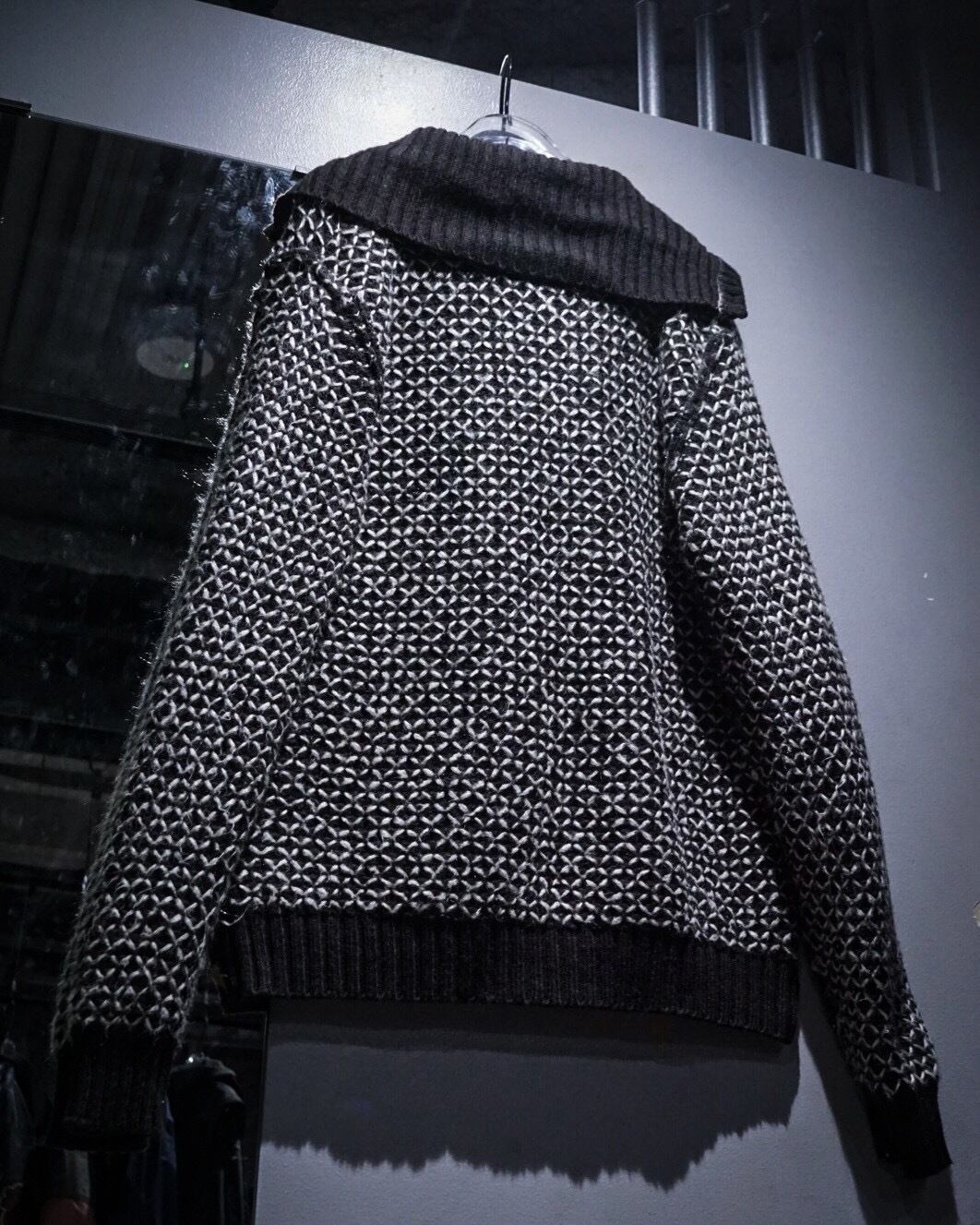 ブラックをベースに、ホワイトの糸を重ねた立体感のある編み柄が全面に広がり、単色ながら奥行きのある表情を生み出しています。