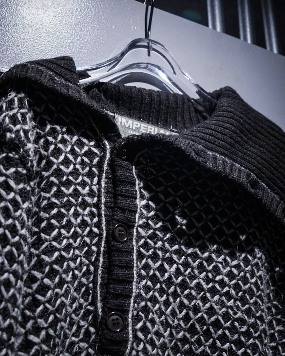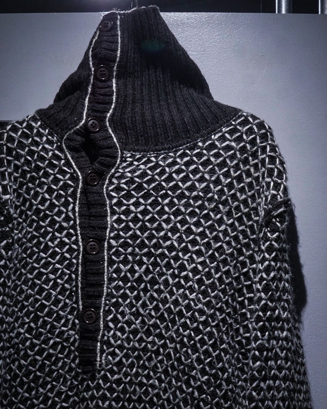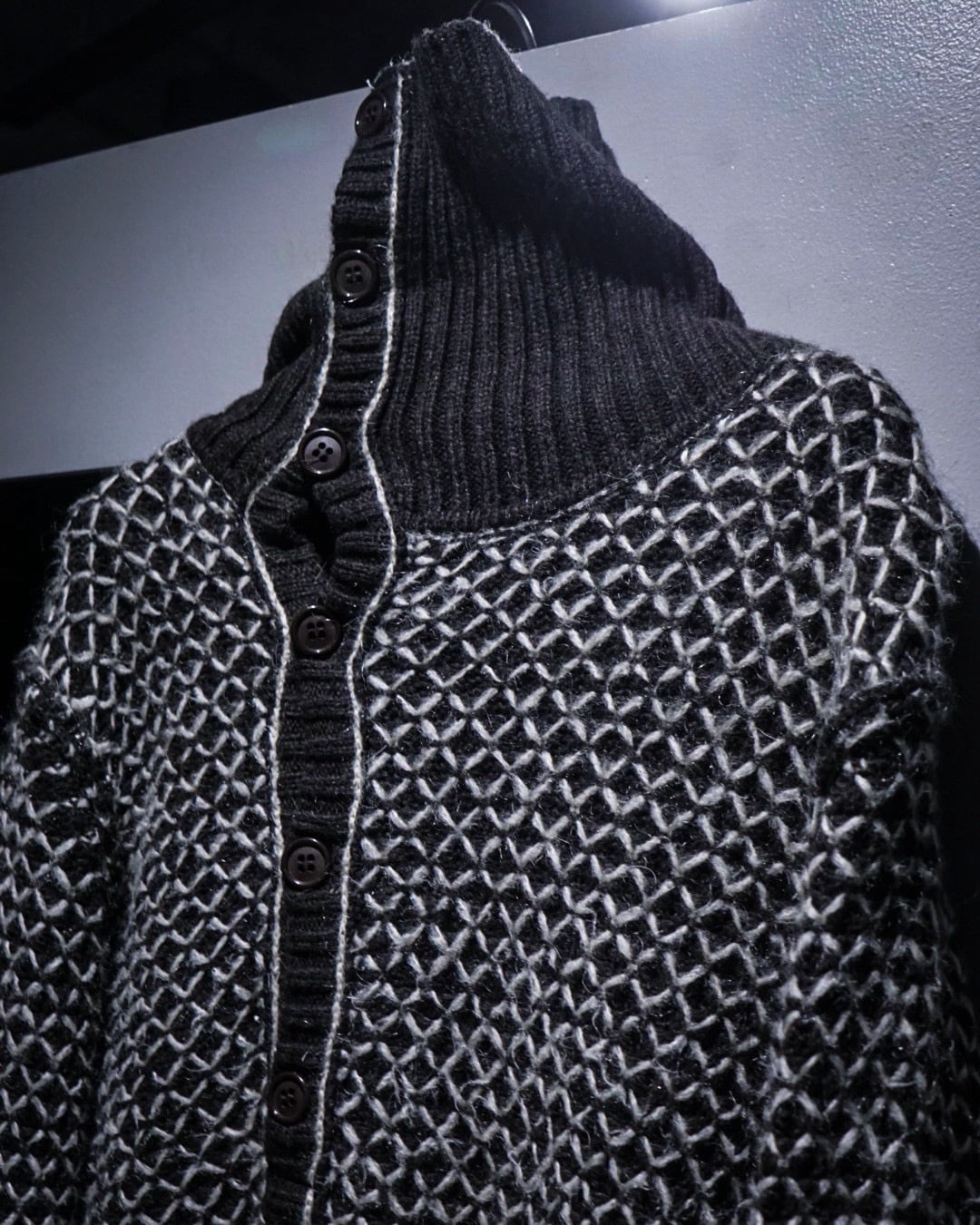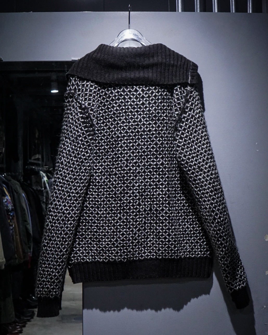 ブラックをベースに、ホワイトの糸を重ねた立体感のある編み柄が全面に広がり、単色ながら奥行きのある表情を生み出しています。