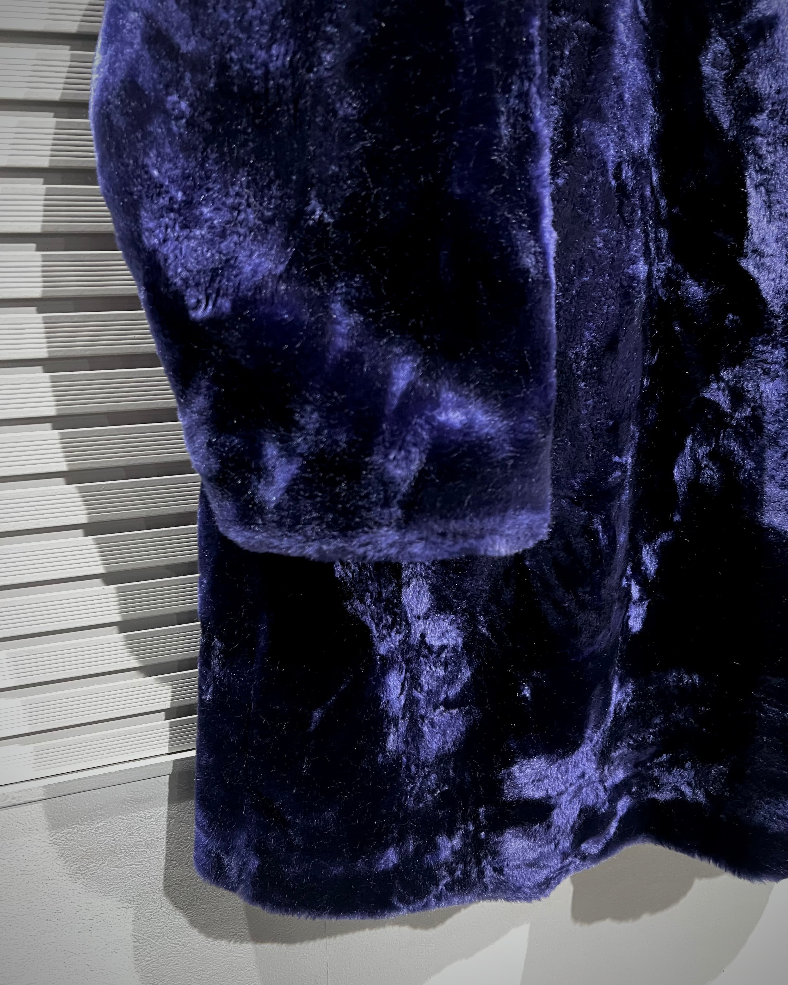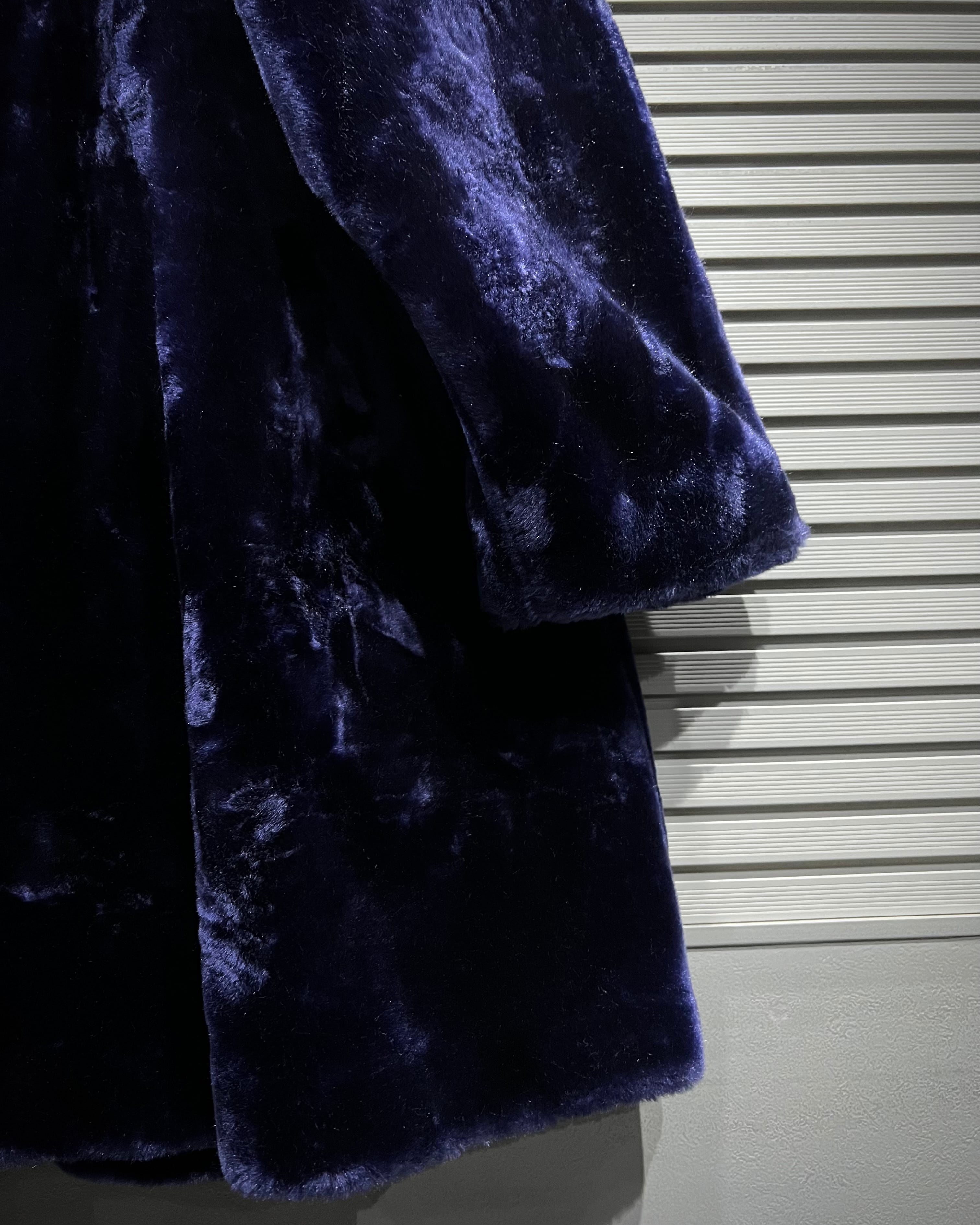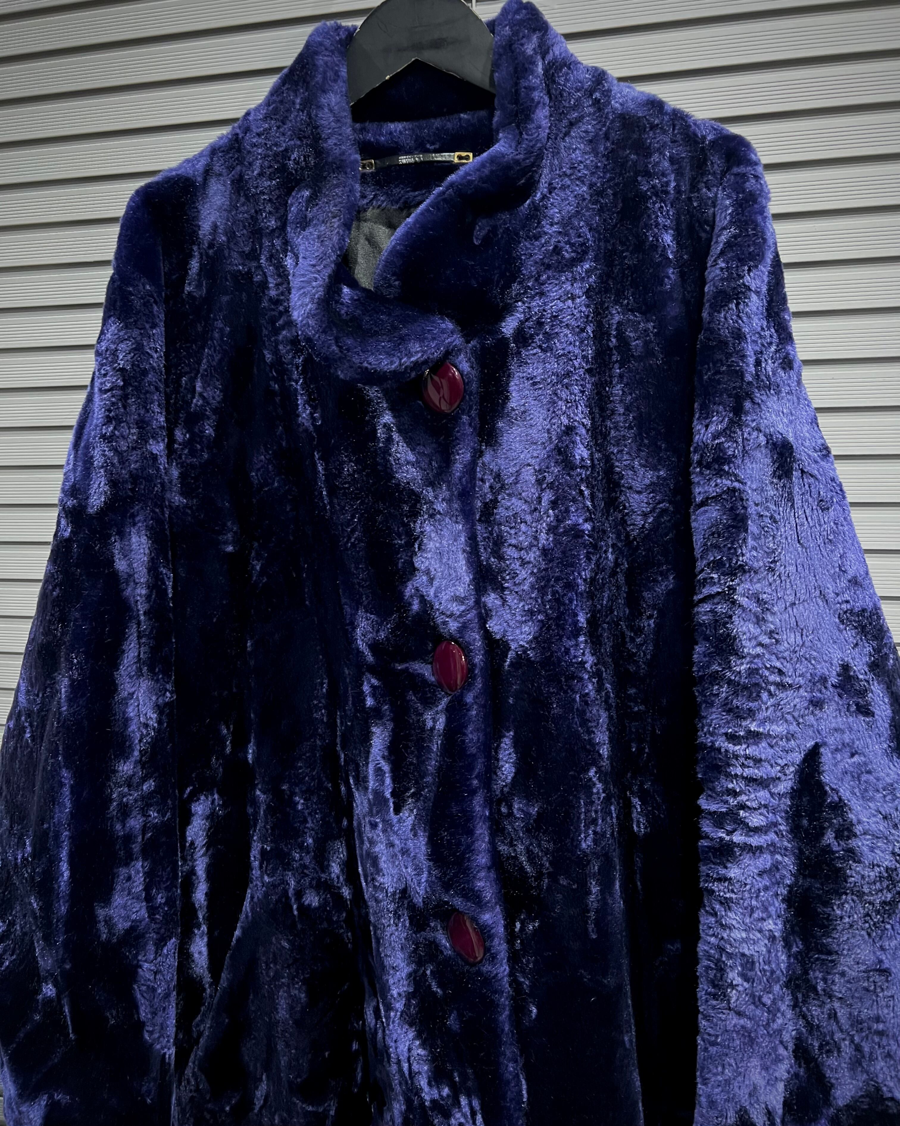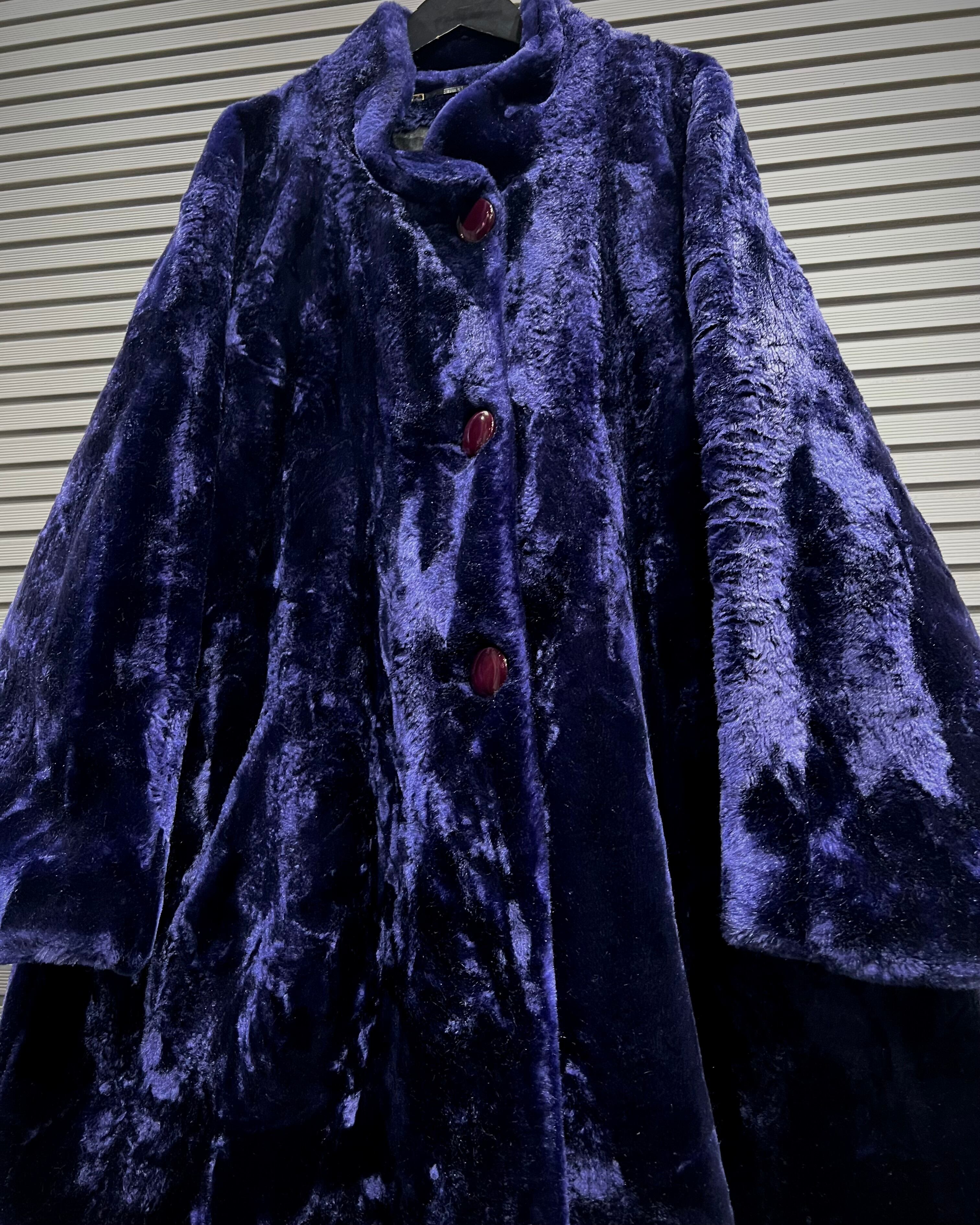 深みのあるパープルが目を引く、フェイクファーコート。