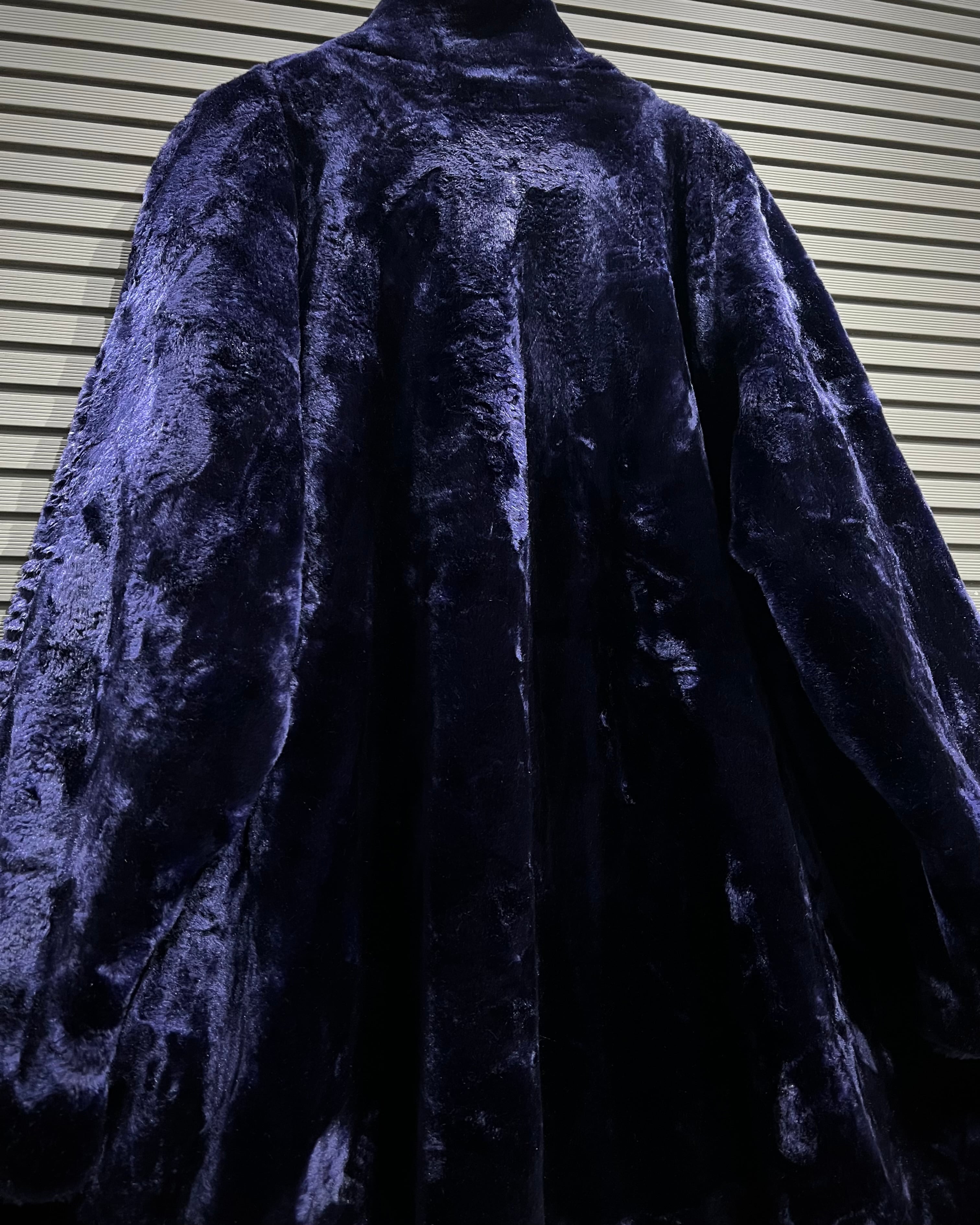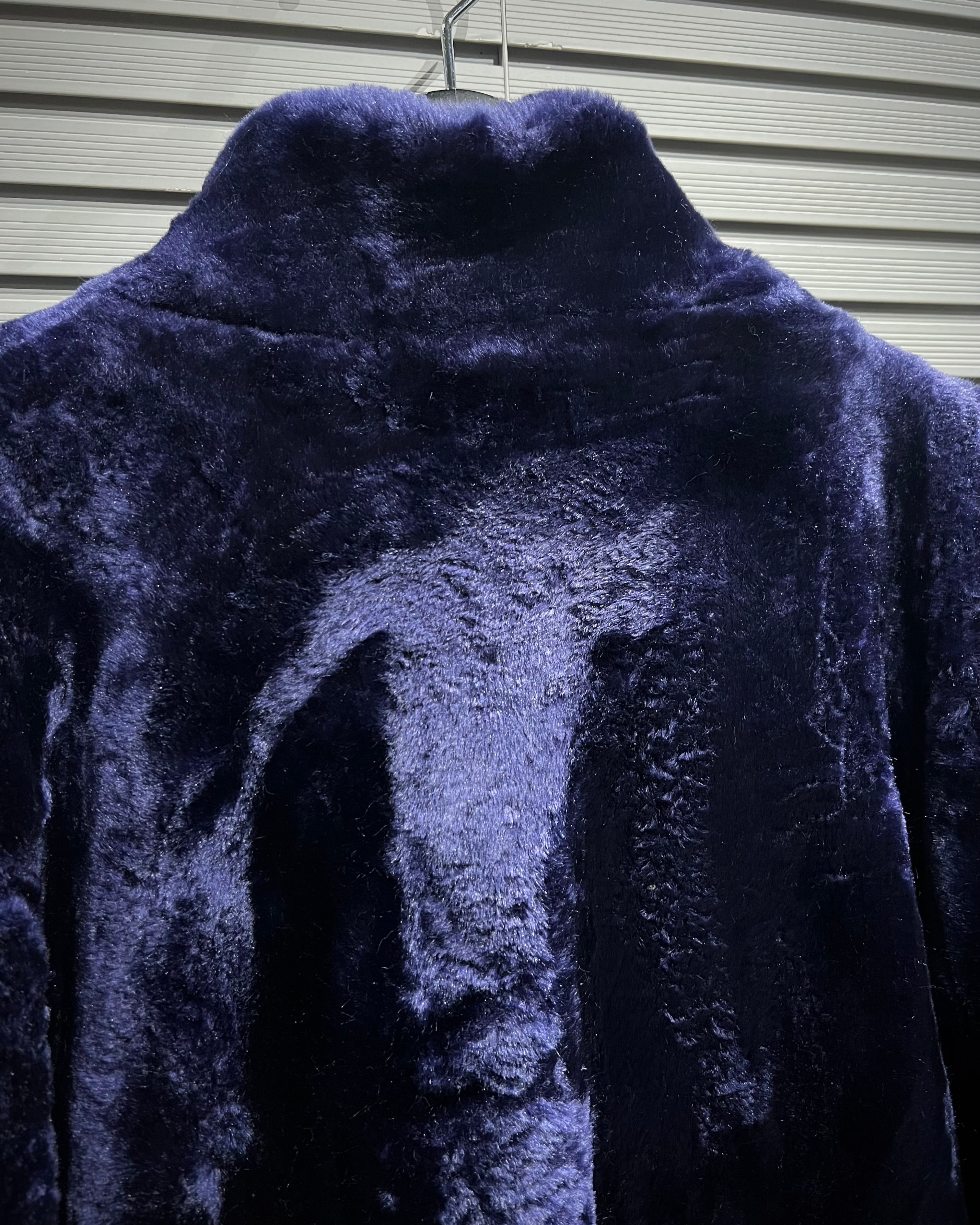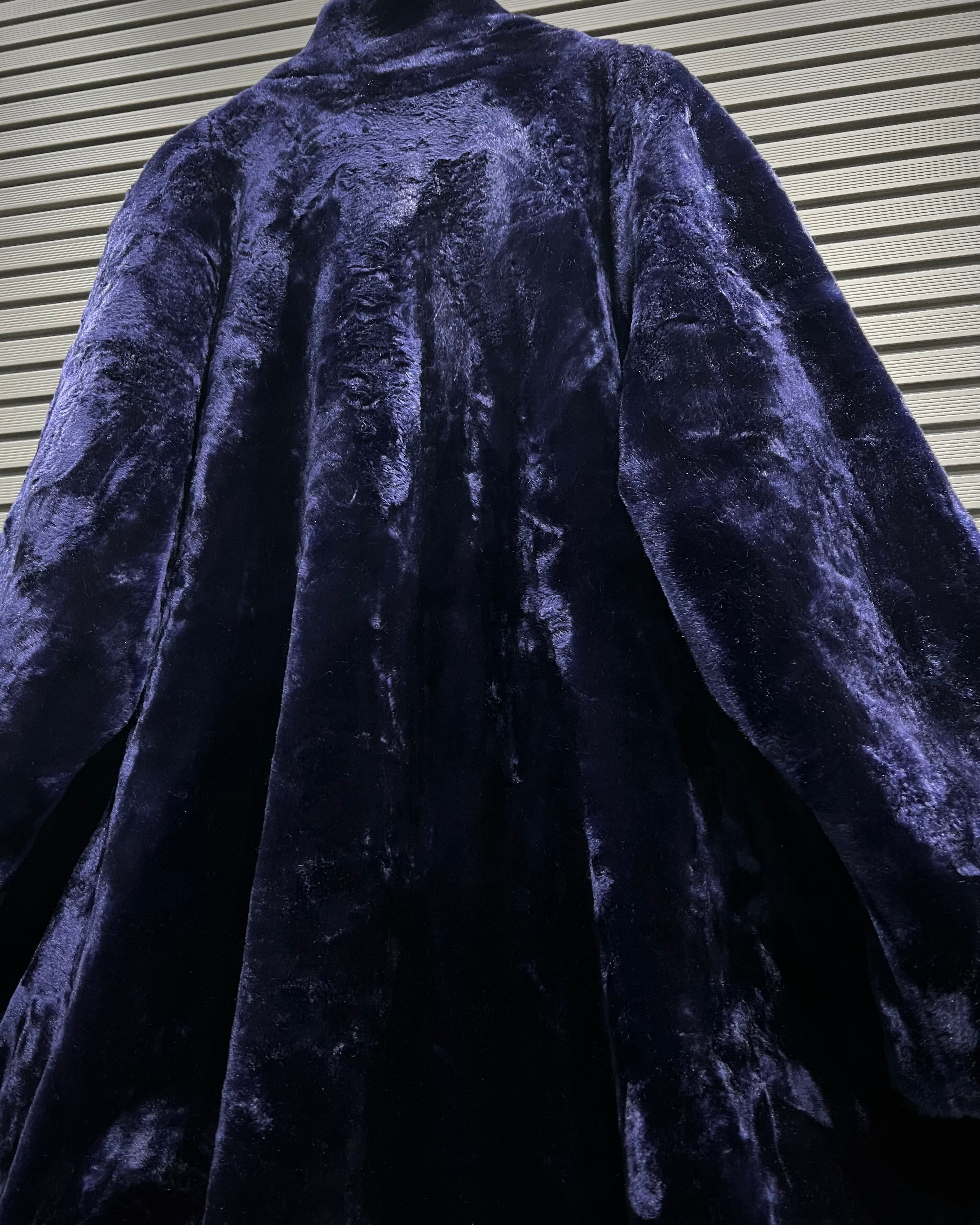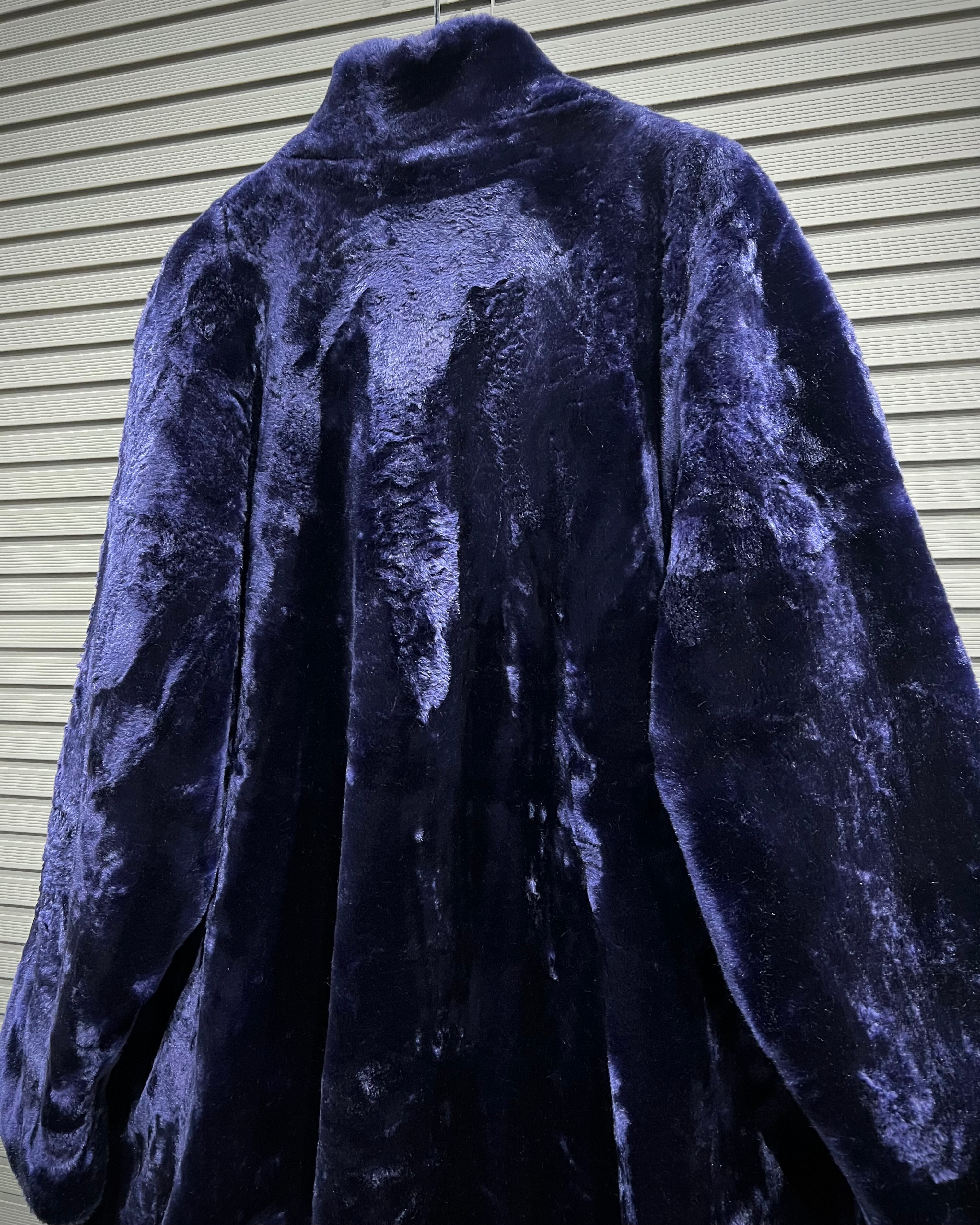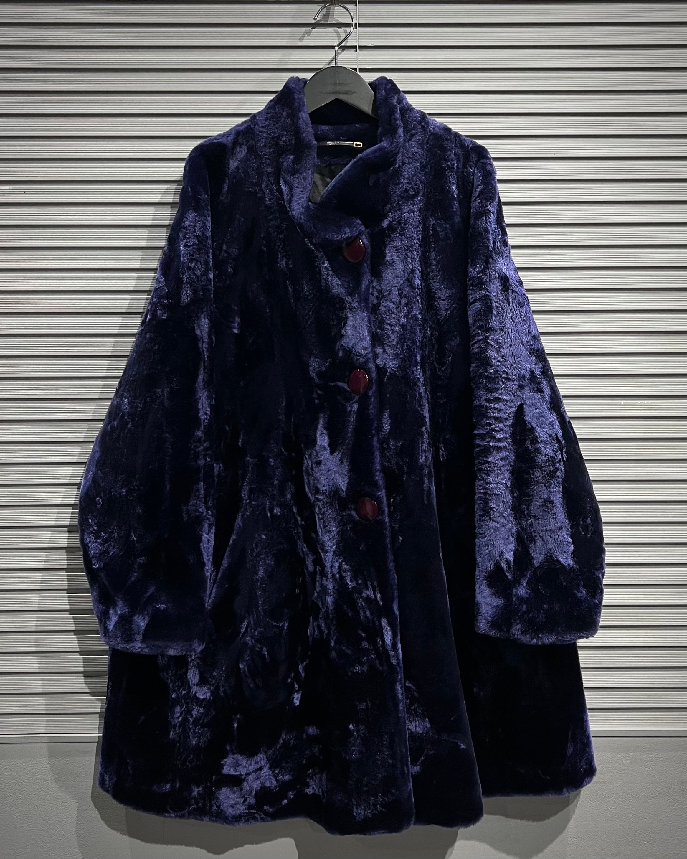 深みのあるパープルが目を引く、フェイクファーコート。