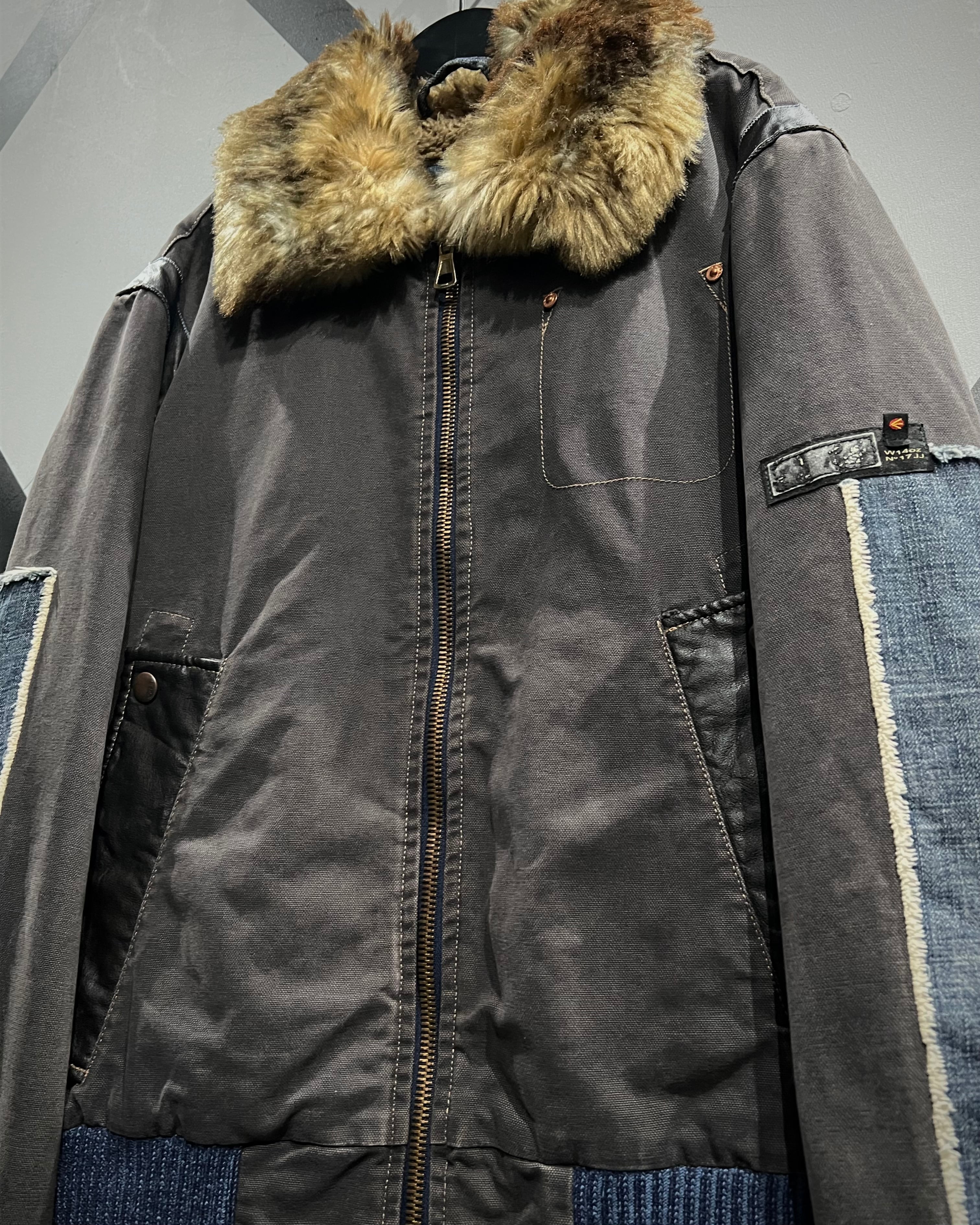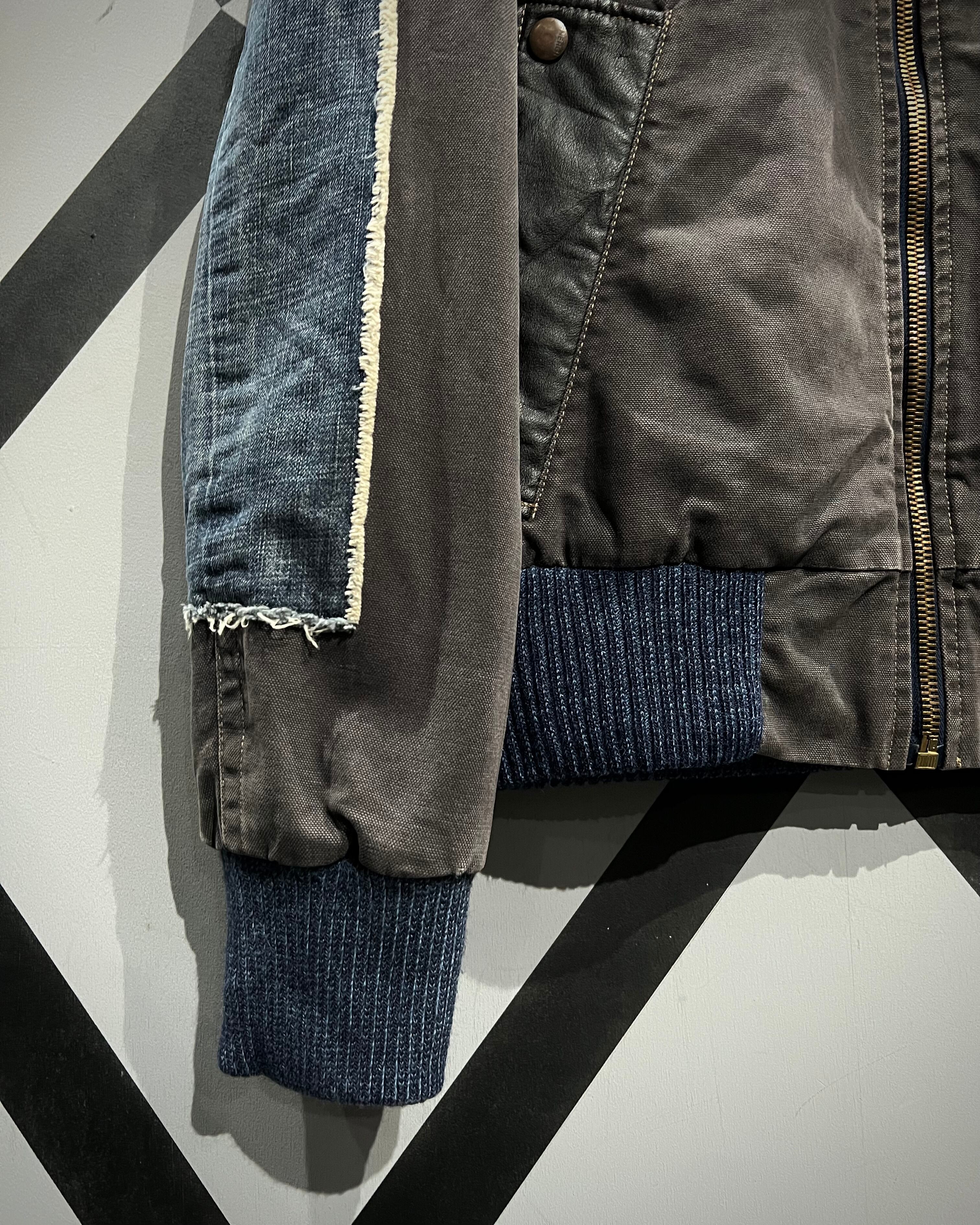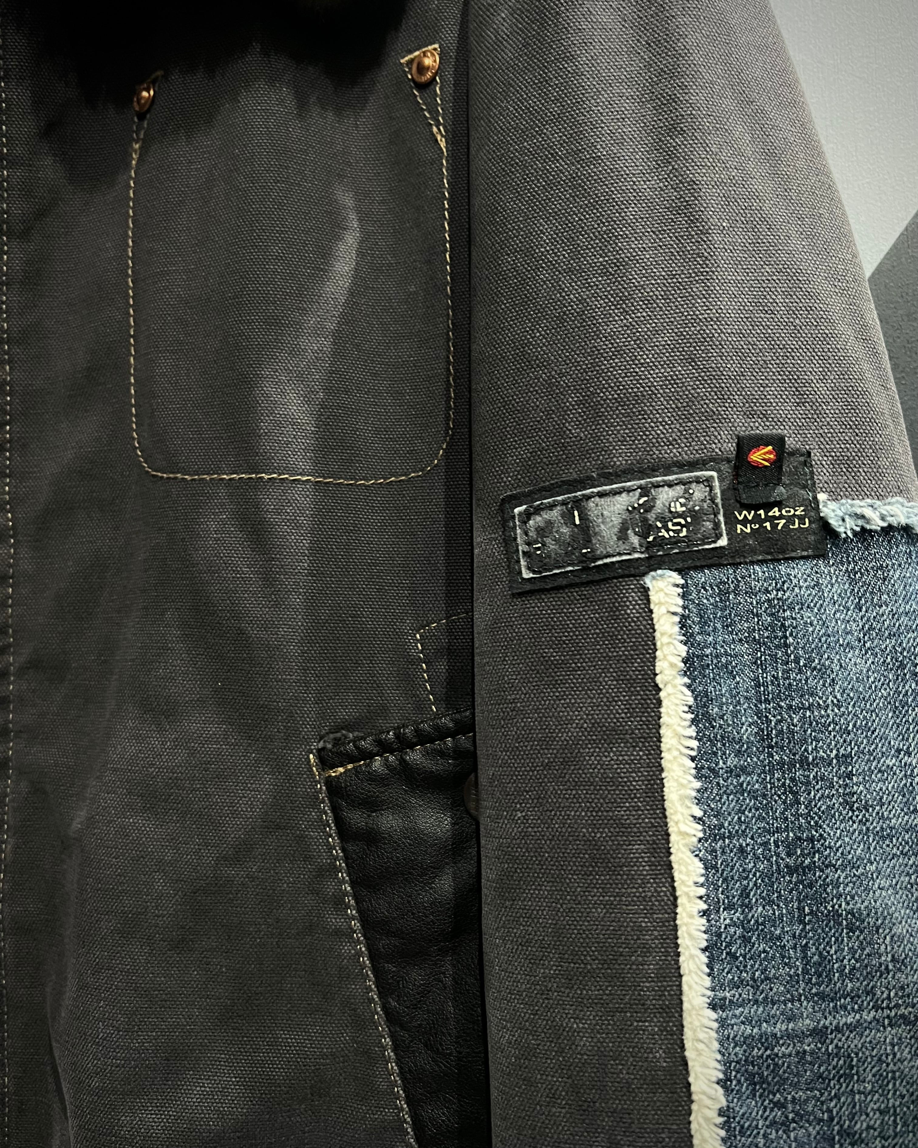 ボディはタフなグレートーンのファブリックをベースに、ポケットや肩周りにはレザーを切り替えで配置。さらに袖にはデニム生地を採用し、素材選びとデザインセンスに“ENERGIE”らしい空気感が色濃く反映されています。