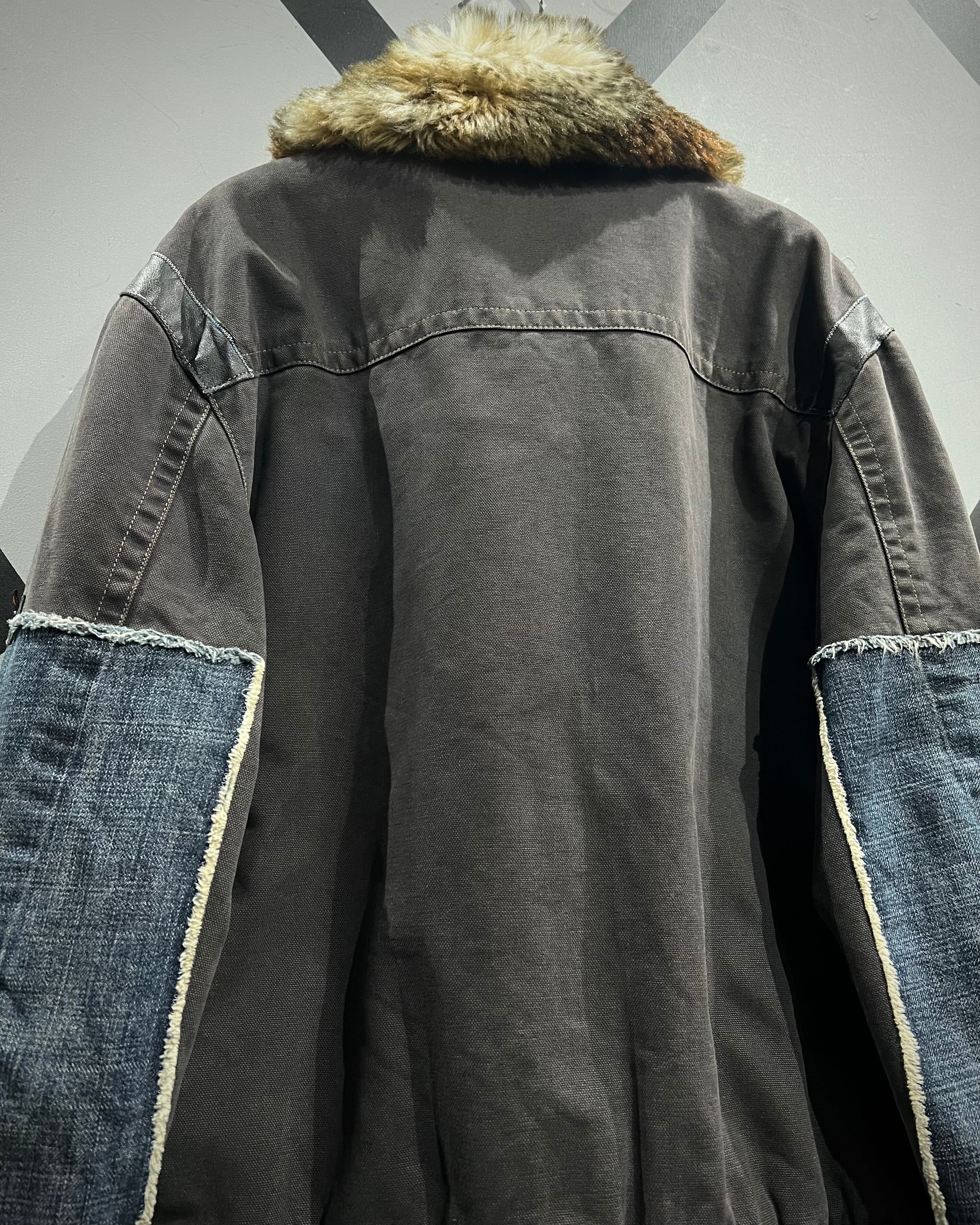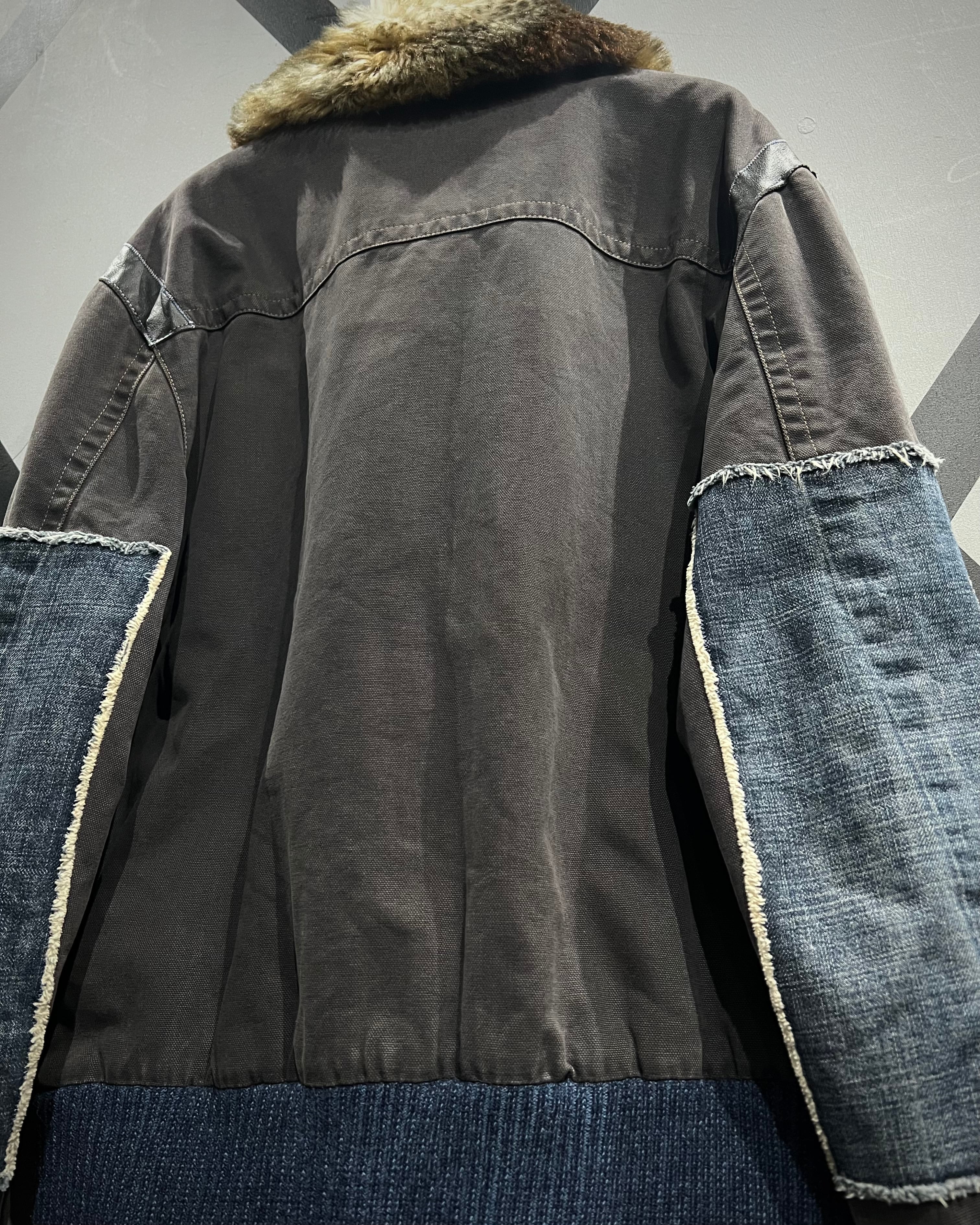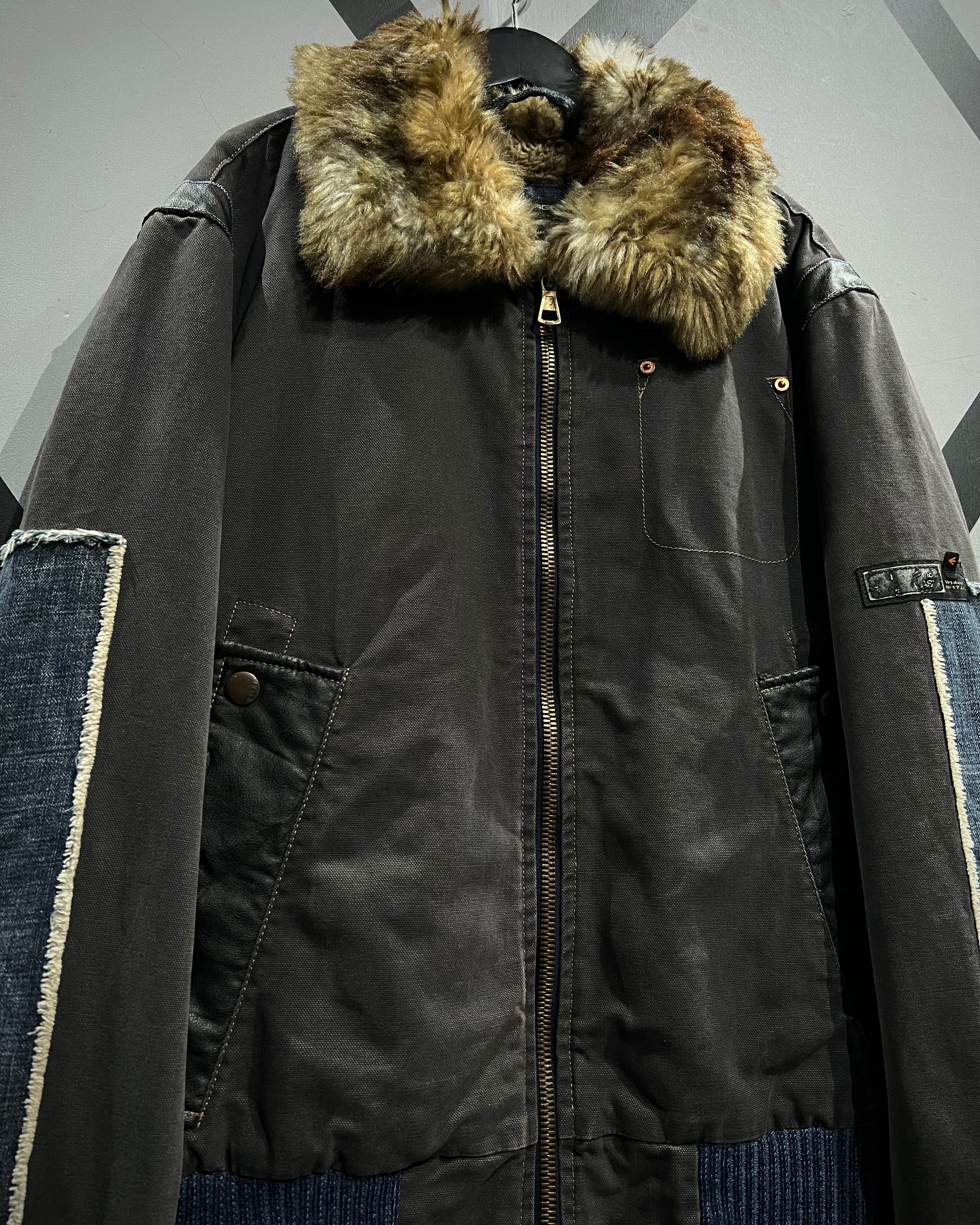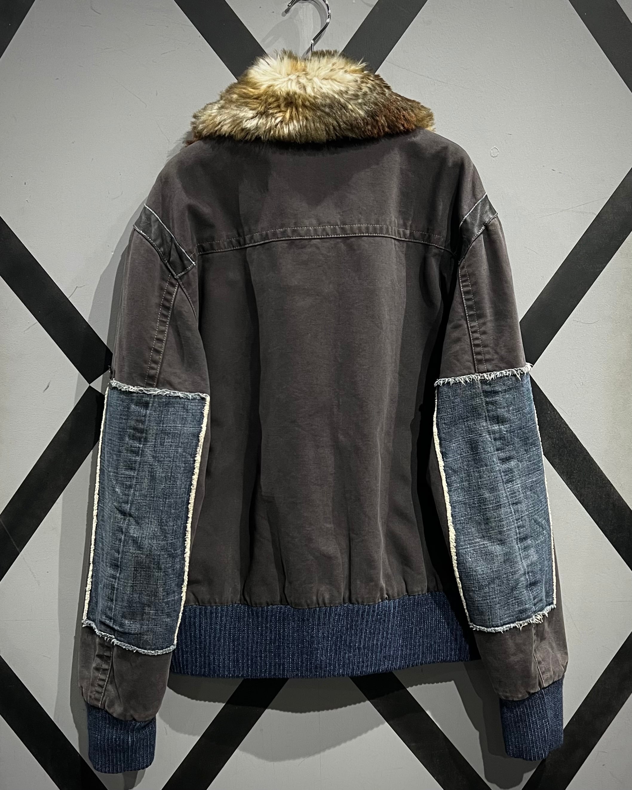 ボディはタフなグレートーンのファブリックをベースに、ポケットや肩周りにはレザーを切り替えで配置。さらに袖にはデニム生地を採用し、素材選びとデザインセンスに“ENERGIE”らしい空気感が色濃く反映されています。