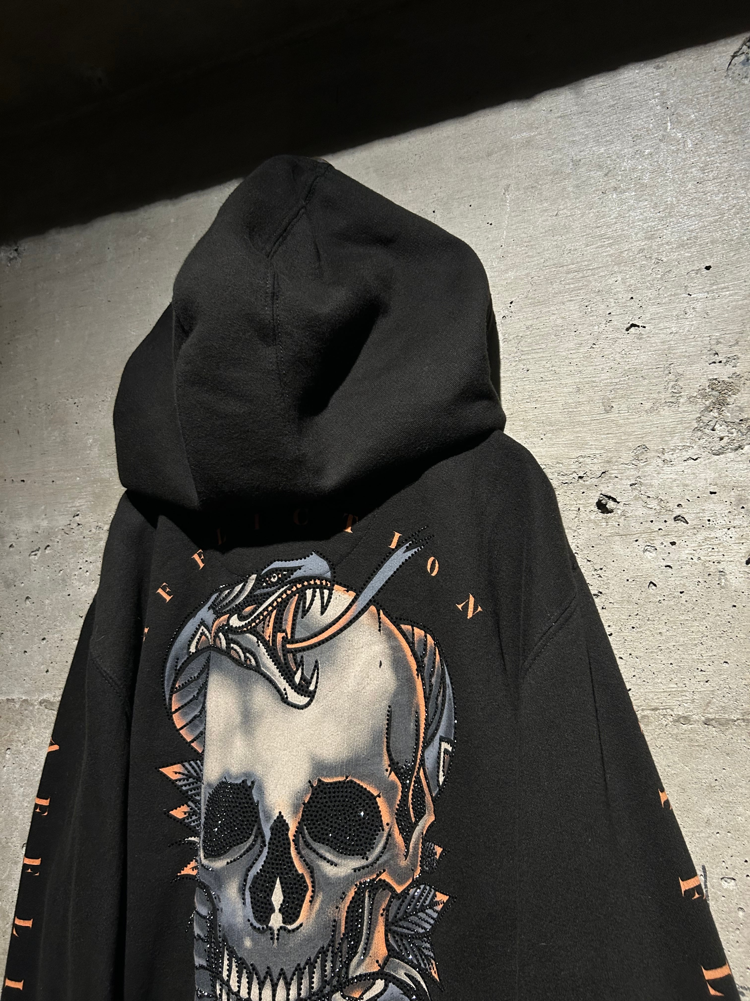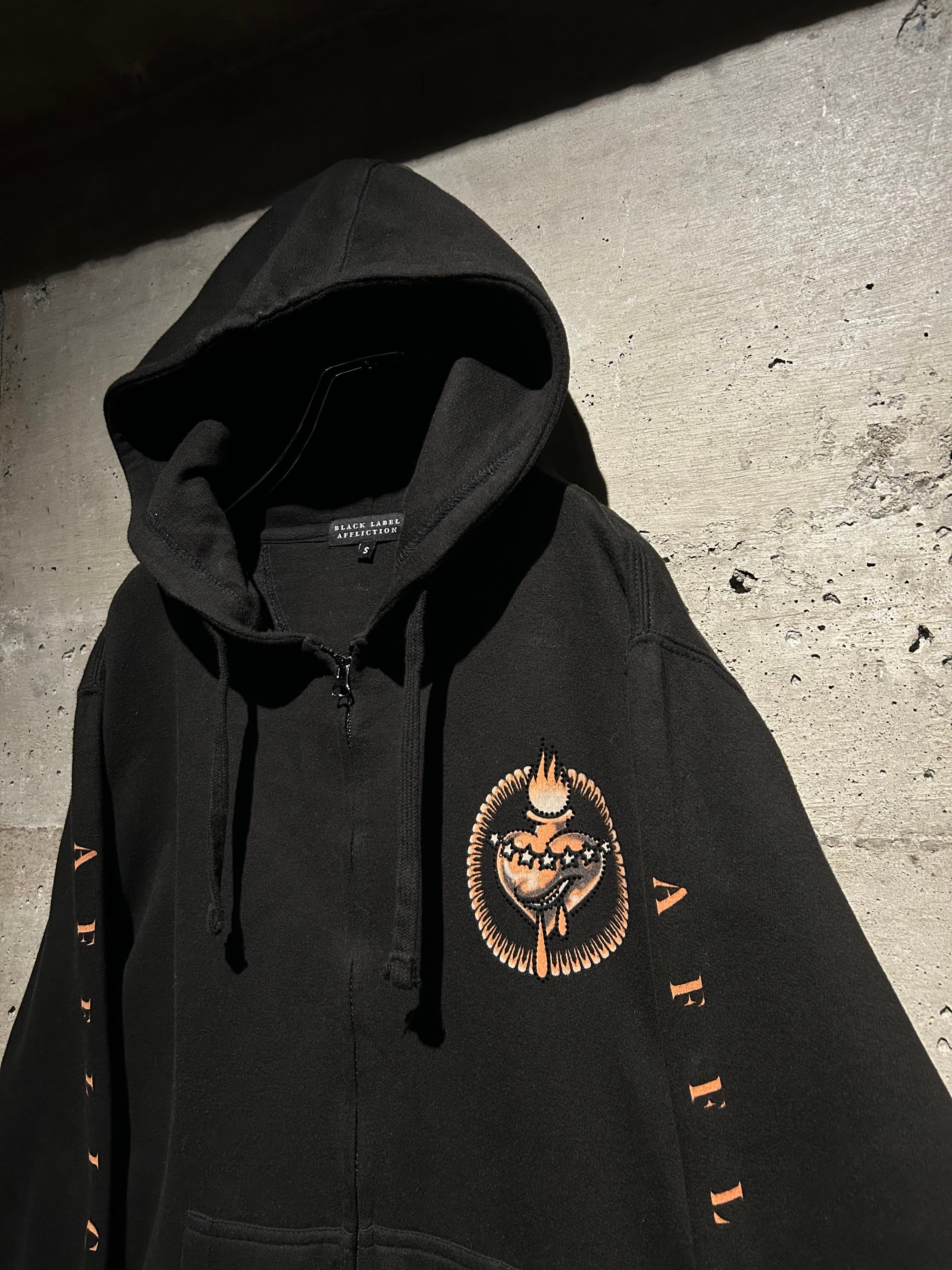 セレブからストリートの若者まで、幅広い層からの支持を集めるLA発のファッションブランド“Affliction”から、タトゥーデザインを載せたジップアップフーディ。