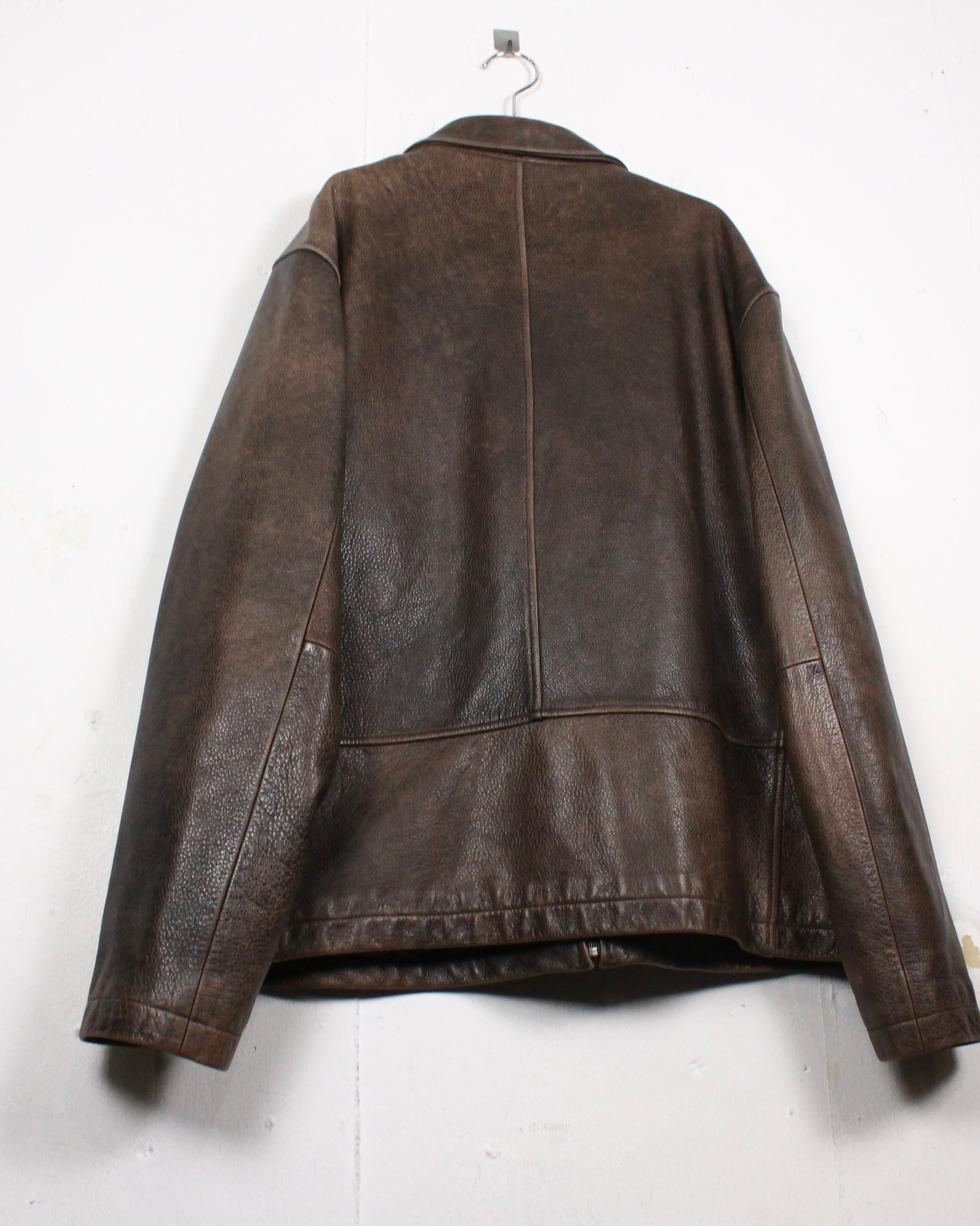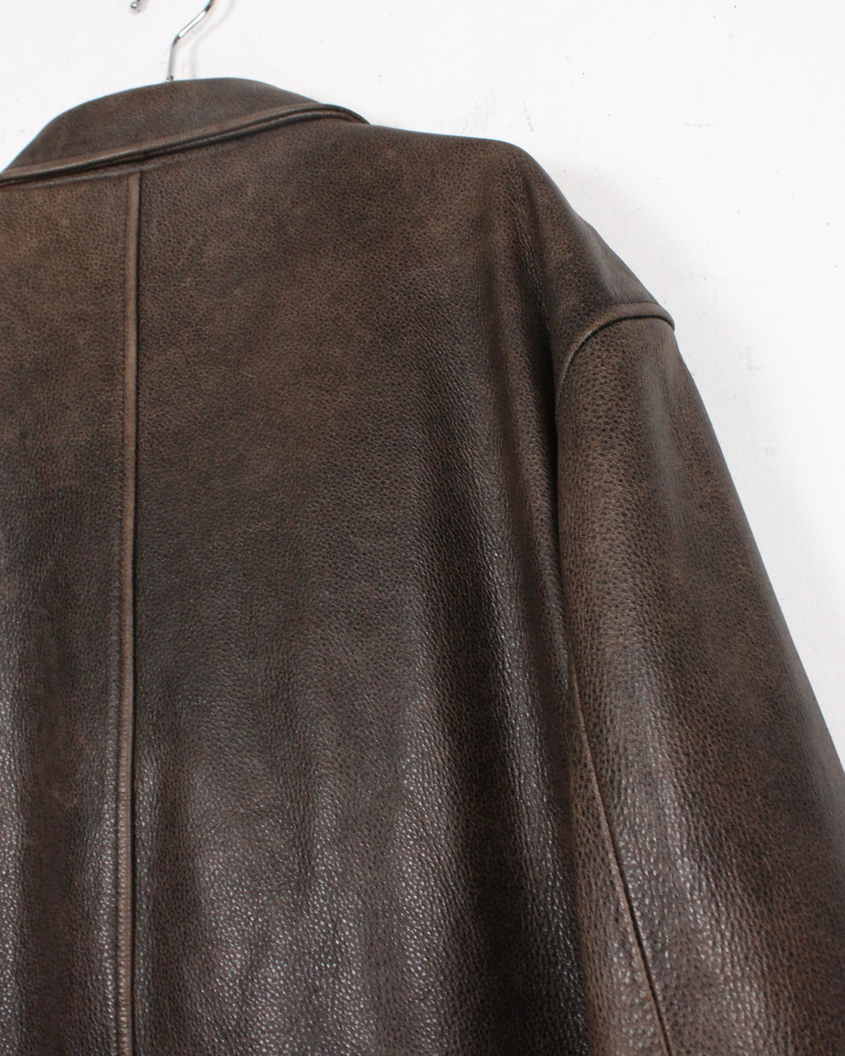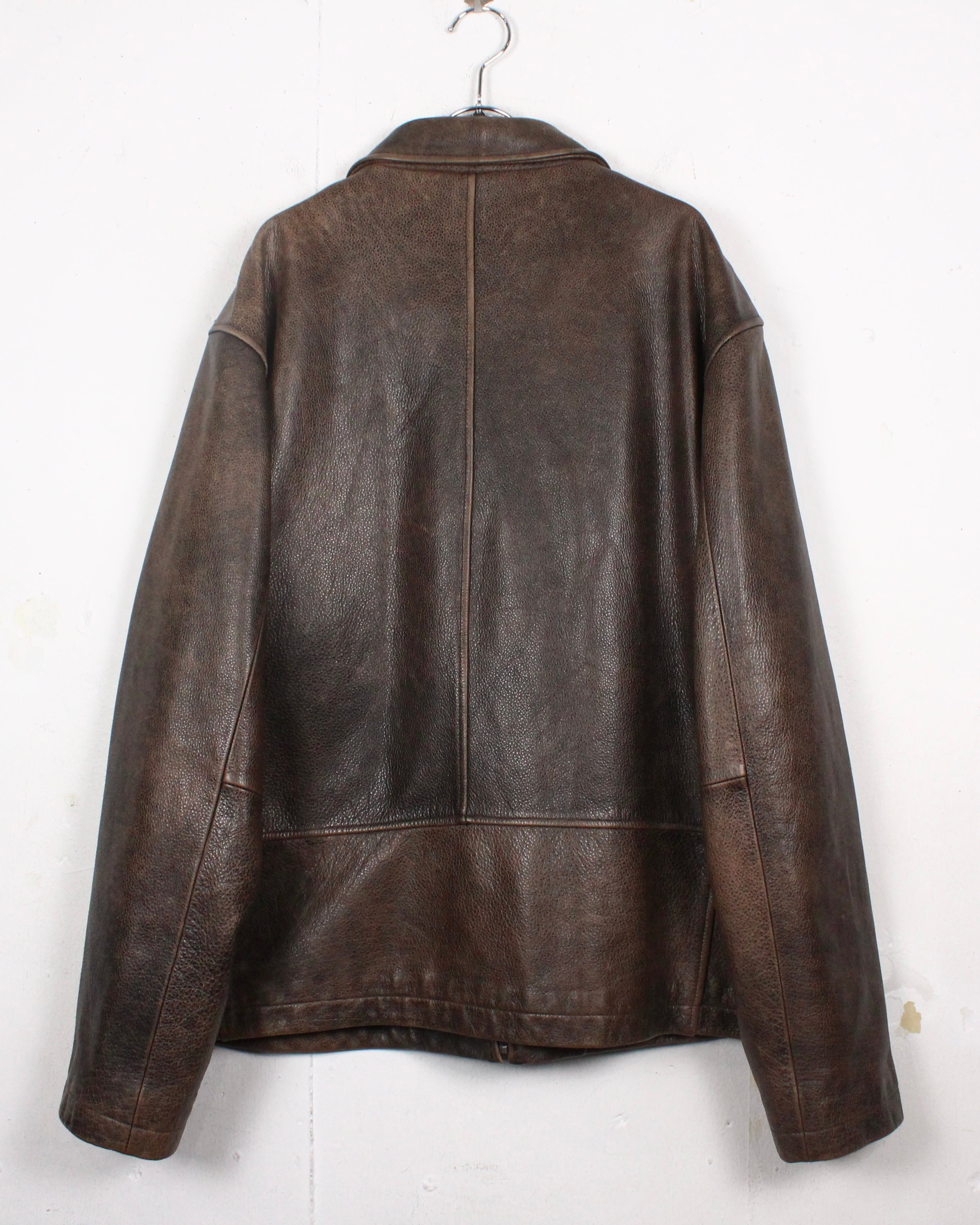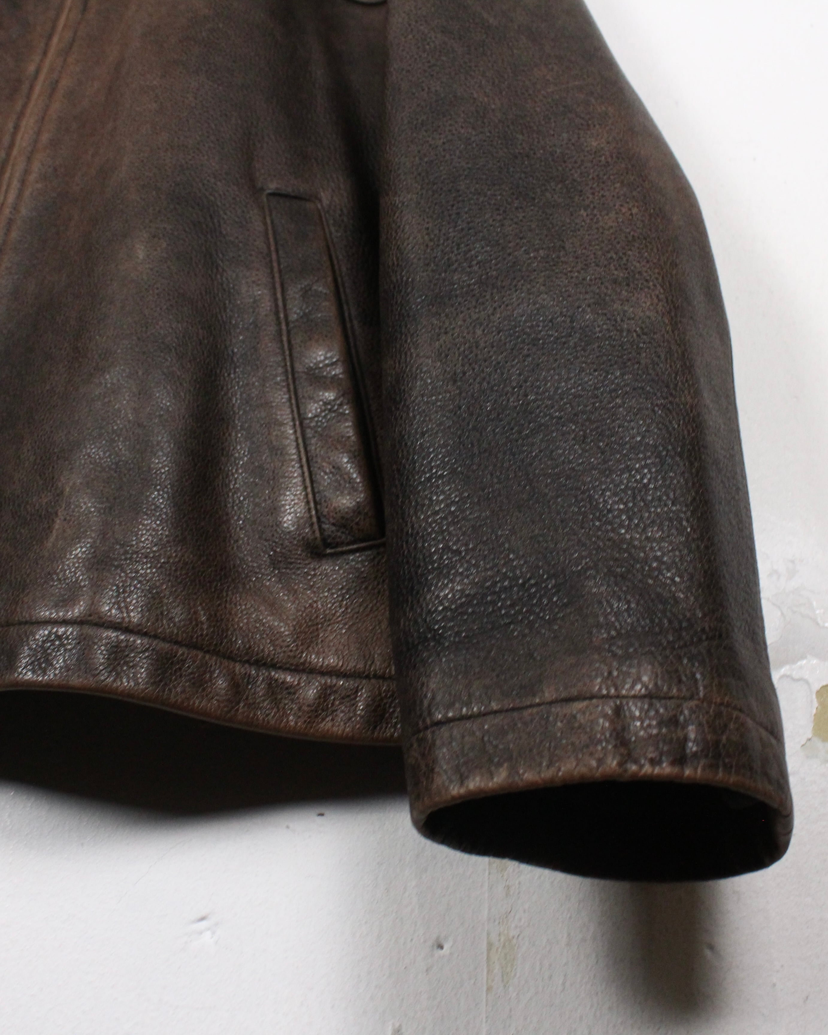 経年によるレザー特有のエイジングが味わい深く、艶やかな光沢が雰囲気を醸し出しているブラウンレザーを用いた1着。