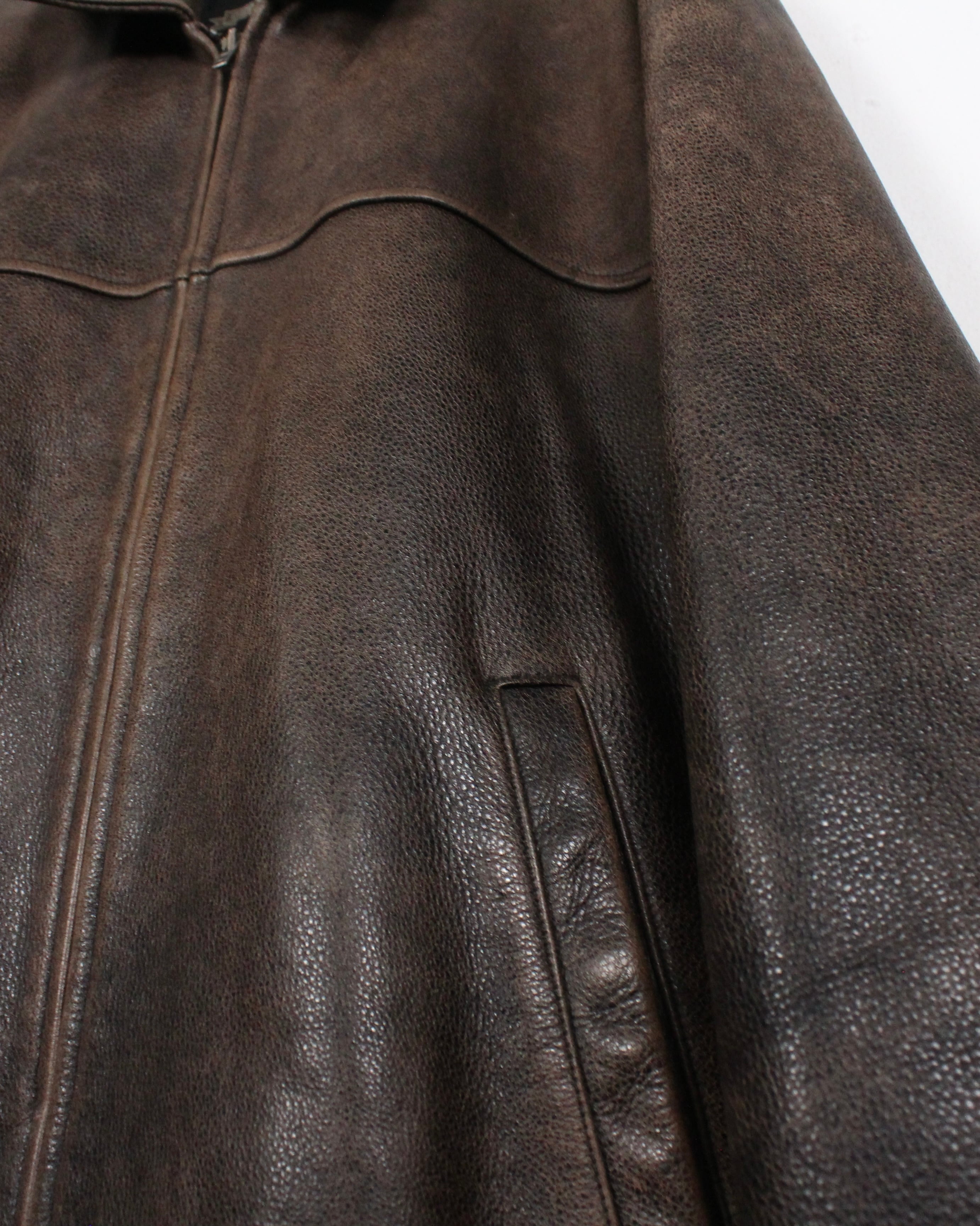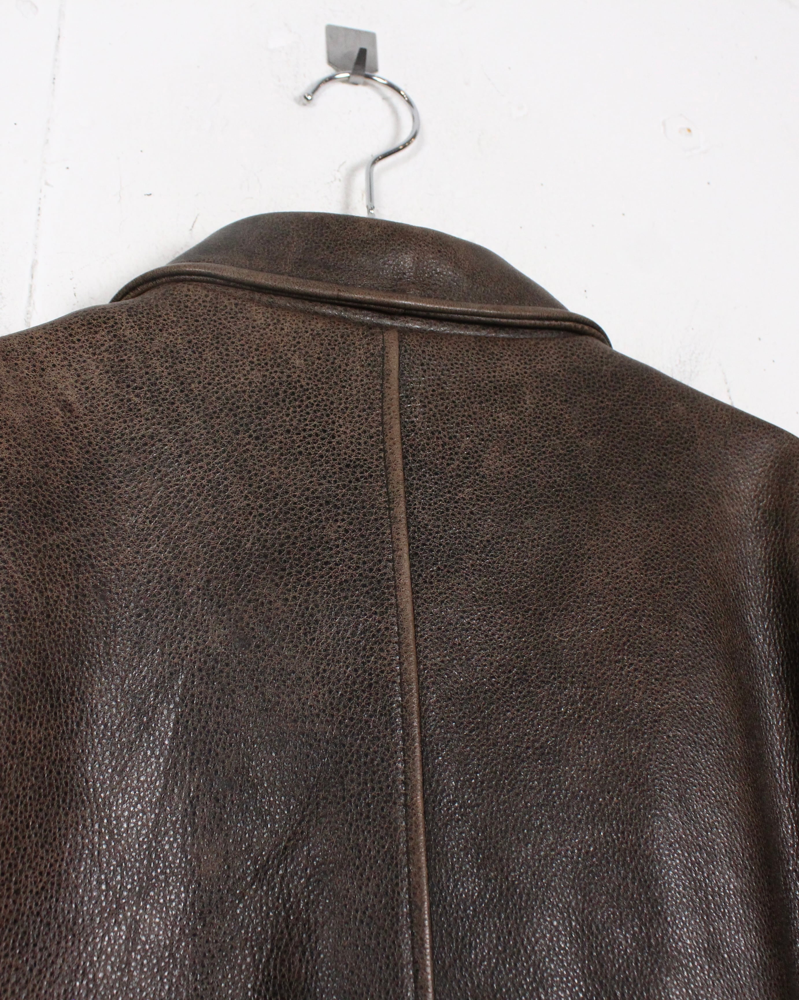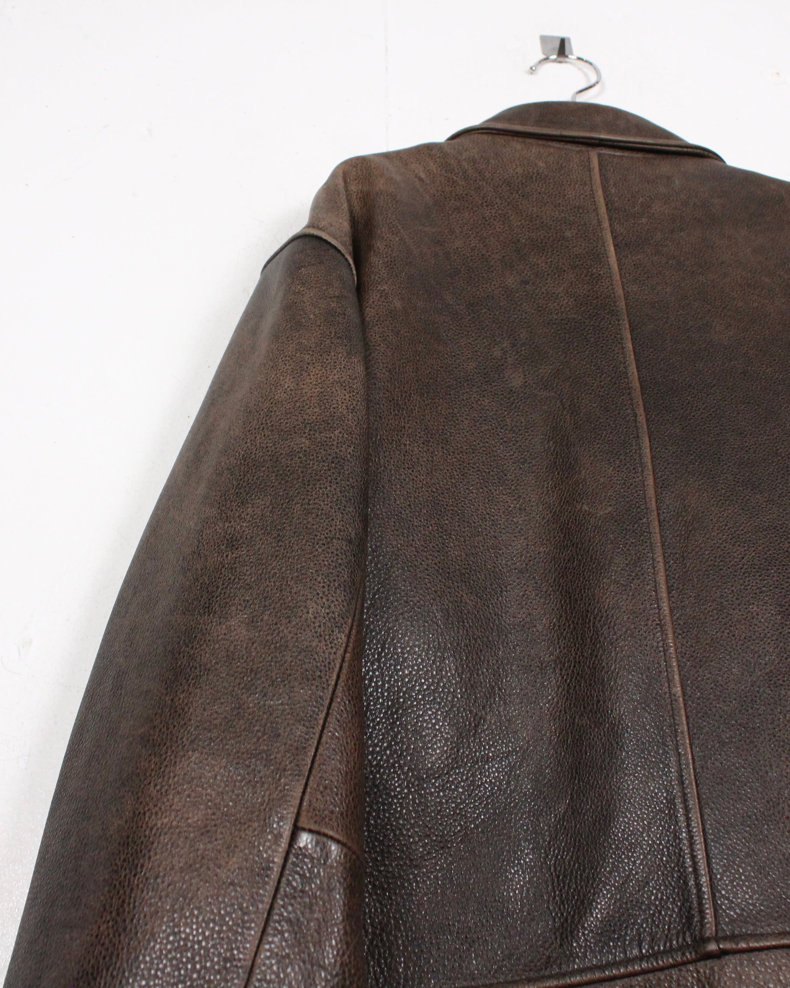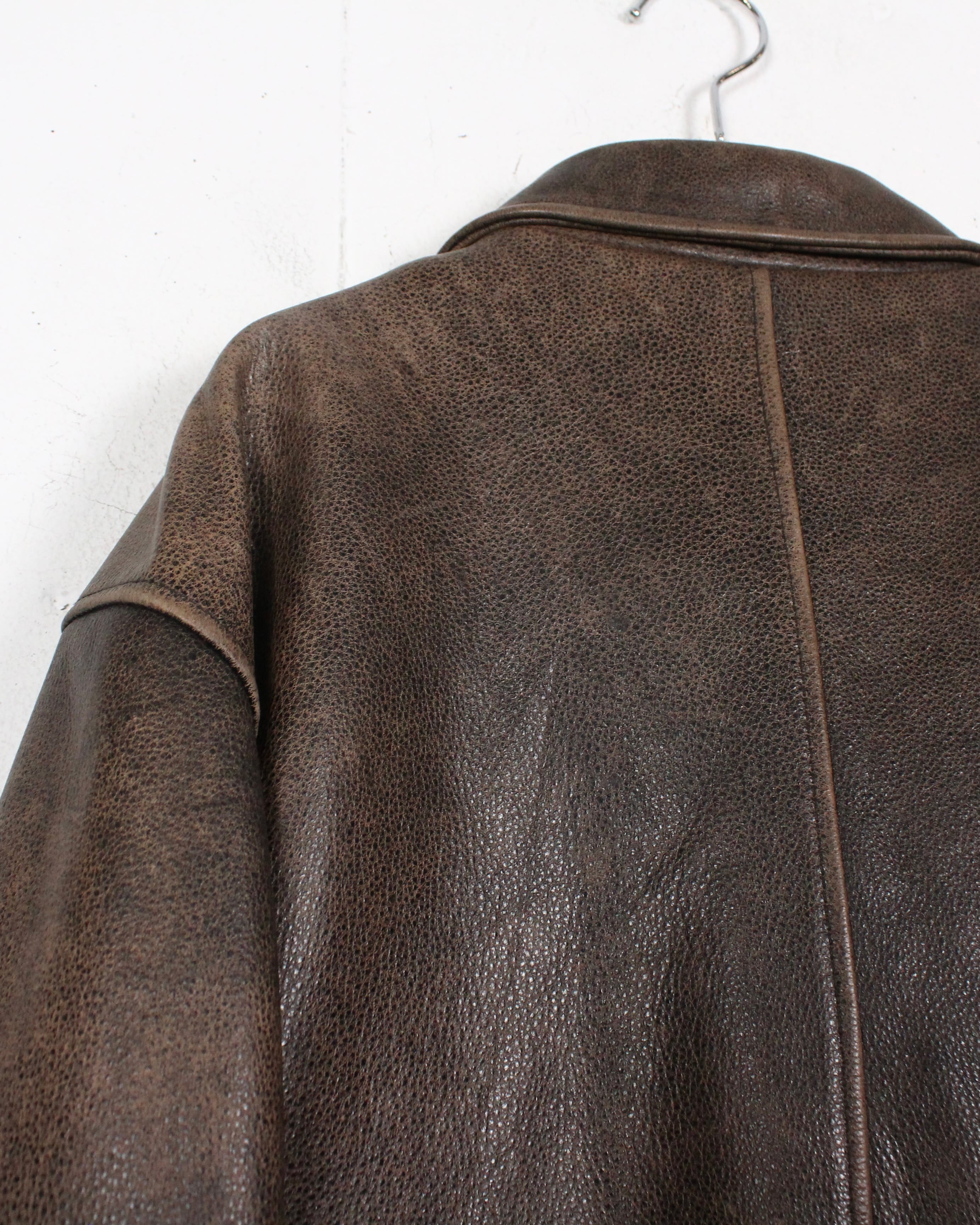 経年によるレザー特有のエイジングが味わい深く、艶やかな光沢が雰囲気を醸し出しているブラウンレザーを用いた1着。
