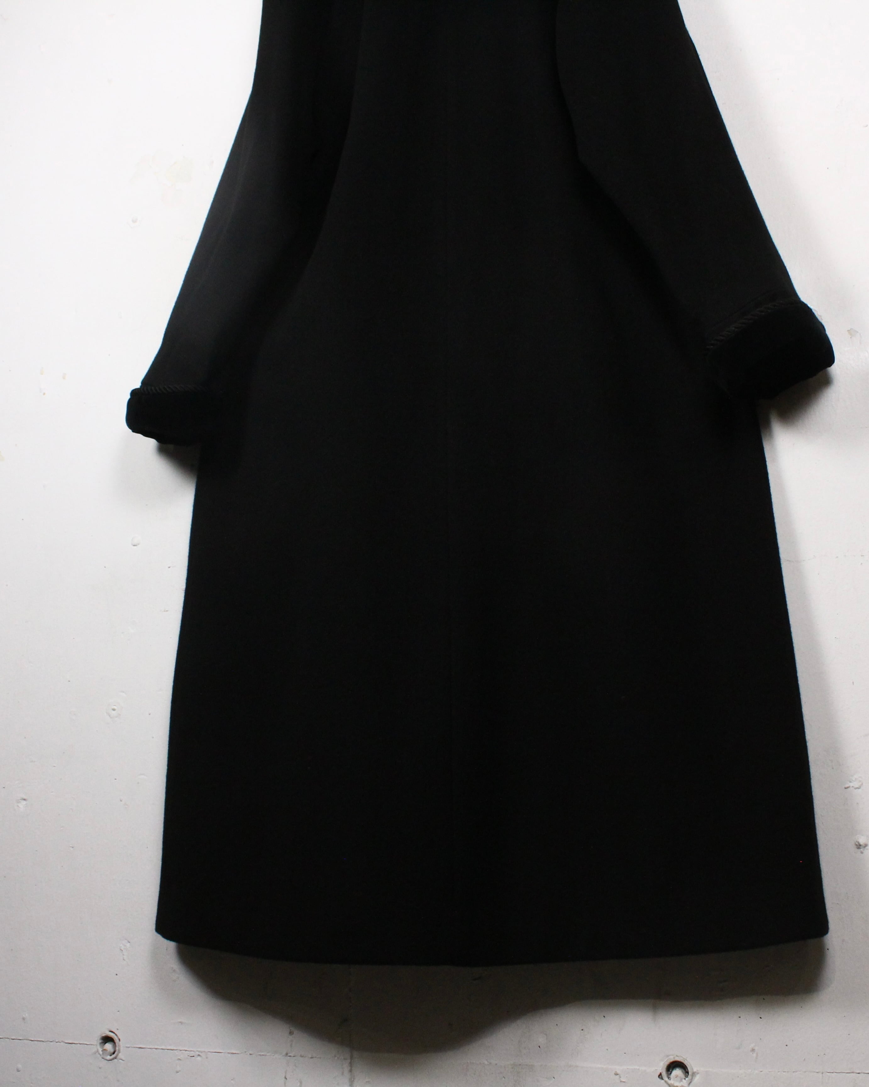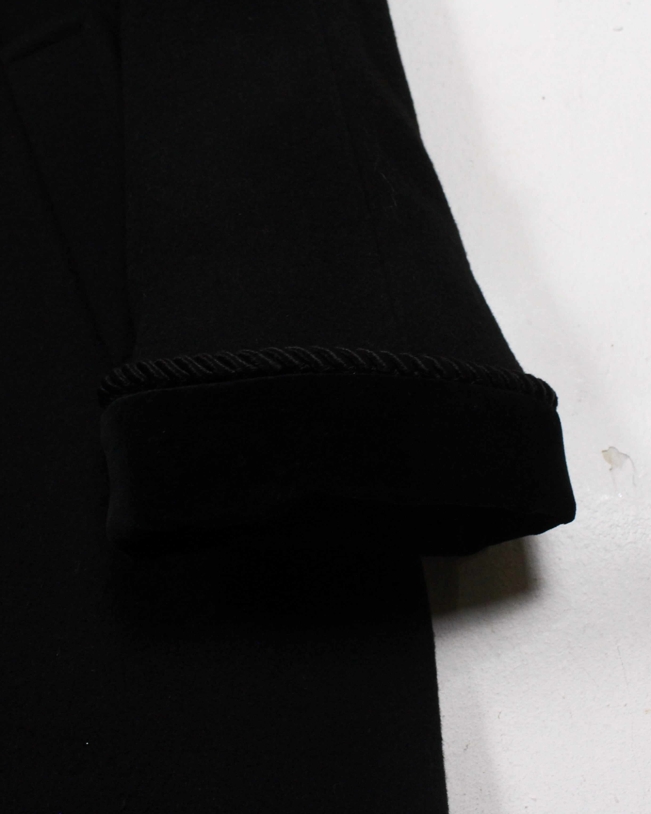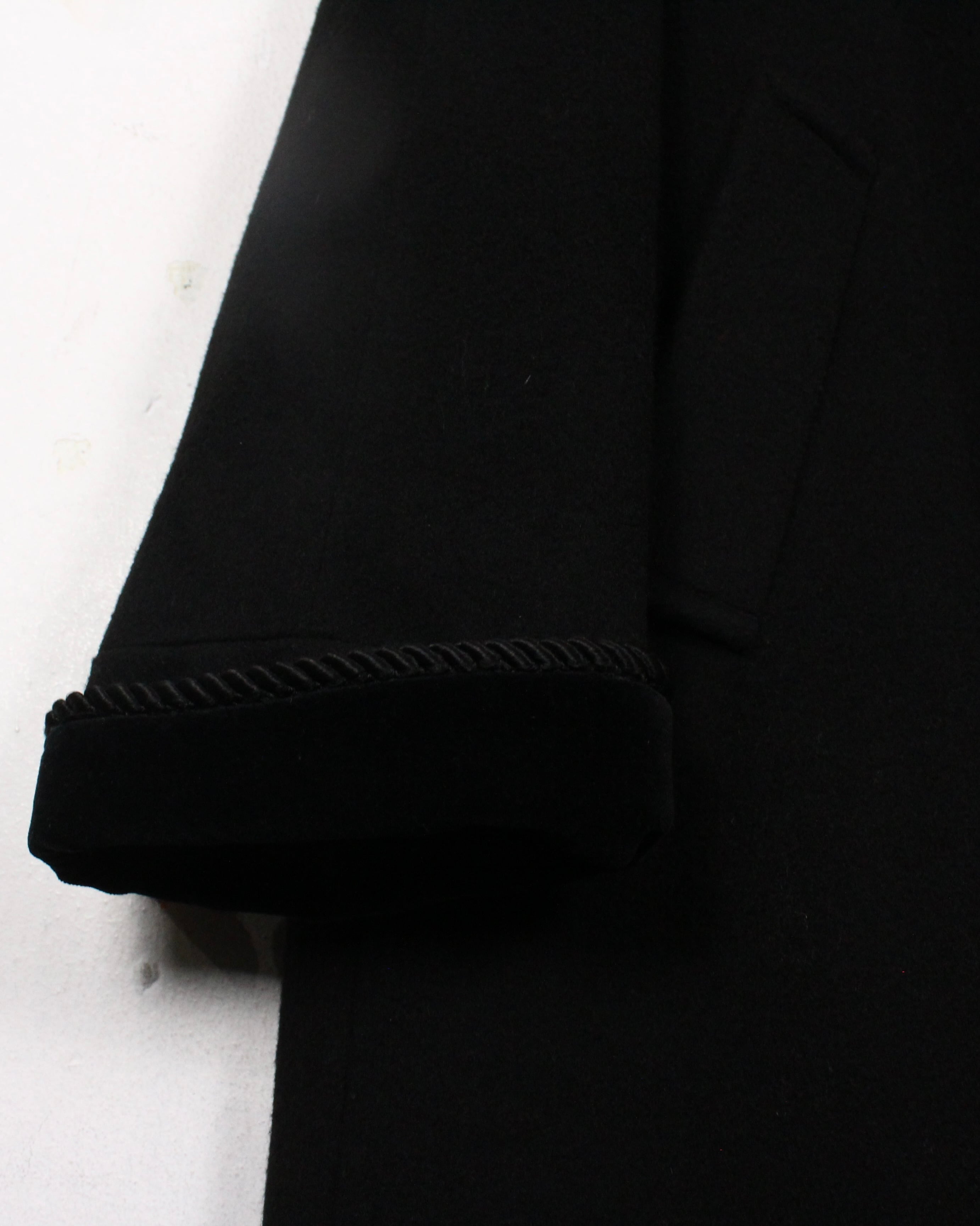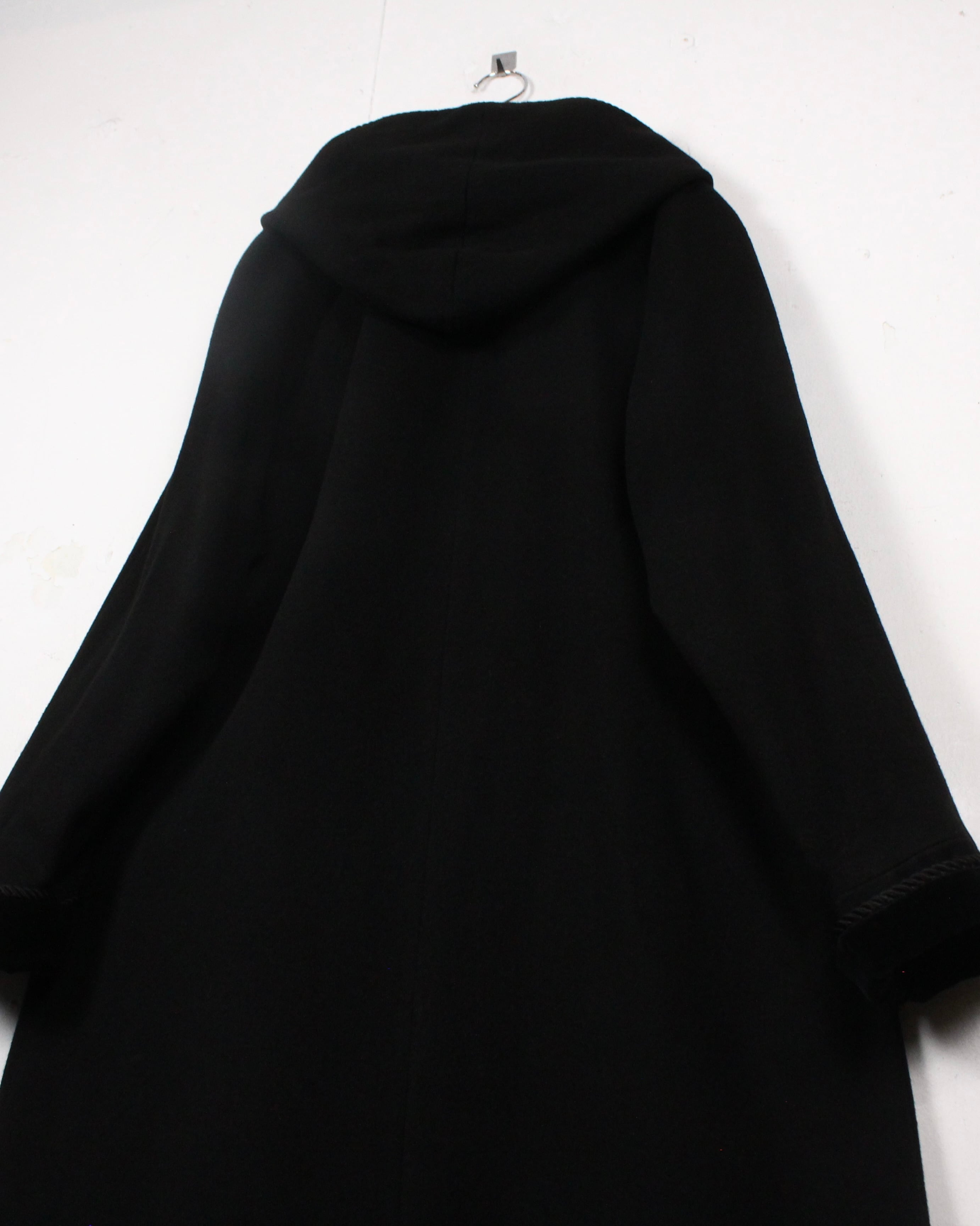 上質なウールを用いたブラックボディに、フード内側と袖口へベルベットを切り替えたコート。