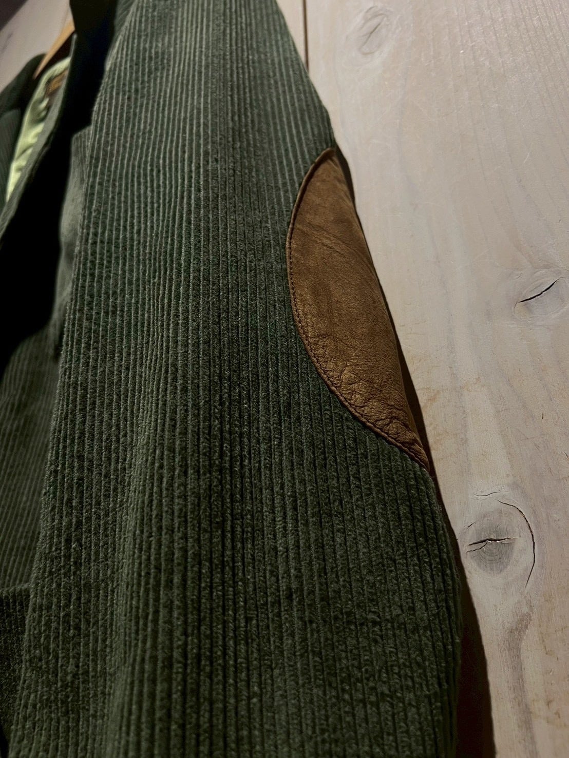 特徴的な襟のストラップ、エルボーパッチにはレザーを切り替え、コーデュロイのボディの中に異素材のアクセントをプラス。