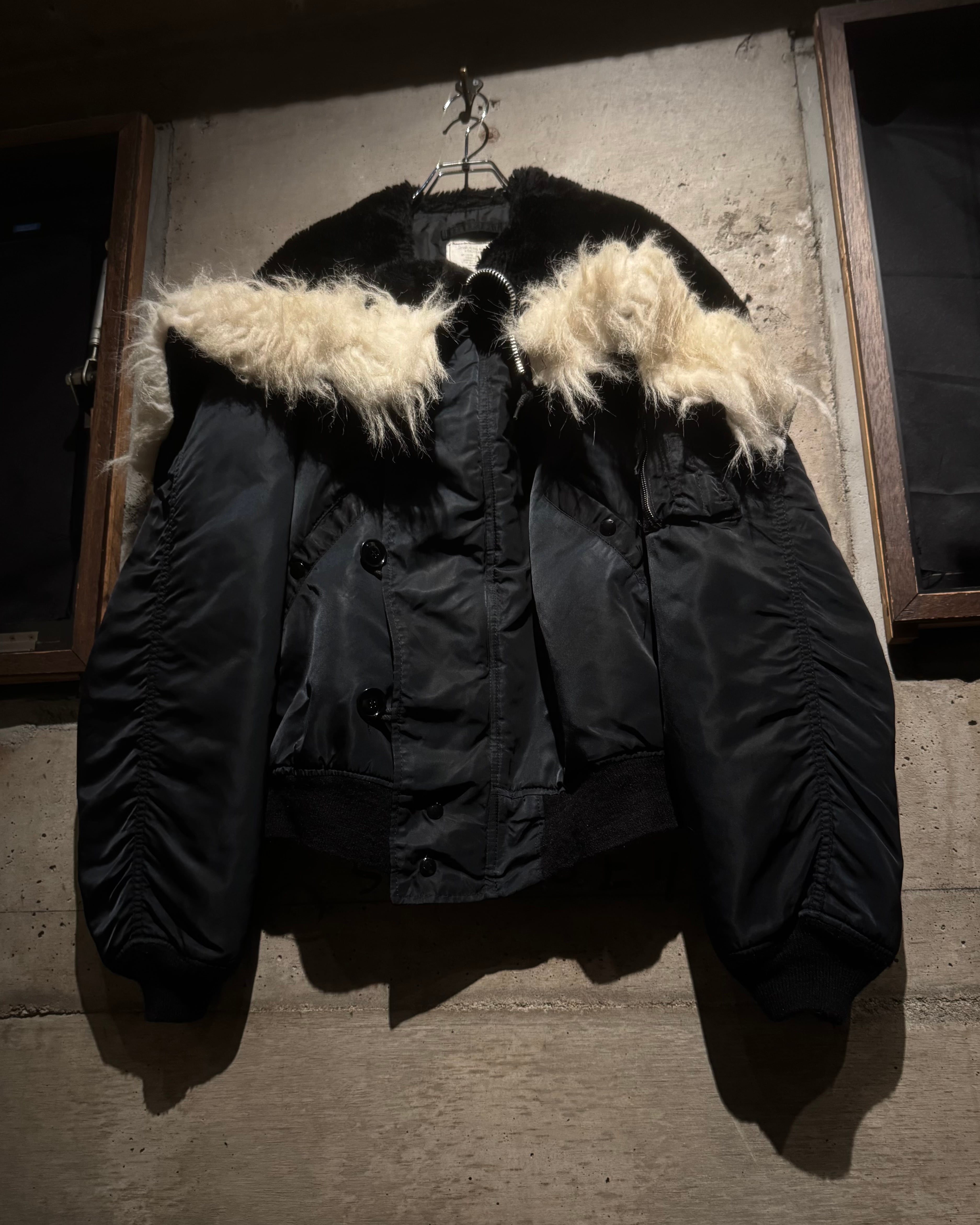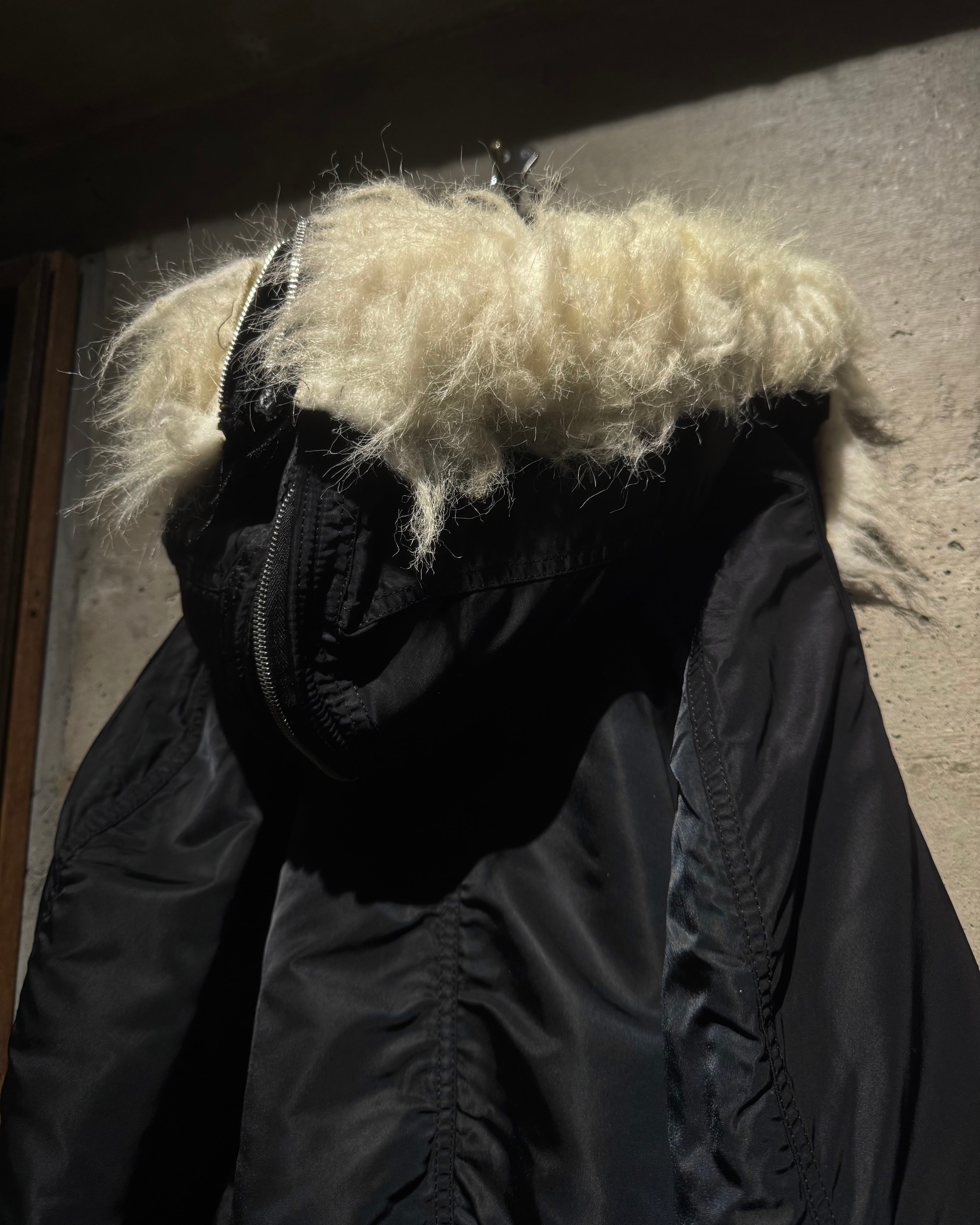 光沢を抑えたブラックのナイロンシェルに、ジップで分割可能なフードの内側には密度の高いフェイクファーを搭載。風を遮断するリブ袖やフロントの比翼構造など、現代でも通用する機能的ディテールが満載です。