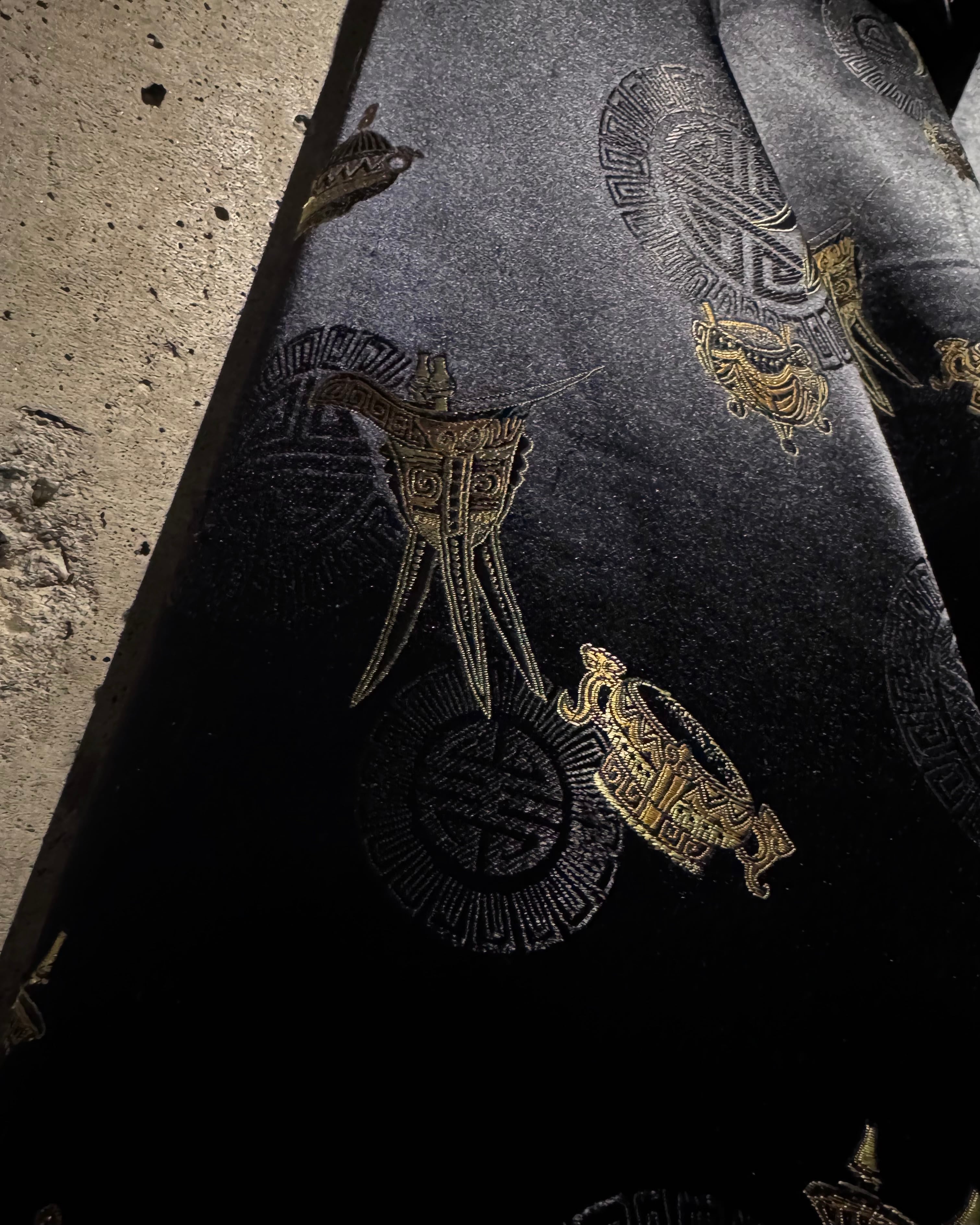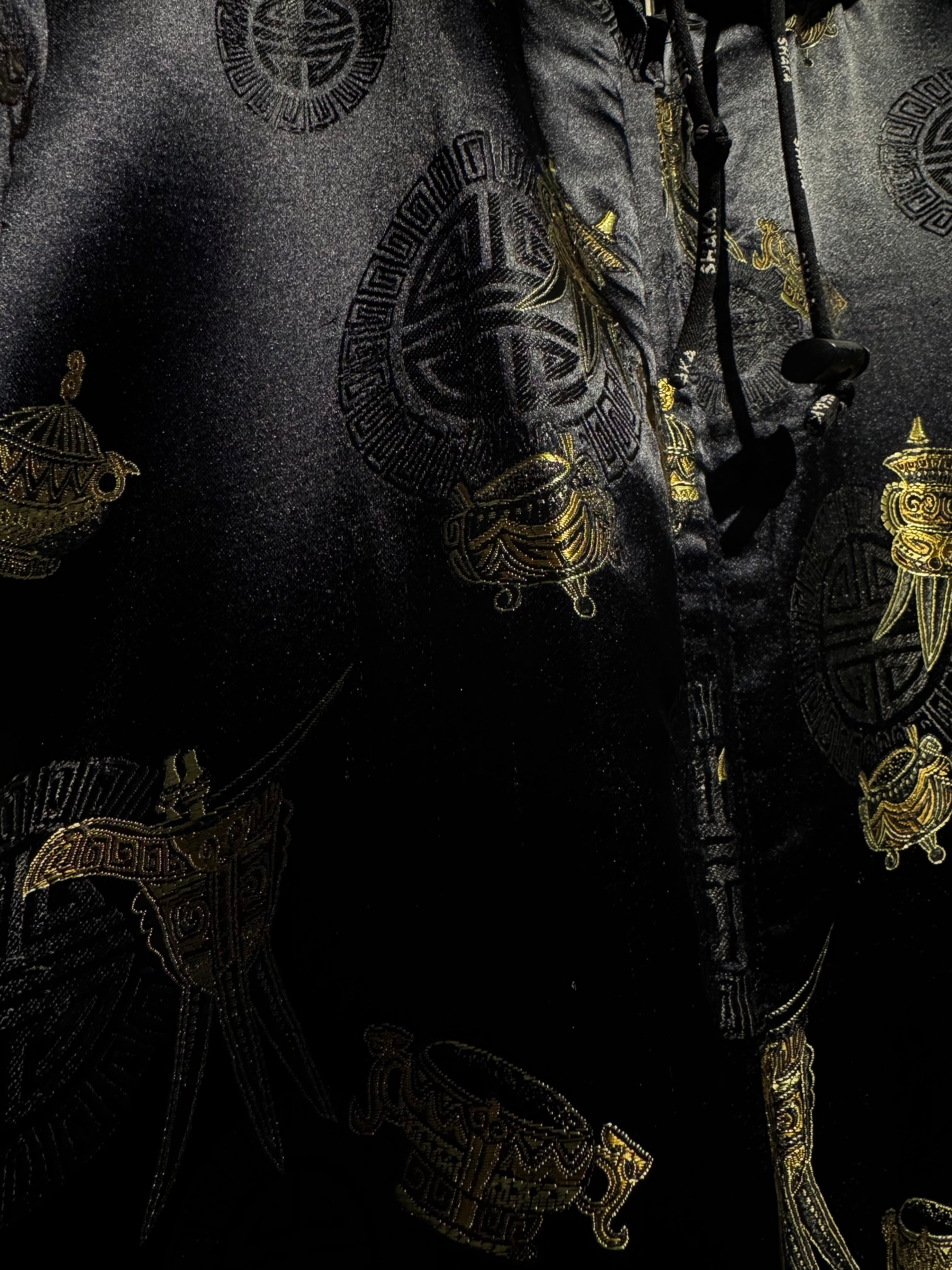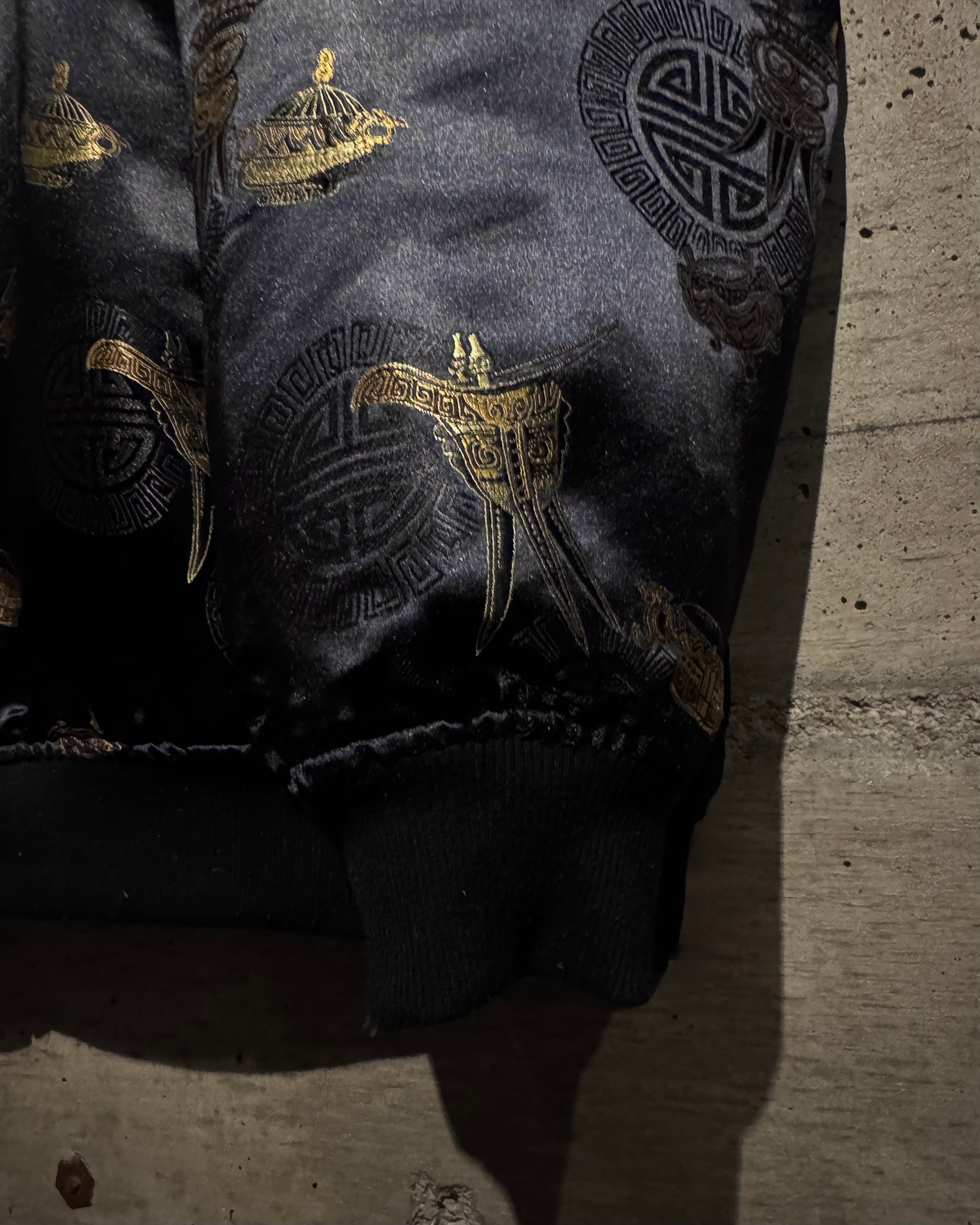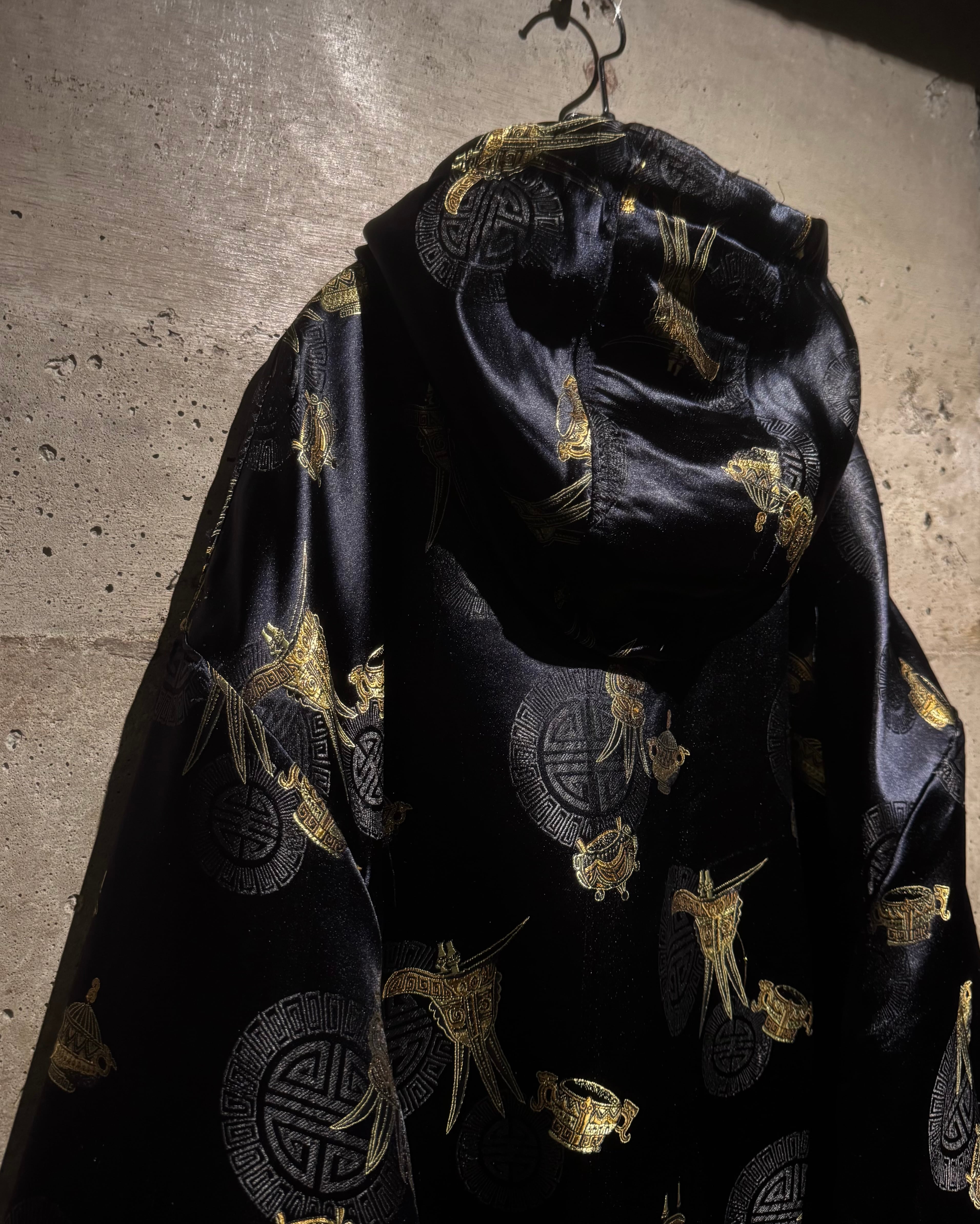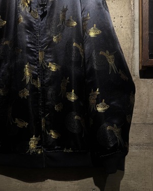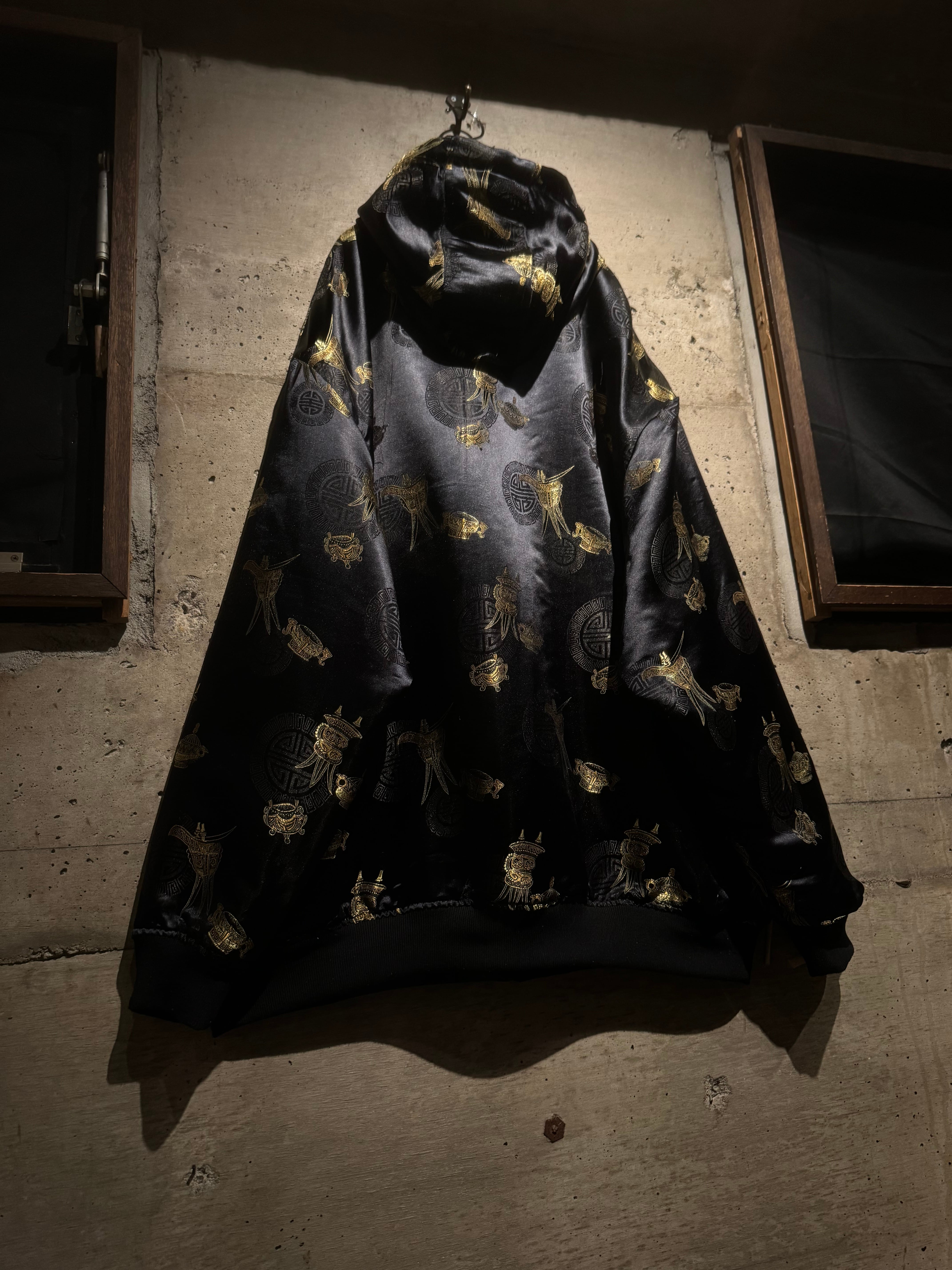 表と裏、全く異なる表情で仕上げられたリバーシブル仕様のジップアップフーディ。片面は光沢のあるファブリックにオリエンタルなモチーフを散りばめた総柄デザイン、もう片面には無駄を削ぎ落としたソリッドなブラックボディ。