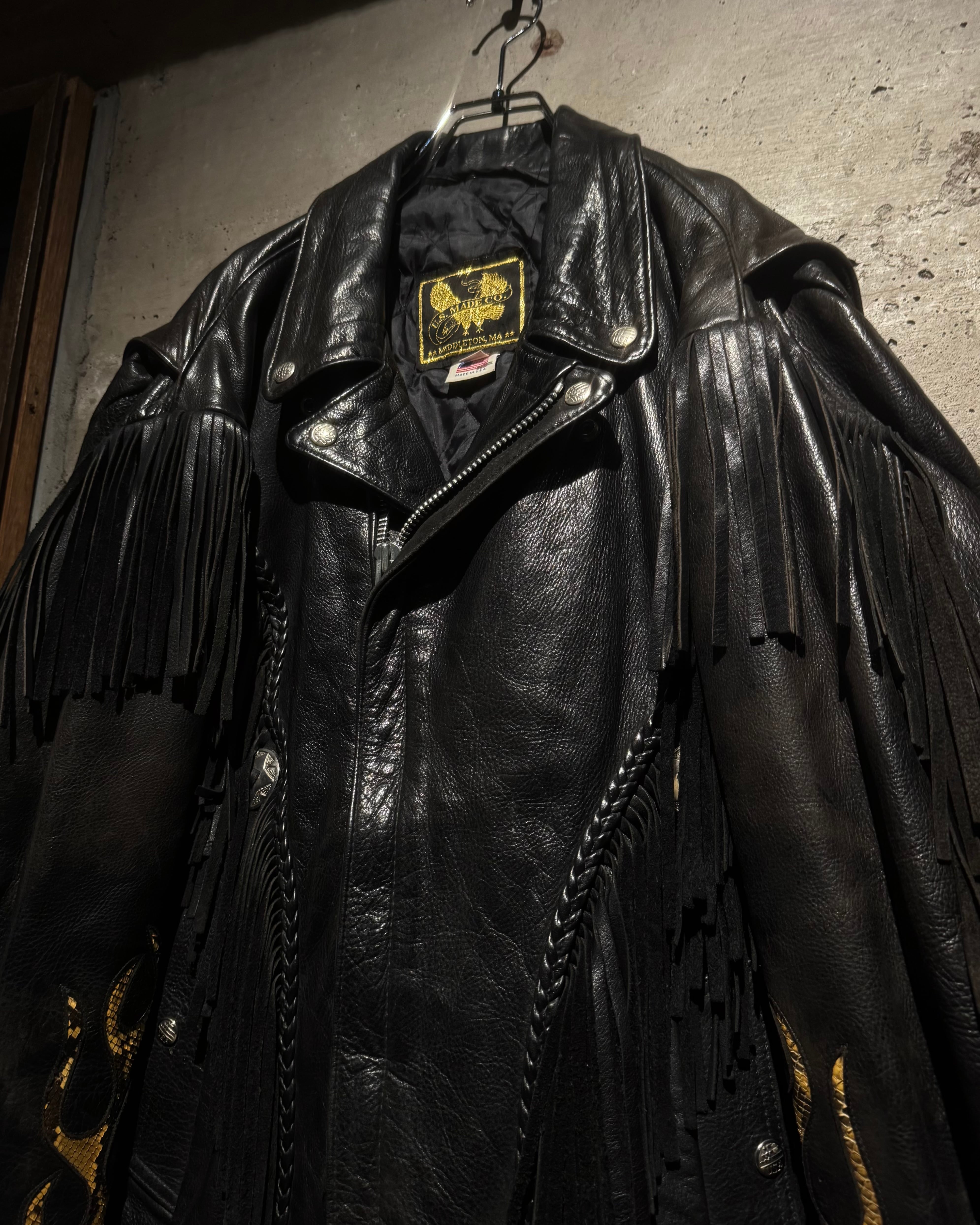 ダブルのライダースジャケットをベースに、フリンジとコンチョボタン、袖口にはフレームパターンを配した、圧倒的存在感を放つ1着。