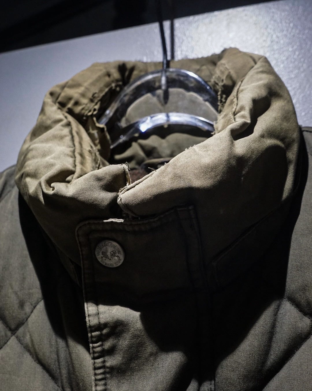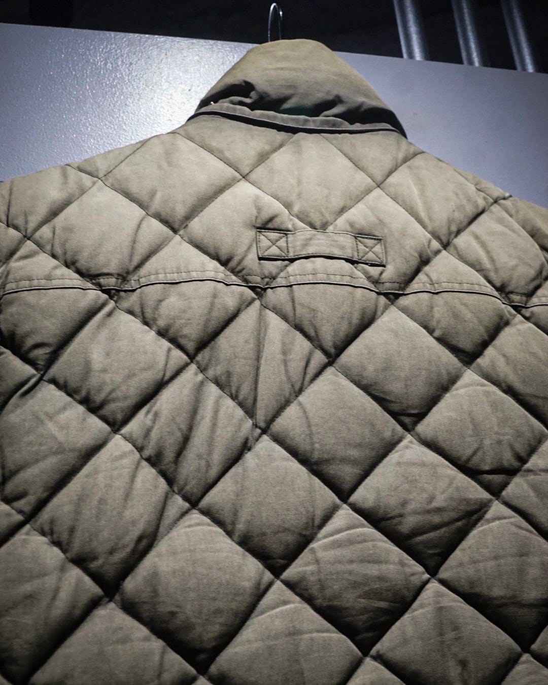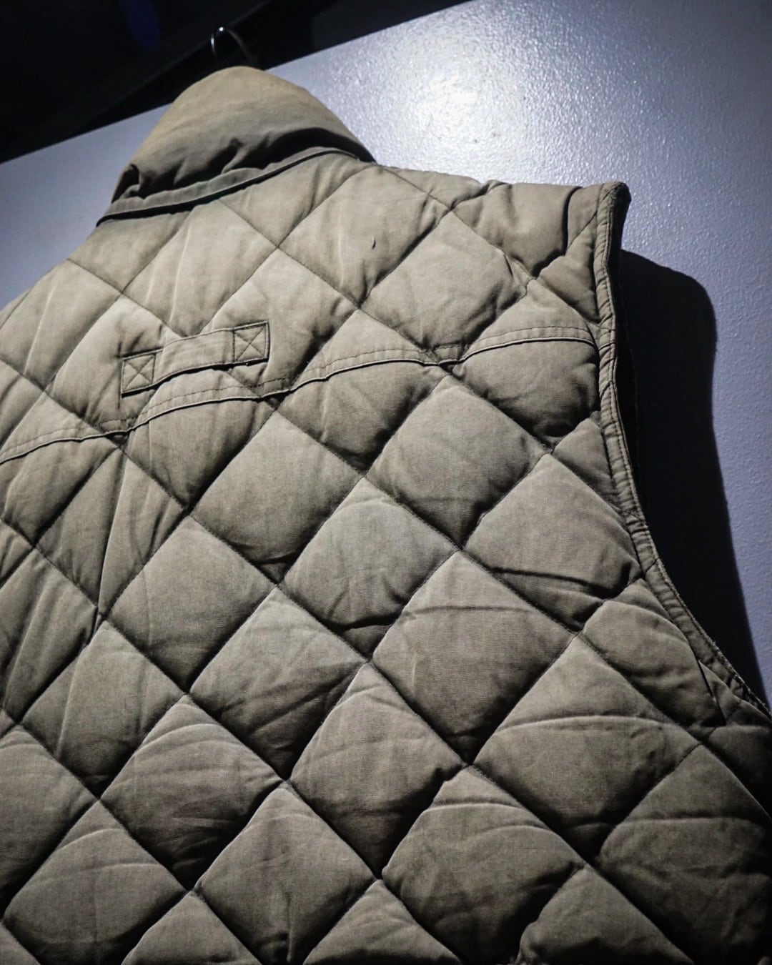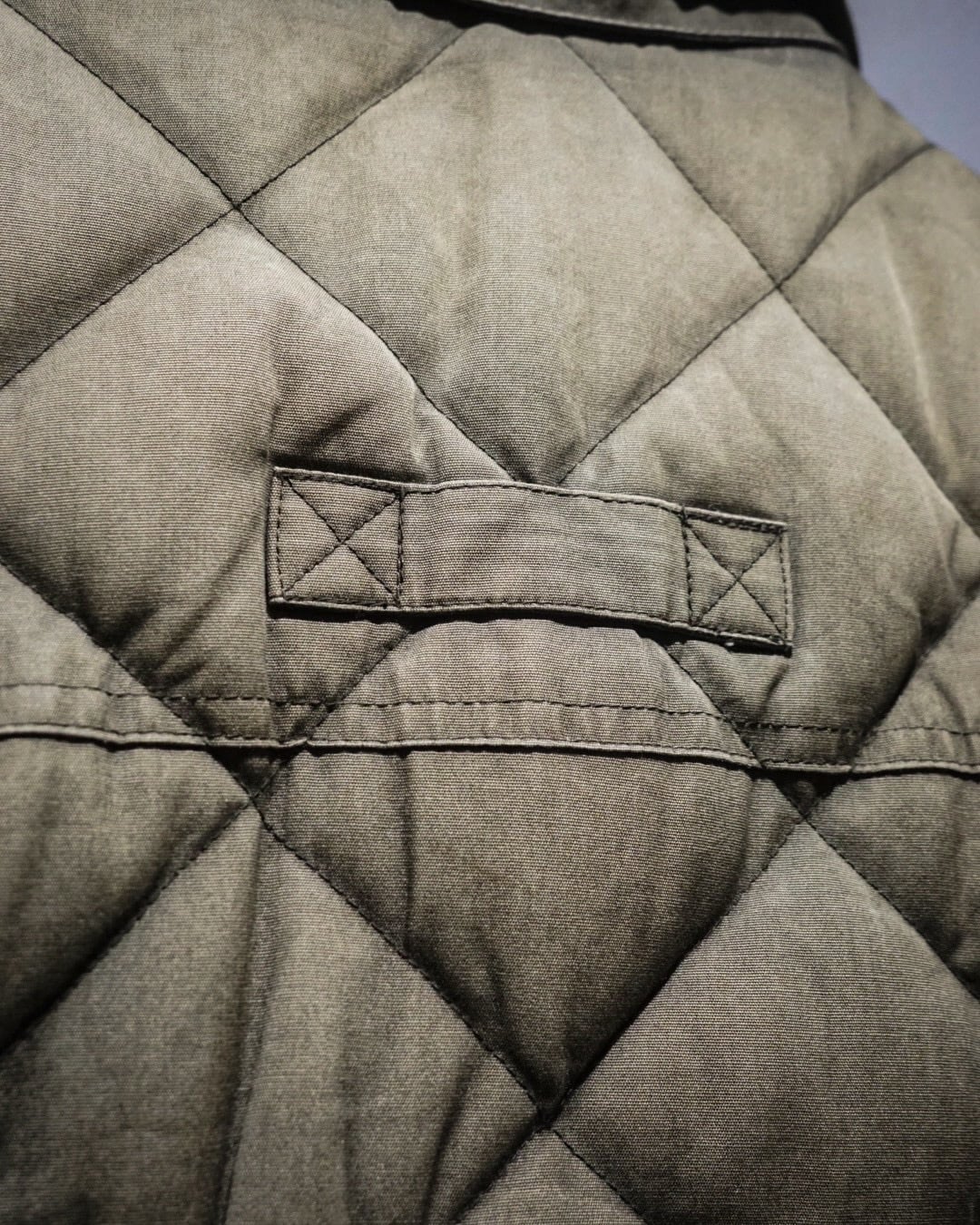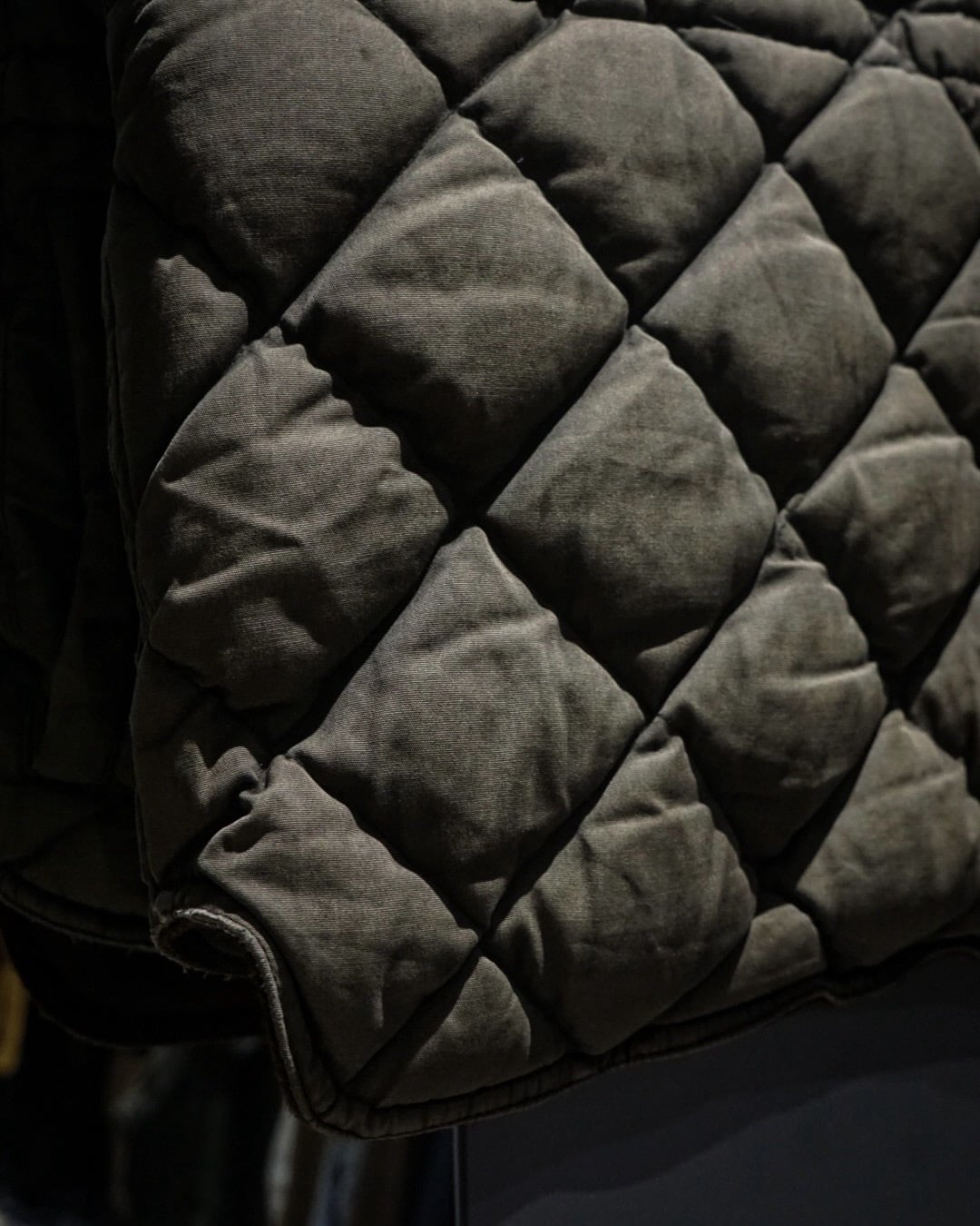 表地にはタフなコットンシェルを使用し、ダイヤ状のキルティングが立体的な表情を演出。着用を重ねることで生まれたフェードやアタリが、無骨さとヴィンテージらしい奥行きを感じさせます。