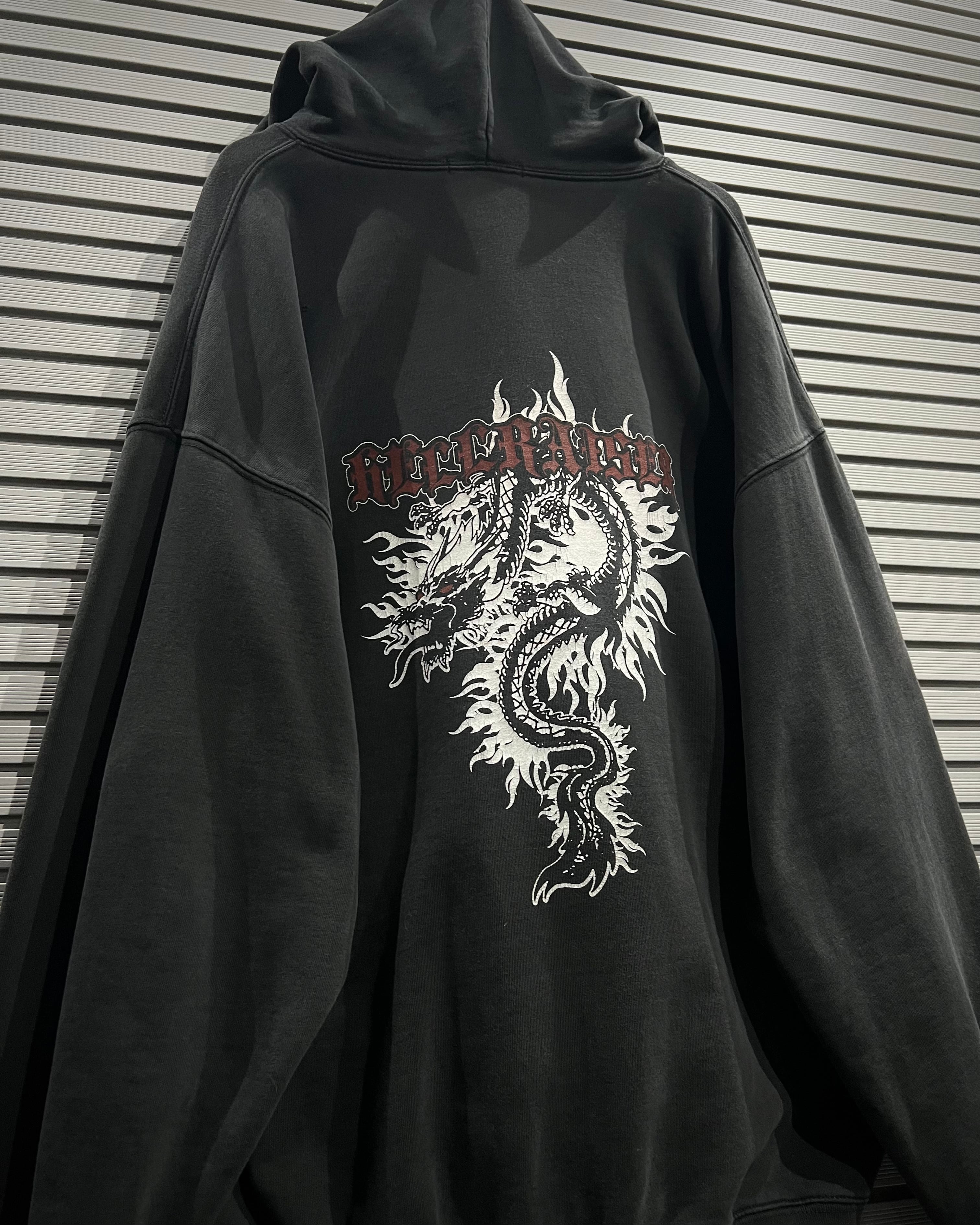 フロントはミニマルに抑えつつ、背面にはインパクトのあるドラゴングラフィックを大胆に配置。プリントの擦れや退色も相まって、奥行きを感じさせます。