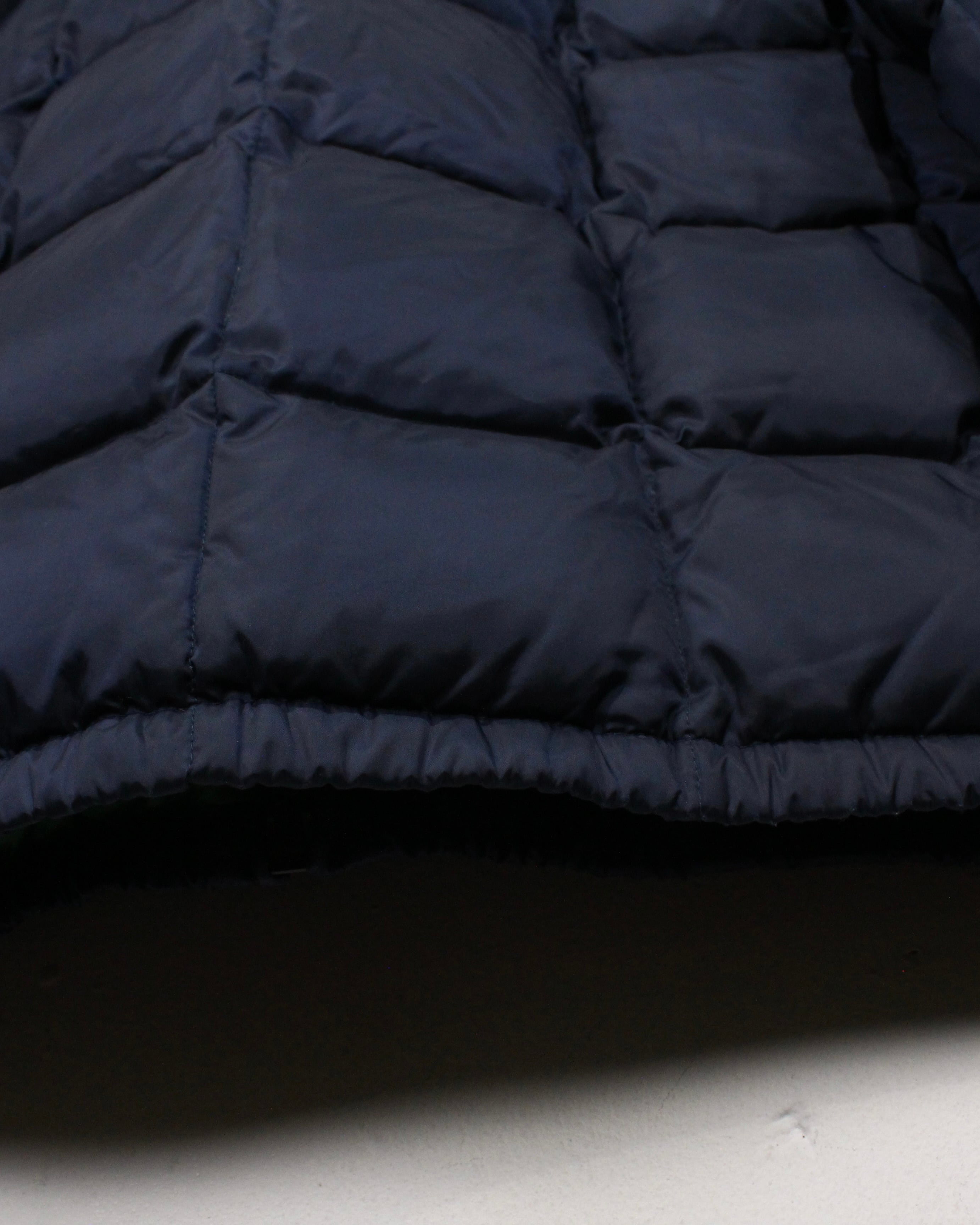 ネイビーのシェルに、ジップを開いた際に覗くグリーンのライニングが映える、完成度の高い配色バランスが光る1着。