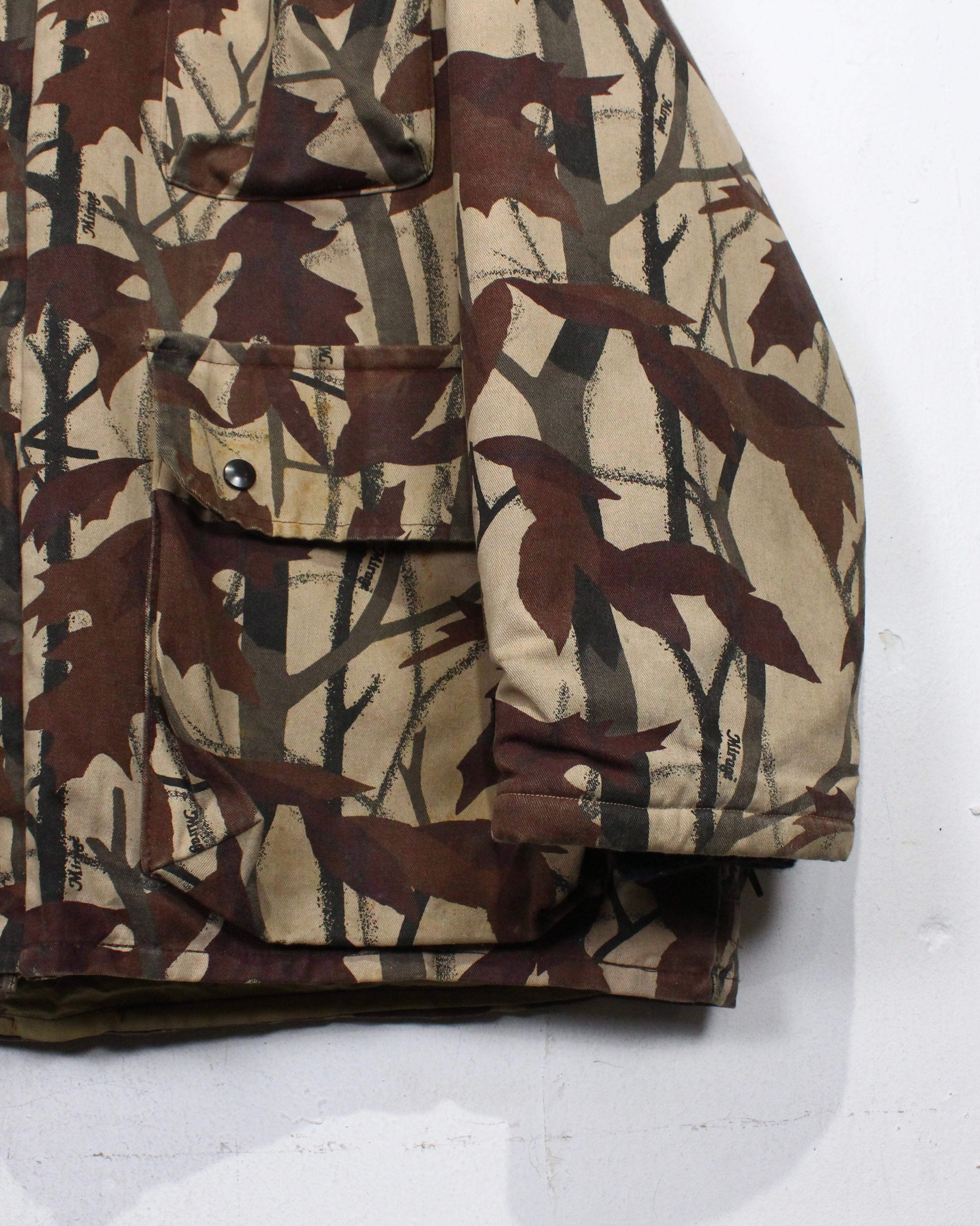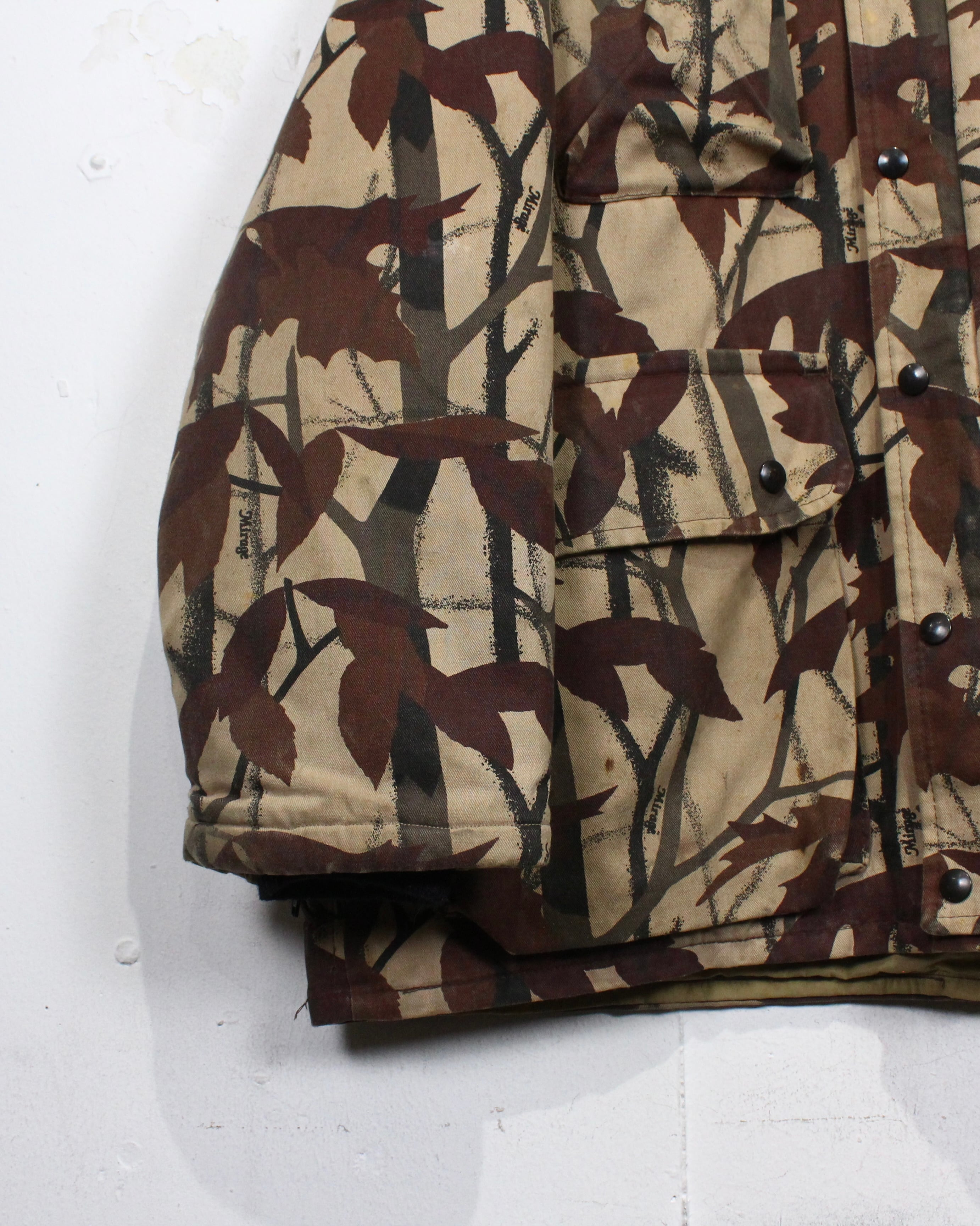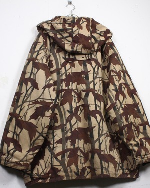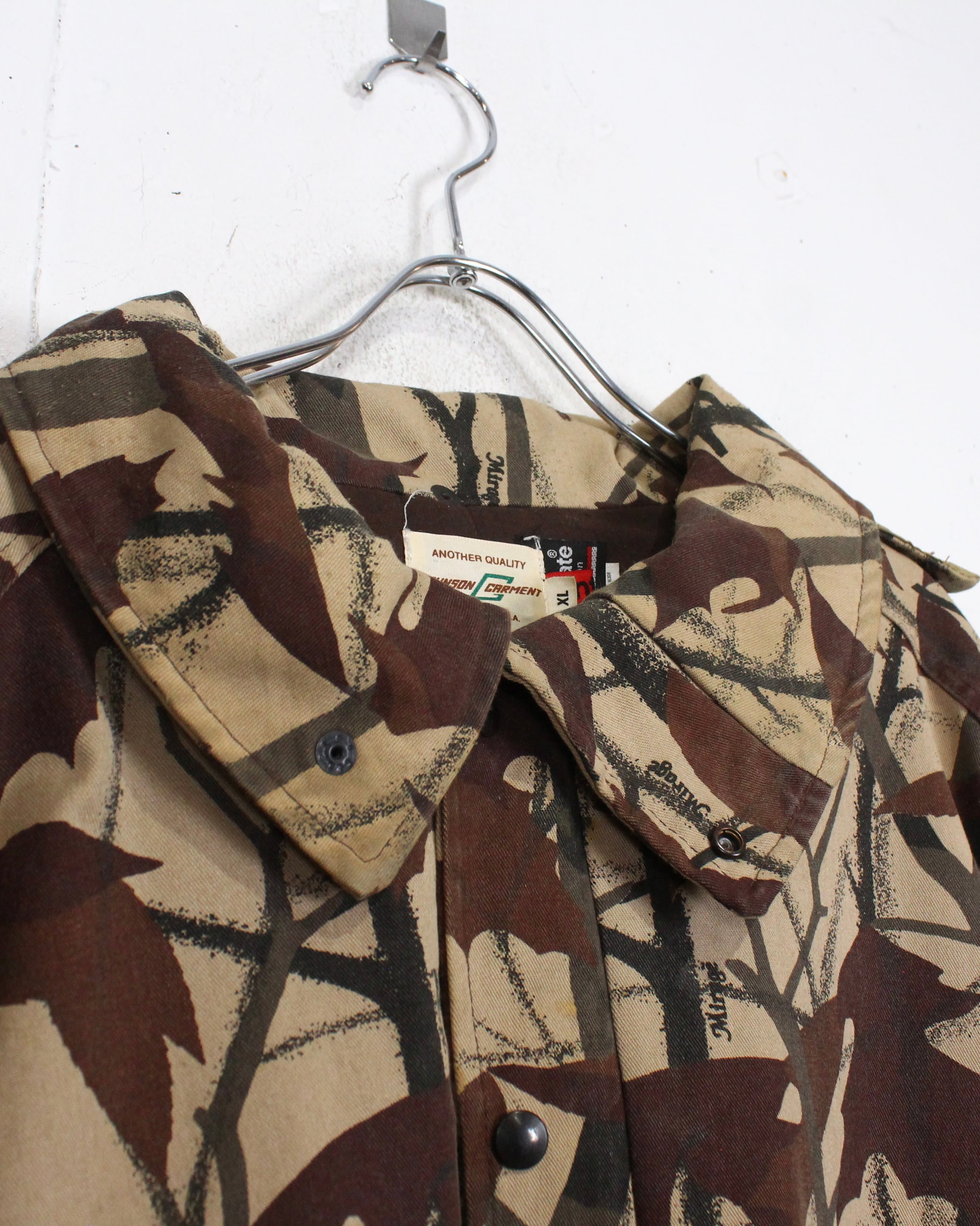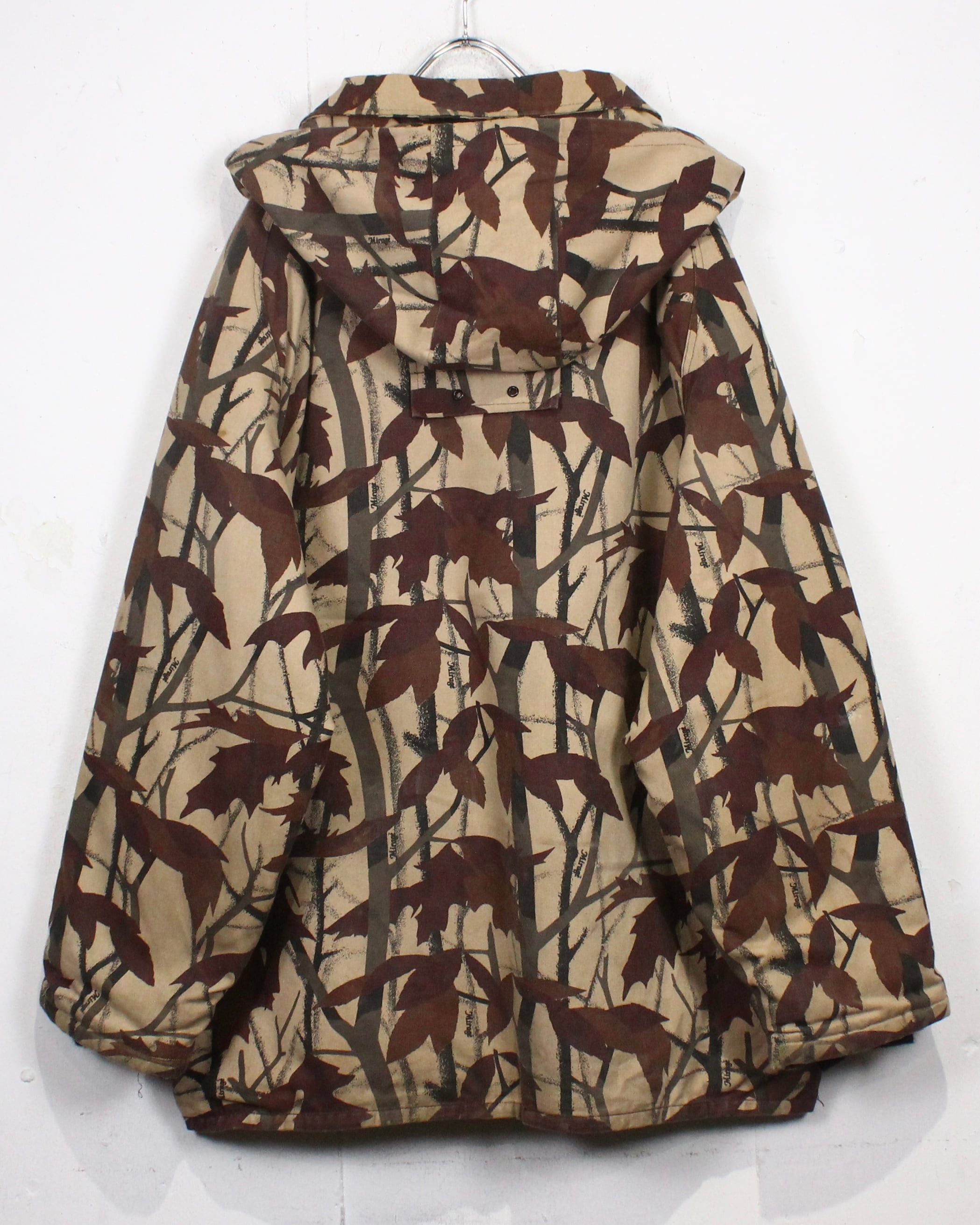 枝葉やシルエットを抽象化した独特なカモフラージュパターンが、奥行きと立体感を生み出し、視線を引きつける仕上がり。ブラウン、ベージュを基調とした配色は主張がありながらも落ち着きがあり、コーディネートに自然と馴染みます。