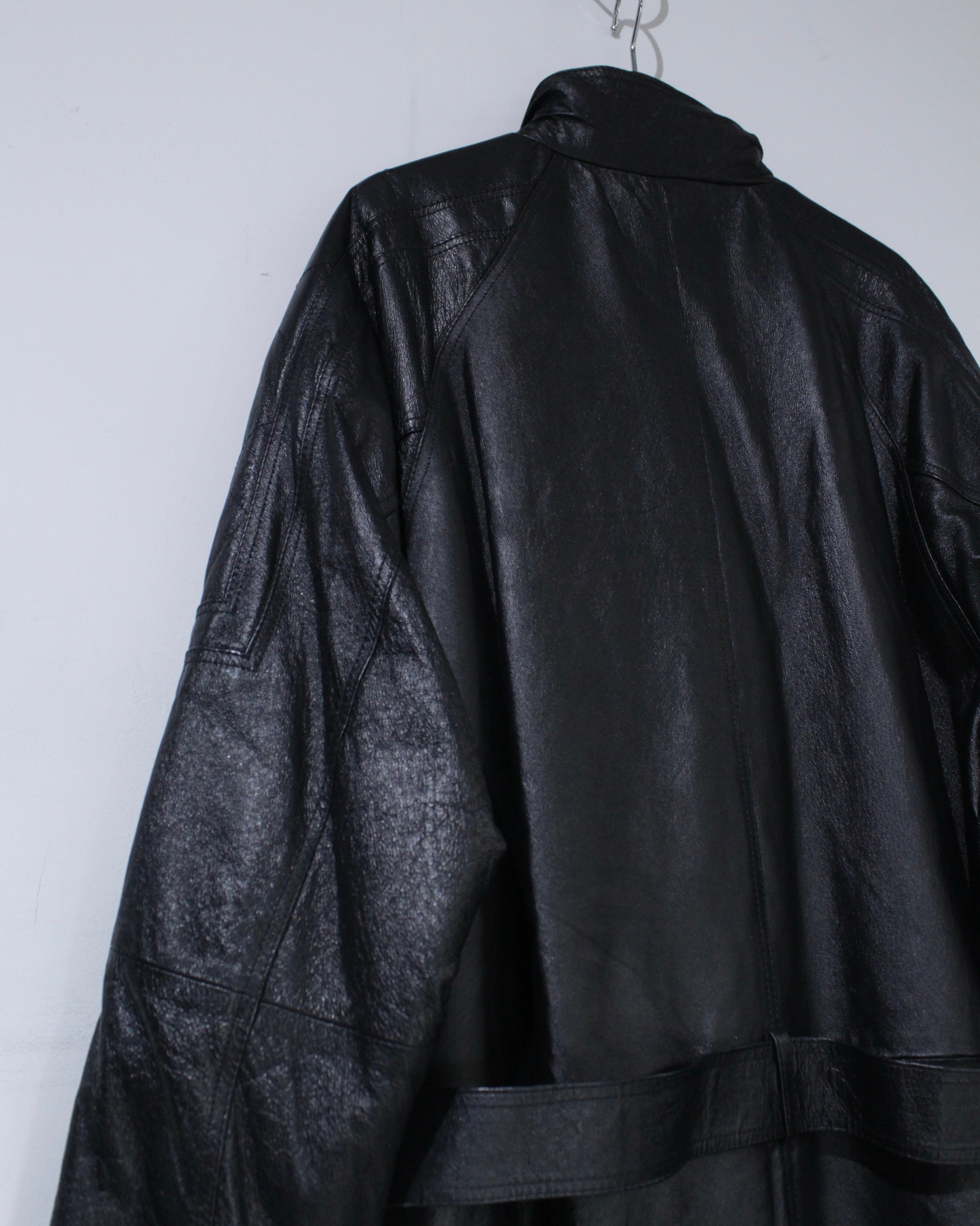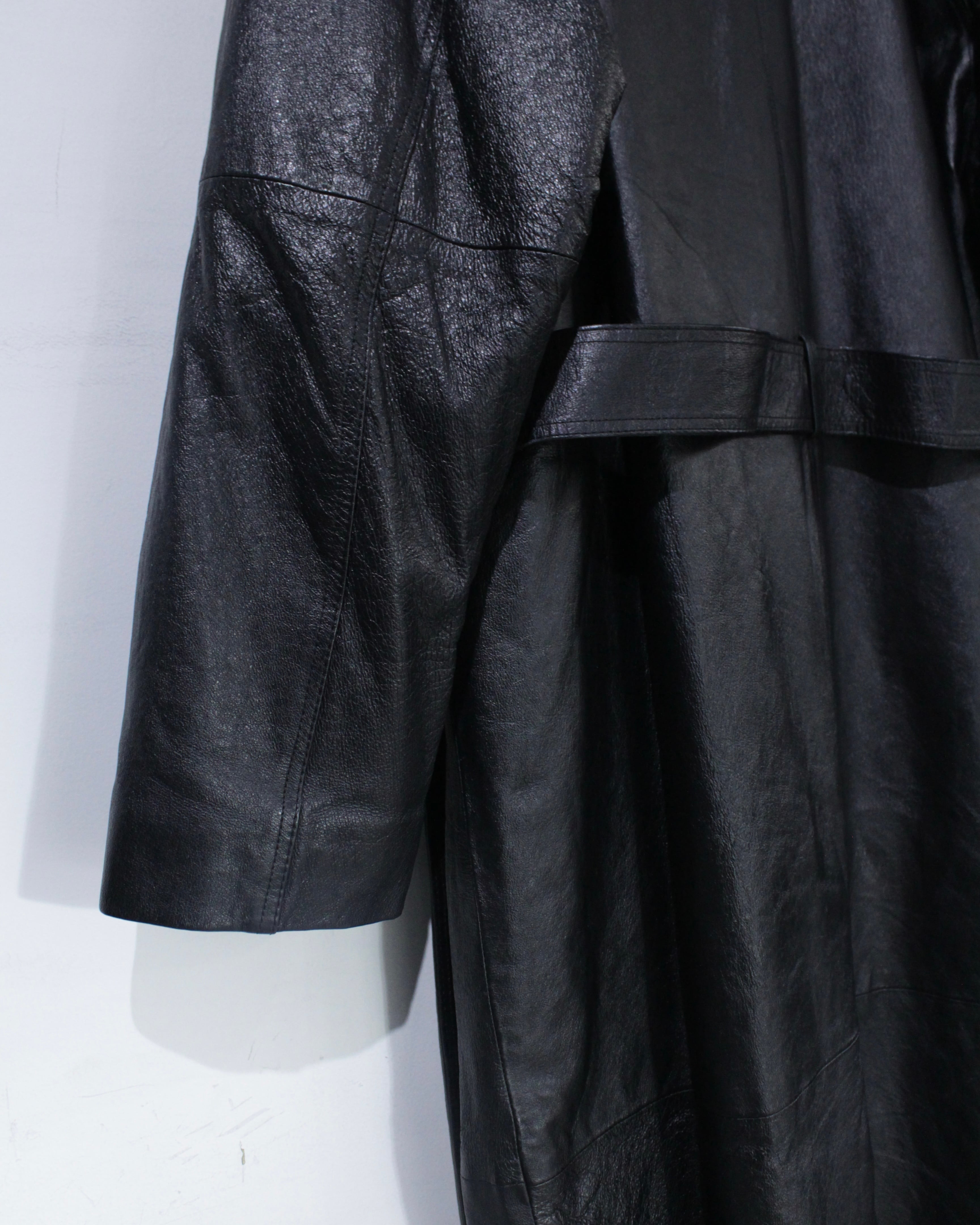しっとりとした質感のブラックレザーボディはロング丈ながら重たく見えず、縦に落ちるラインが非常に美しい、、、端正な佇まいで、レザー特有の迫力をしっかり残した仕上がりが◎